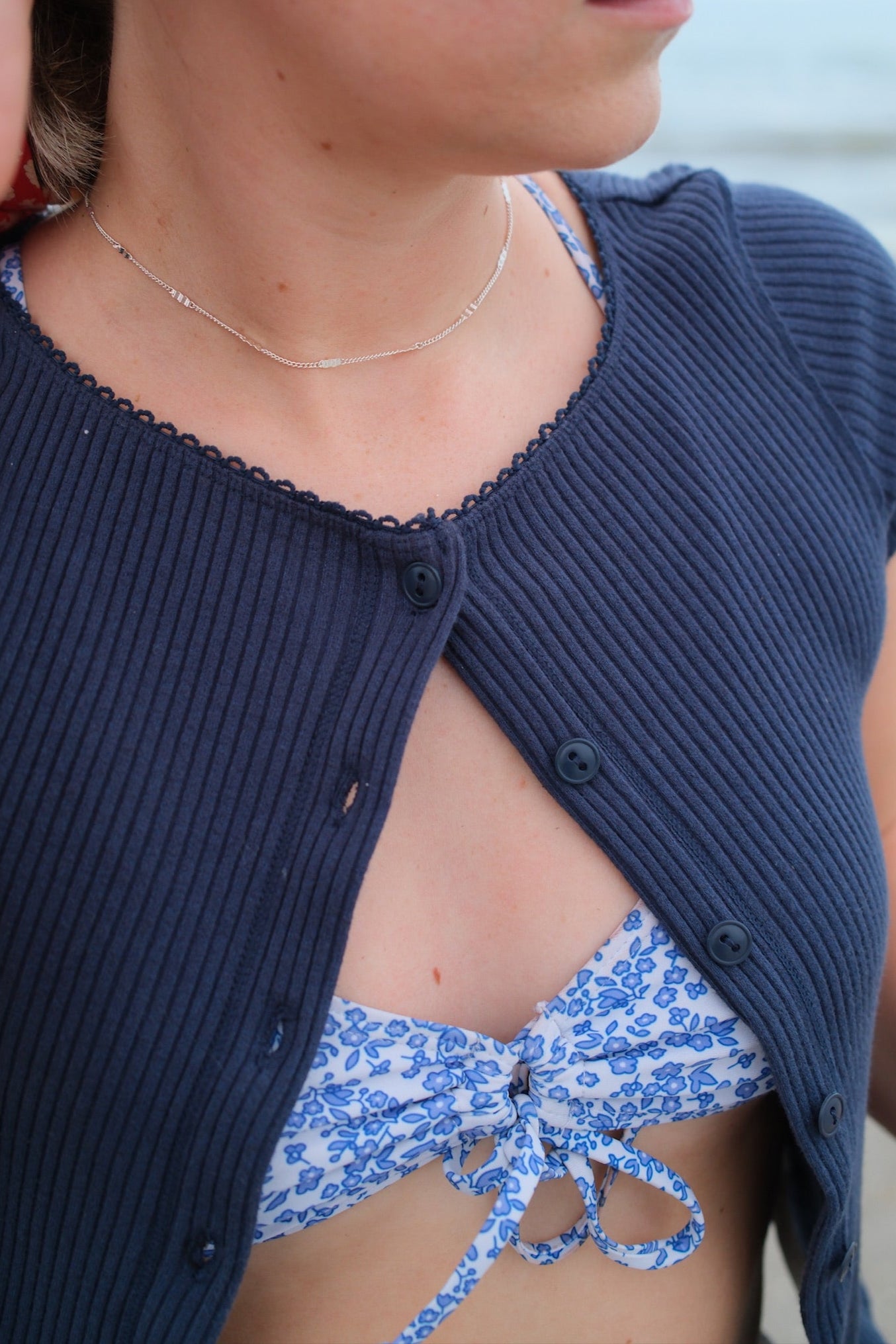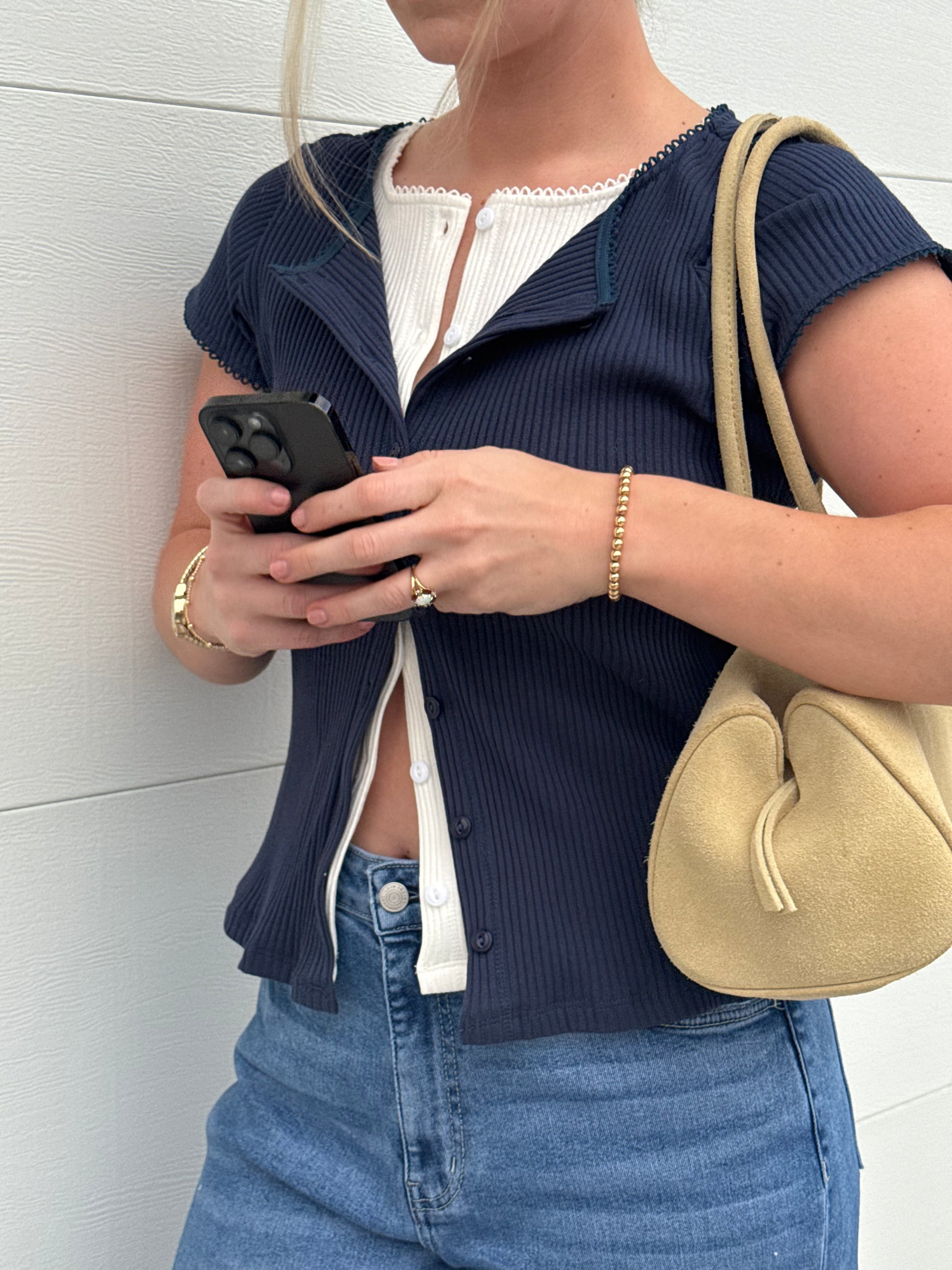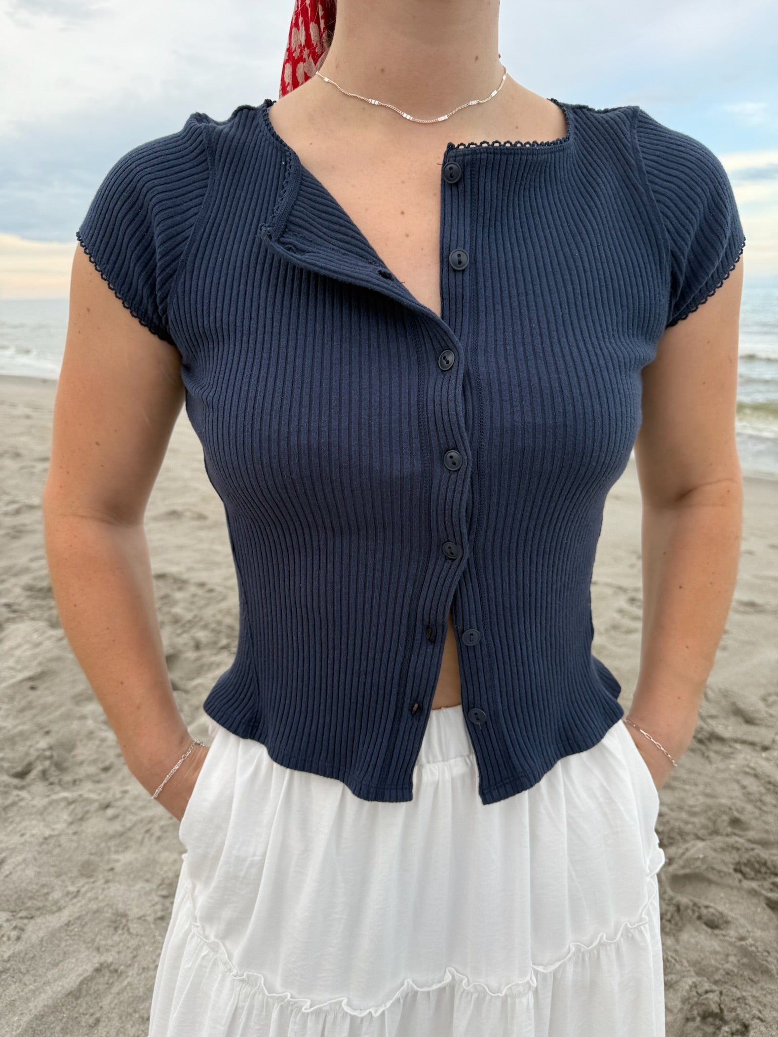 Meet your new favorite, the Beach House Tee in Pearl white! This slim-fitted, ribbed cardigan blouse with short sleeves is all about easy, breezy style. The Beach House Tee has charming scalloped edges on the neckline and sleeves, adding a fun, unique touch. Button it up for a polished look or leave it open with a bikini for laid-back vibes. Size up.