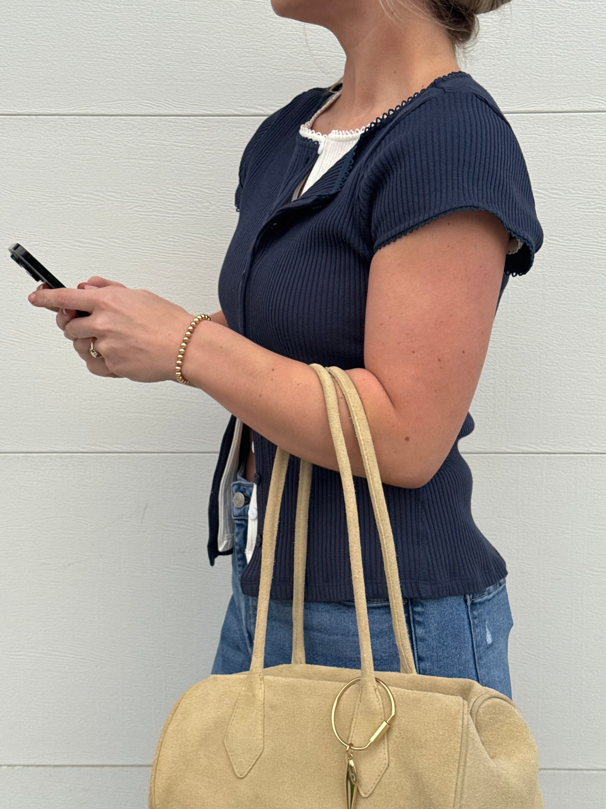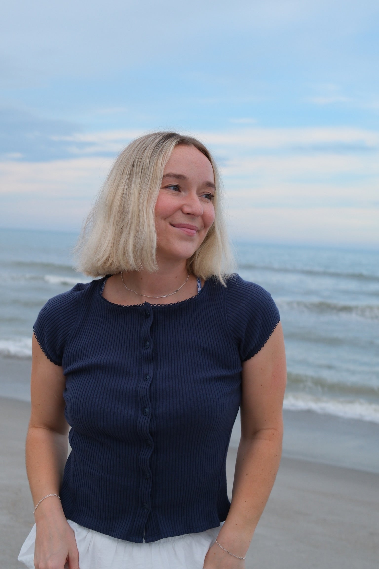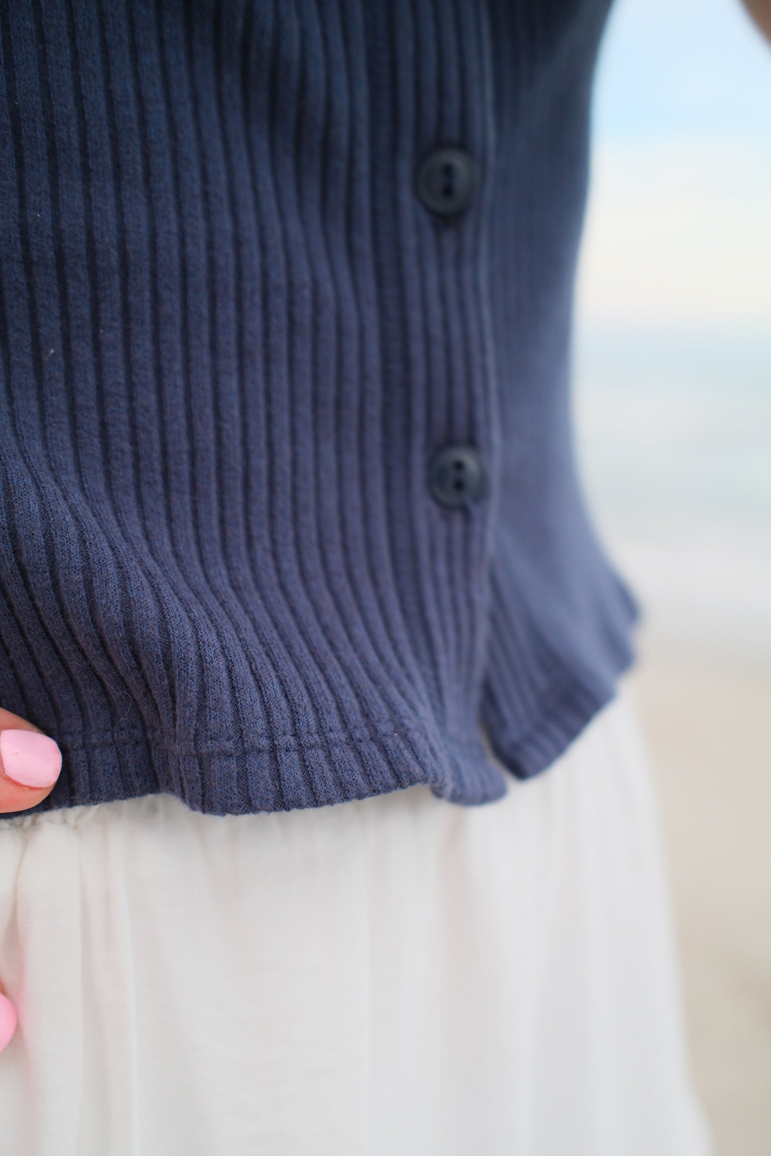 Meet your new favorite, the Beach House Tee in Pearl white! This slim-fitted, ribbed cardigan blouse with short sleeves is all about easy, breezy style. The Beach House Tee has charming scalloped edges on the neckline and sleeves, adding a fun, unique touch. Button it up for a polished look or leave it open with a bikini for laid-back vibes. Size up.