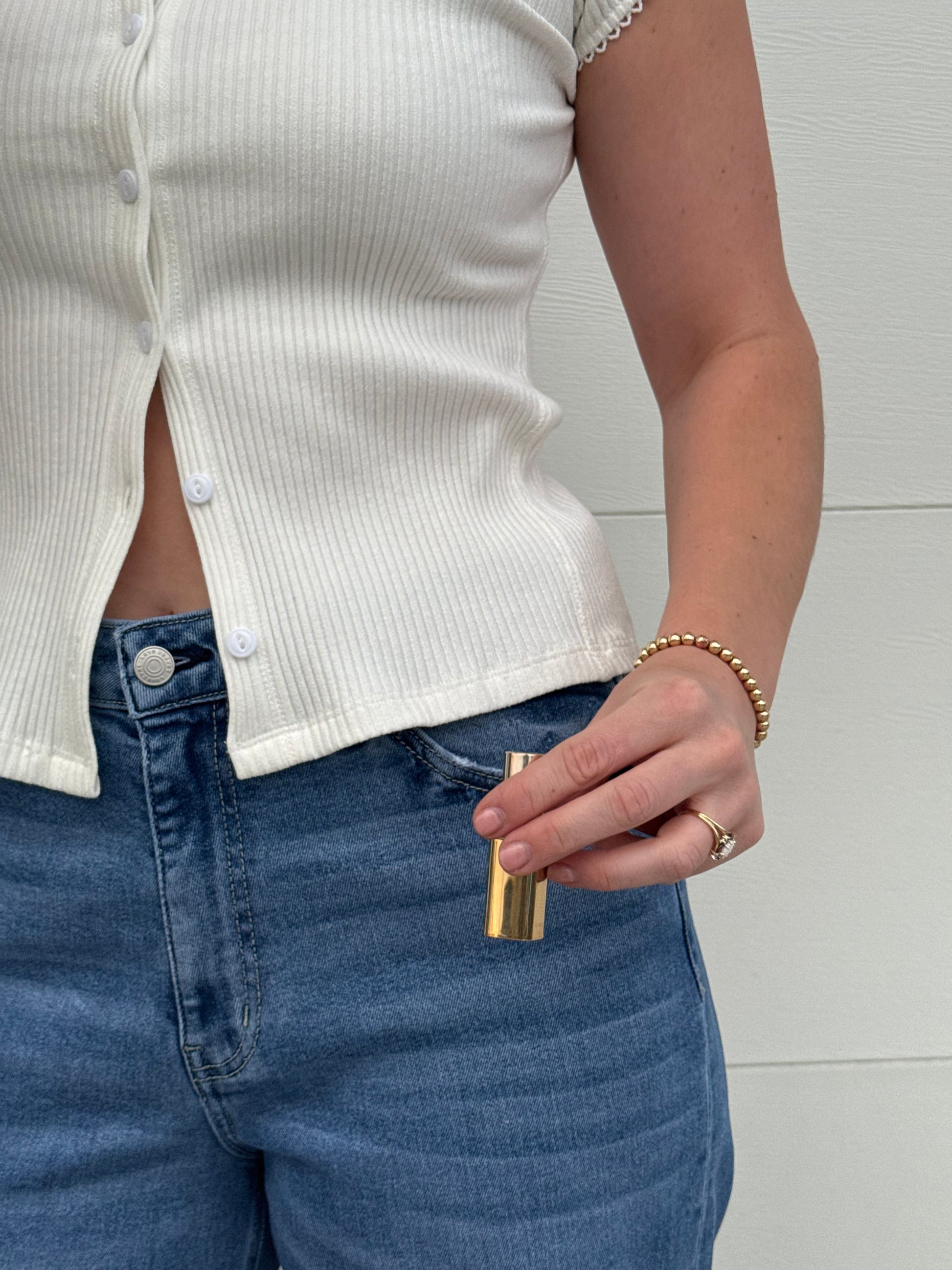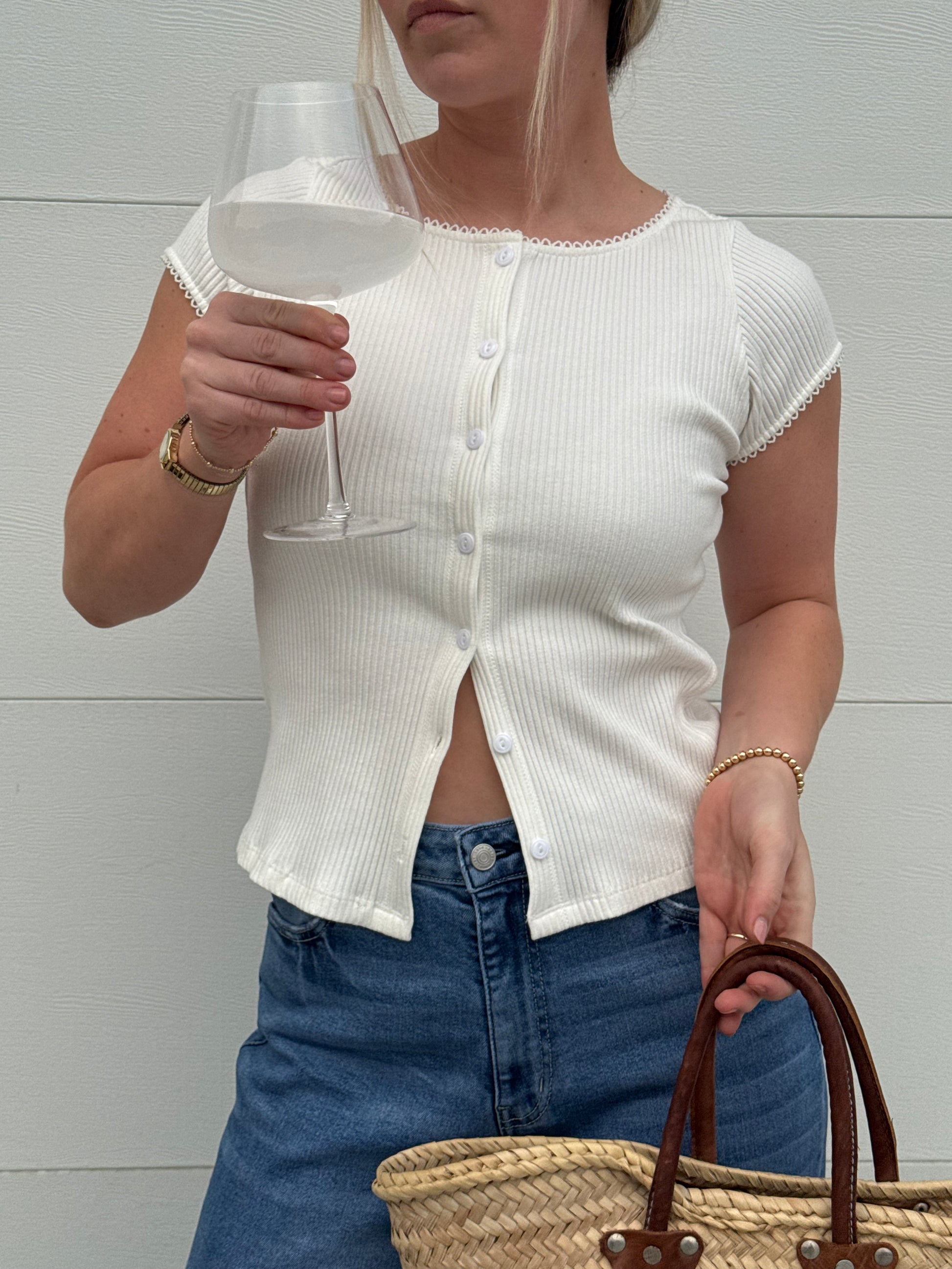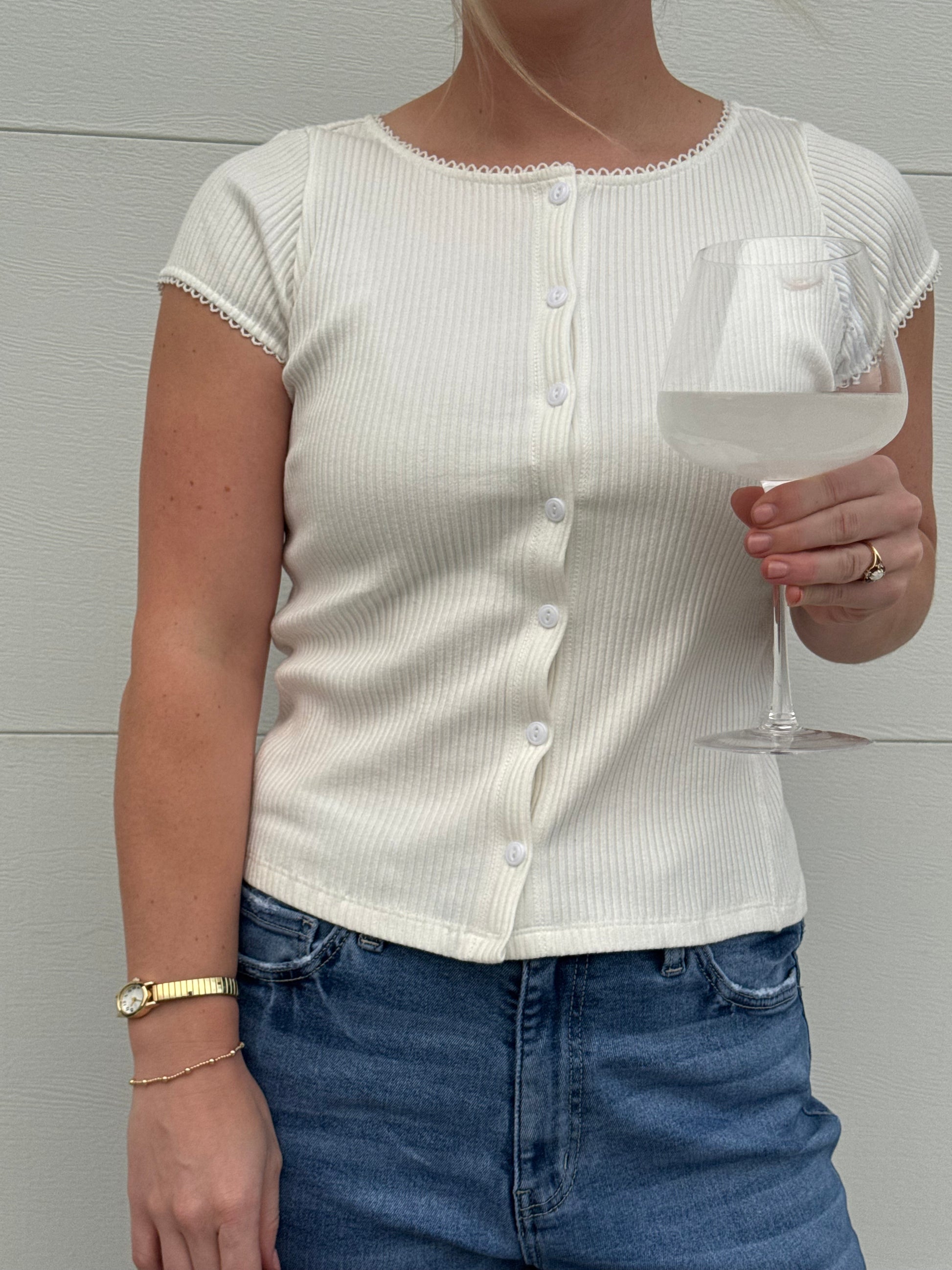 Meet your new favorite, the Beach House Tee in Pearl white! This slim-fitted, ribbed cardigan blouse with short sleeves is all about easy, breezy style. The Beach House Tee has charming scalloped edges on the neckline and sleeves, adding a fun, unique touch. Button it up for a polished look or leave it open with a bikini for laid-back vibes. Size up.