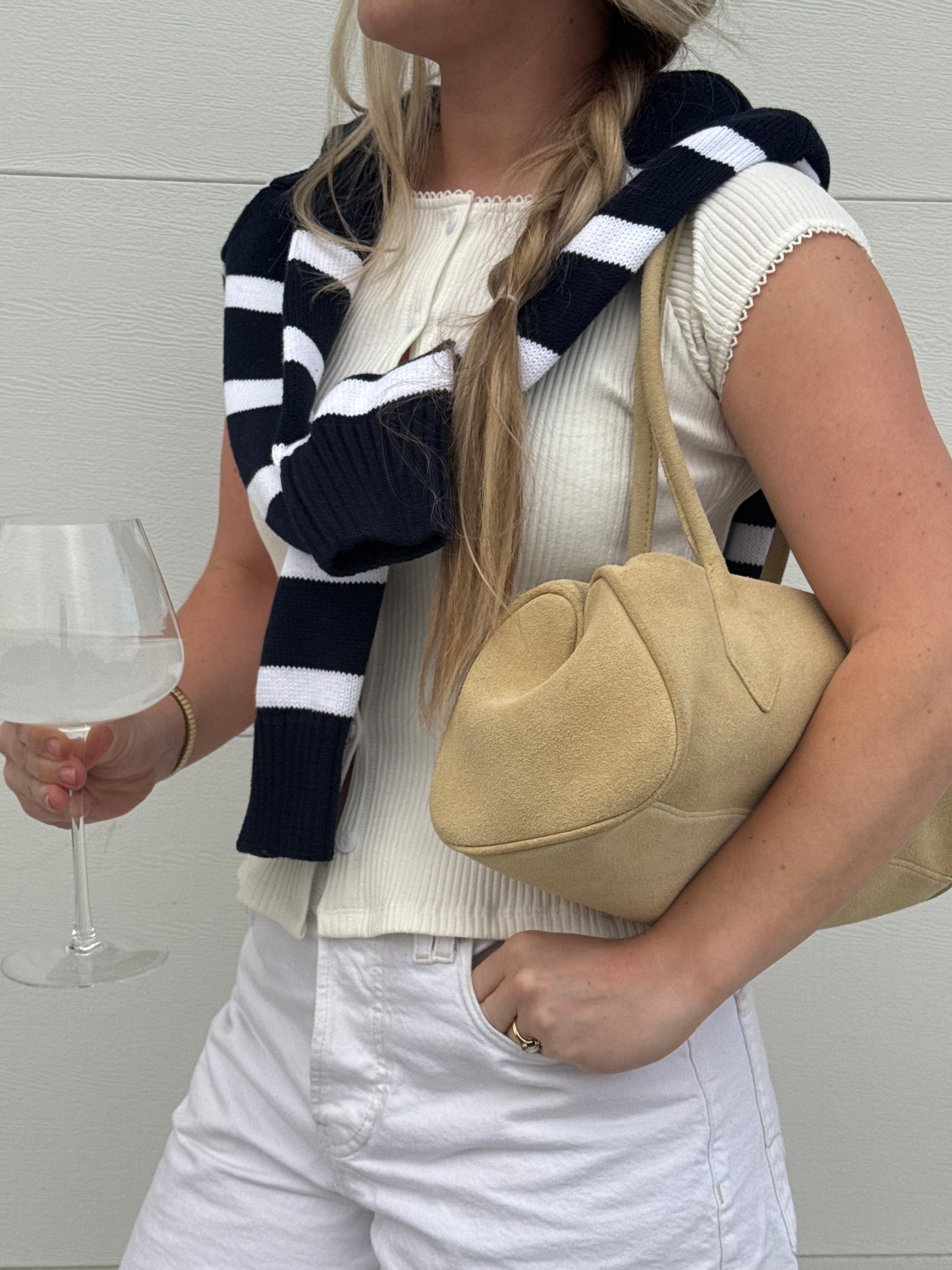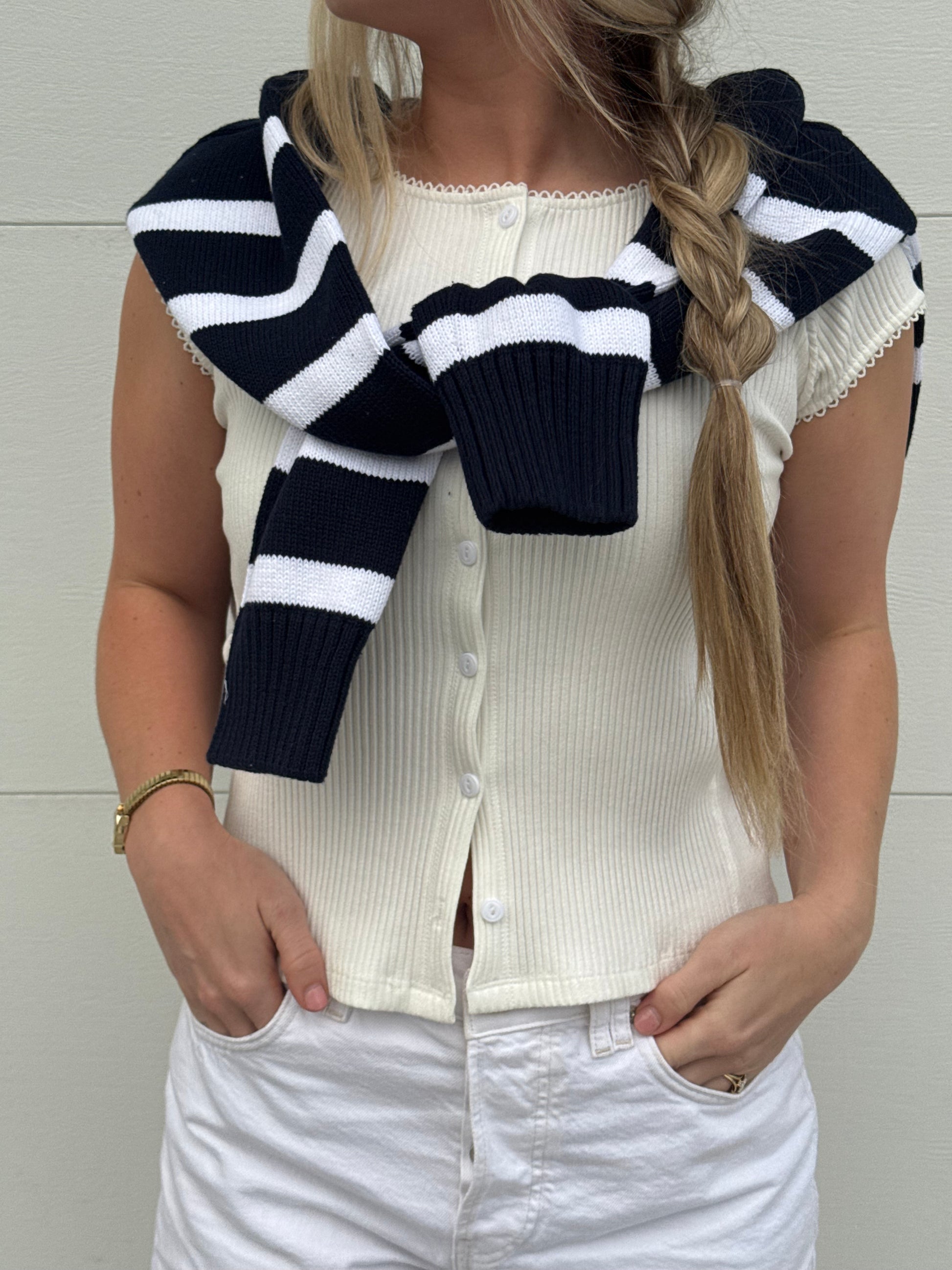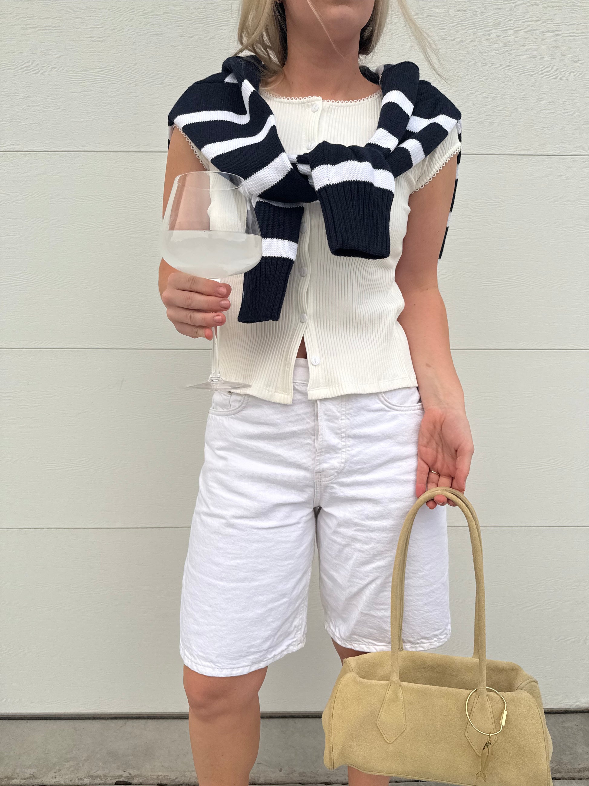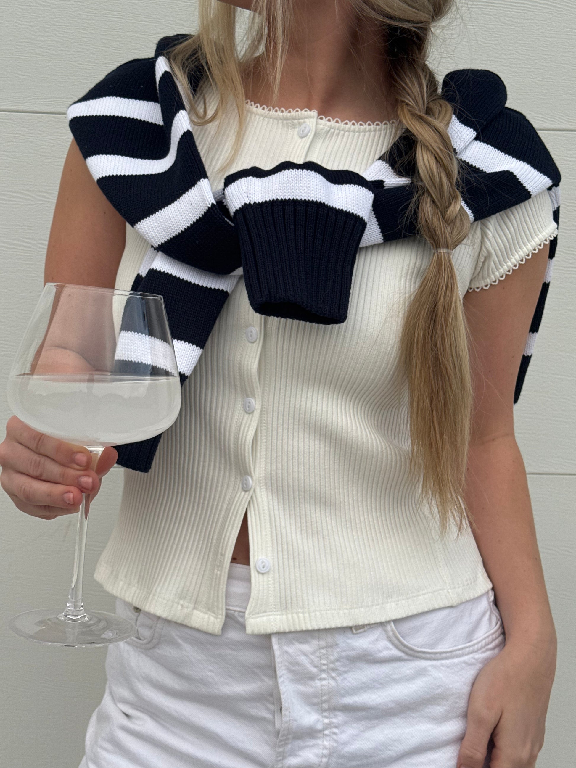 Meet your new favorite, the Beach House Tee in Pearl white! This slim-fitted, ribbed cardigan blouse with short sleeves is all about easy, breezy style. The Beach House Tee has charming scalloped edges on the neckline and sleeves, adding a fun, unique touch. Button it up for a polished look or leave it open with a bikini for laid-back vibes. Size up.