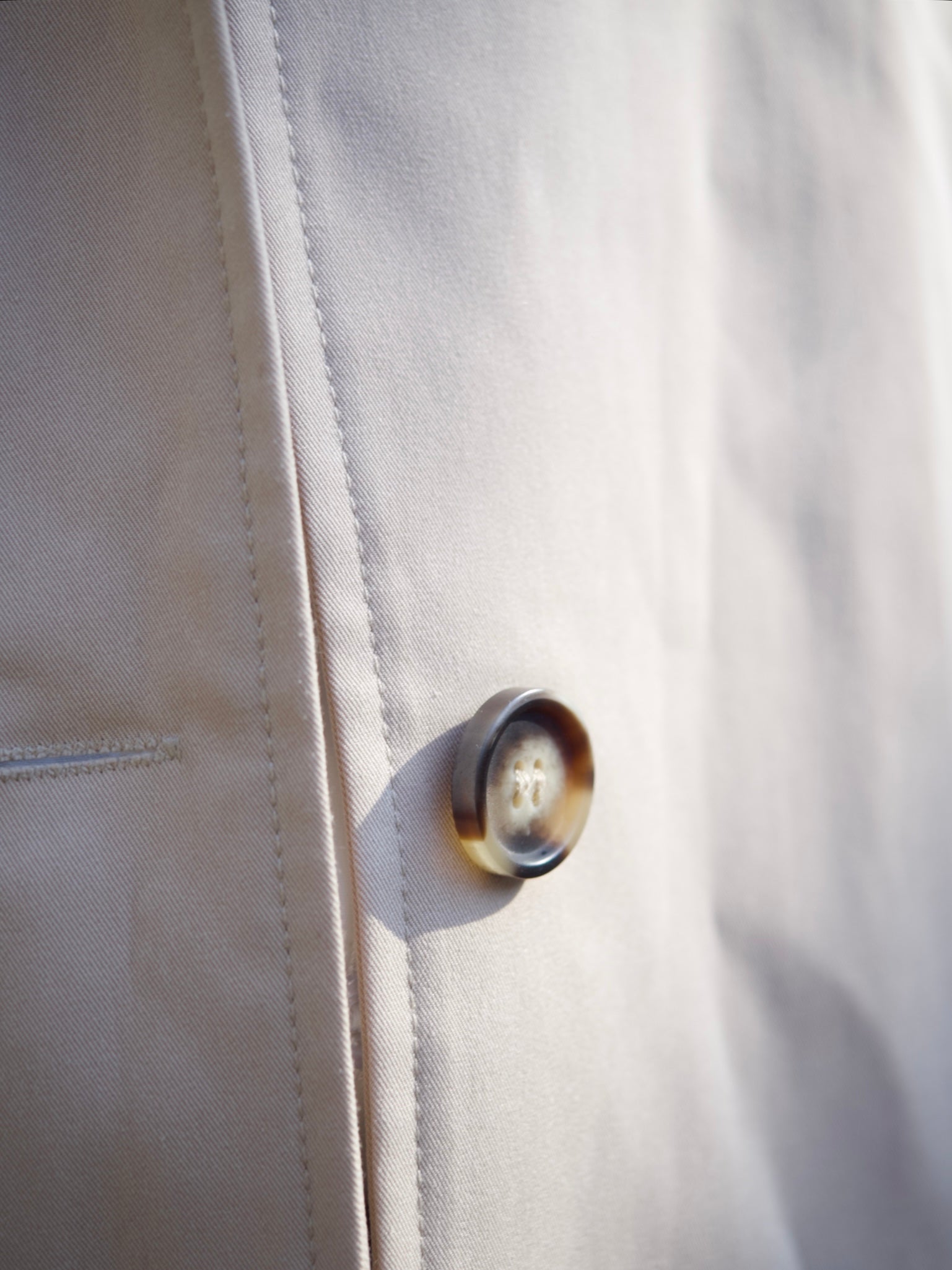 The Cafe Trench Coat is a beautiful beige coat anchored by distinctive tortoise shell buttons that add warmth and character. Fully lined in charming black and white gingham. Reveal the playful checked pattern by cuffing the sleeves! The generous length and structured silhouette provide timeless sophistication, while the hidden gingham lining offers a touch of understated personality.