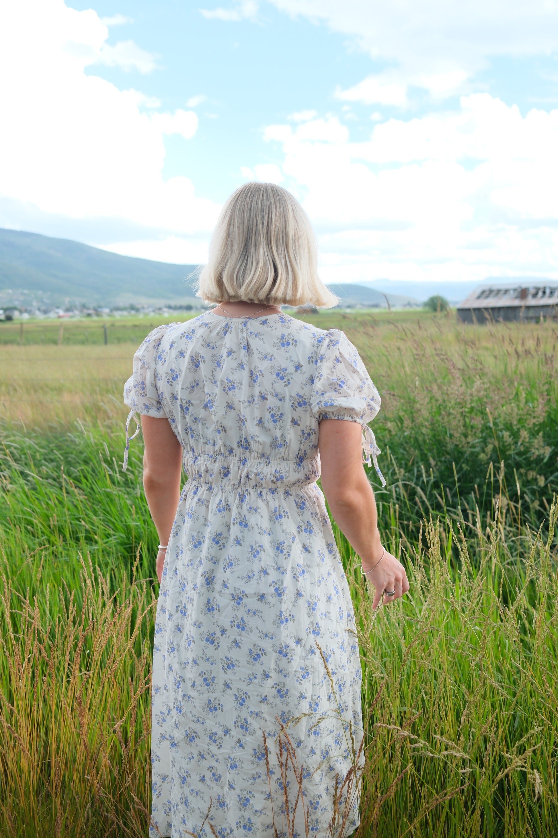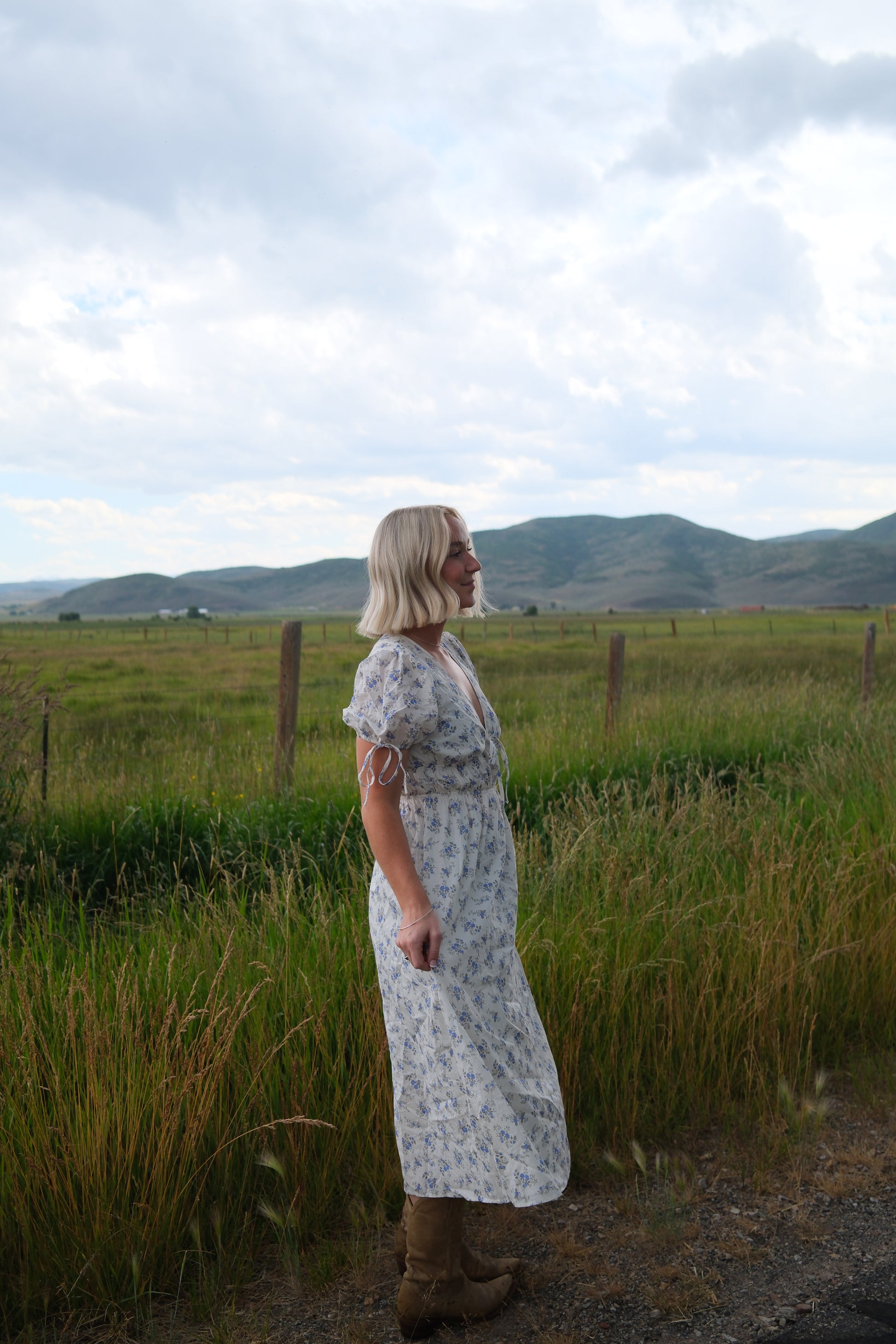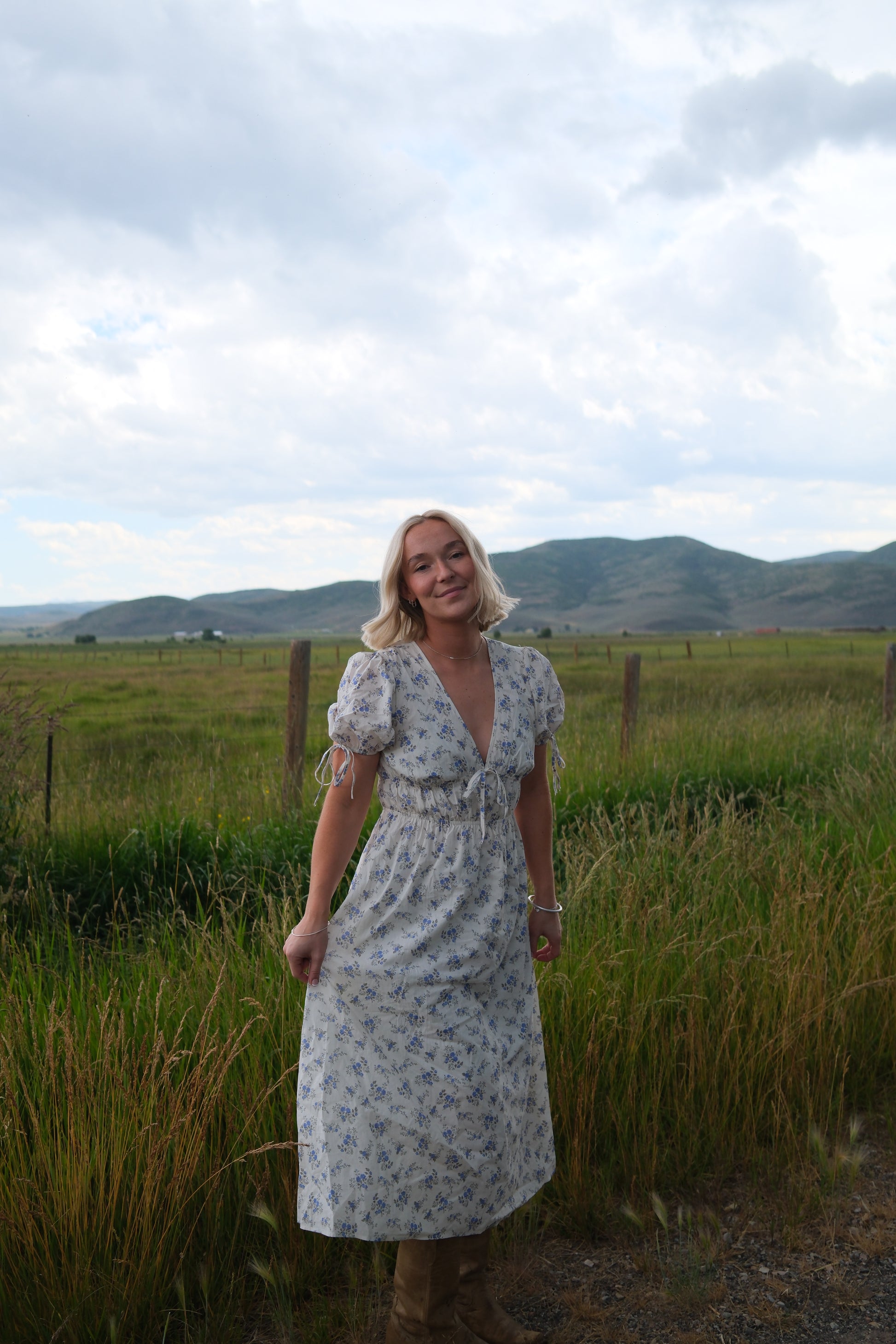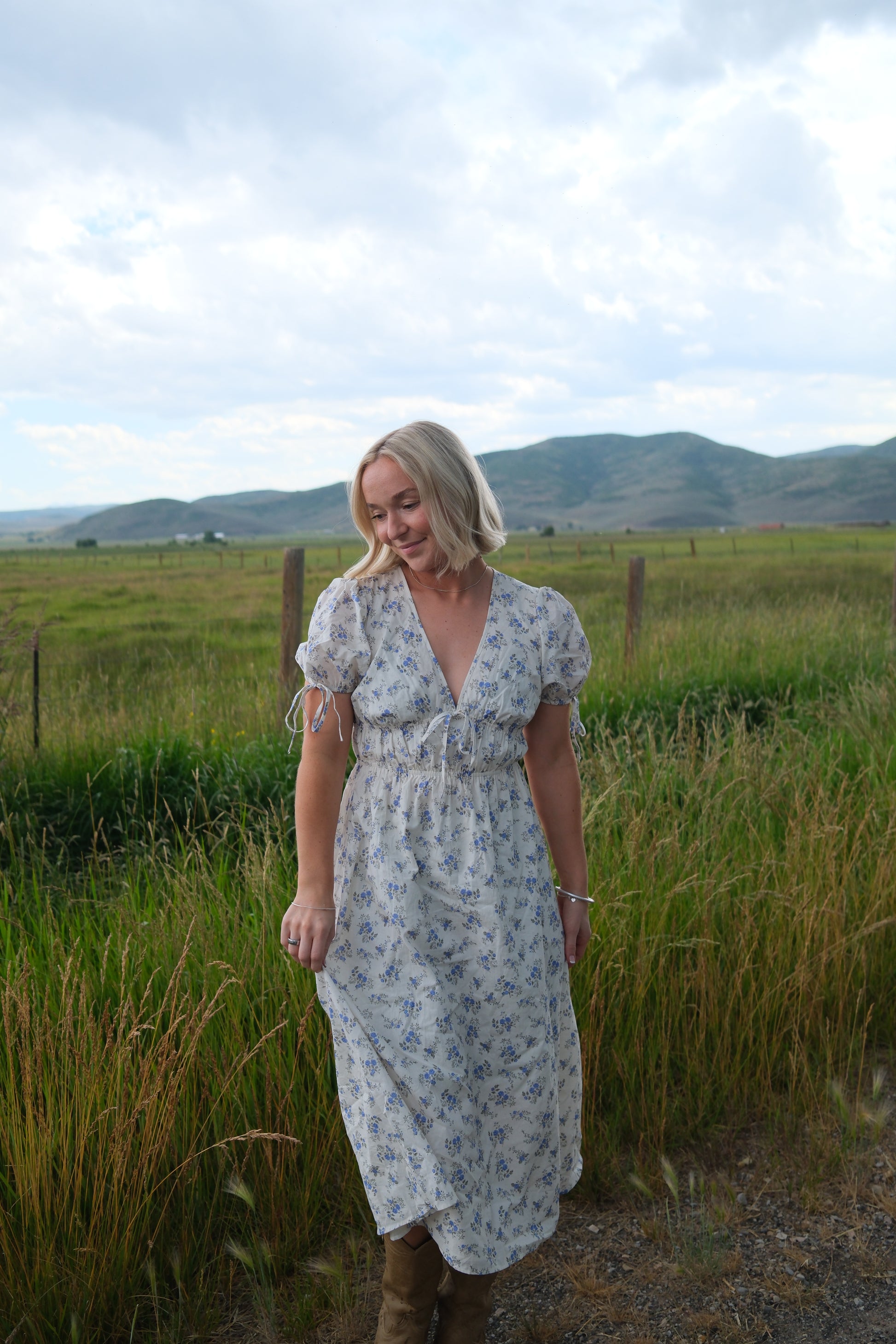 A stunning white dress adorned with beautiful blue and green florals. Its elegant v-neck and charming puff sleeves are accentuated by delicate bows on the sleeves and neckline. This dress will make you feel effortlessly chic and feminine.