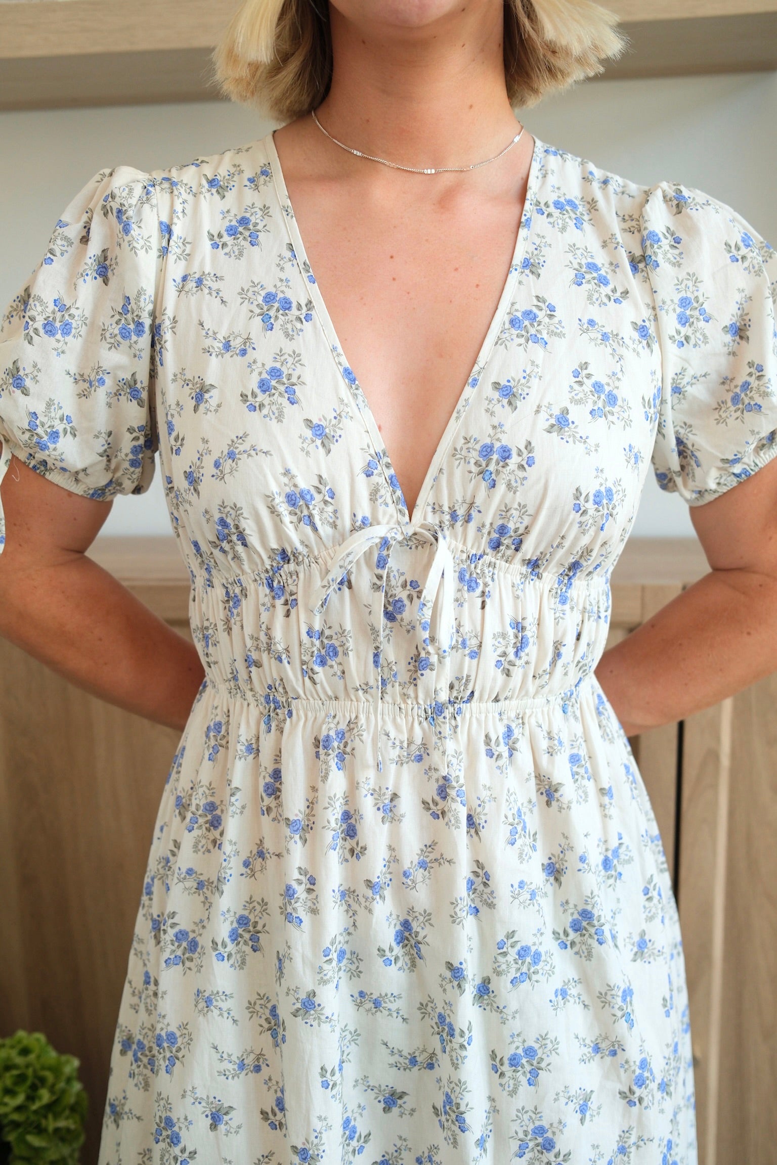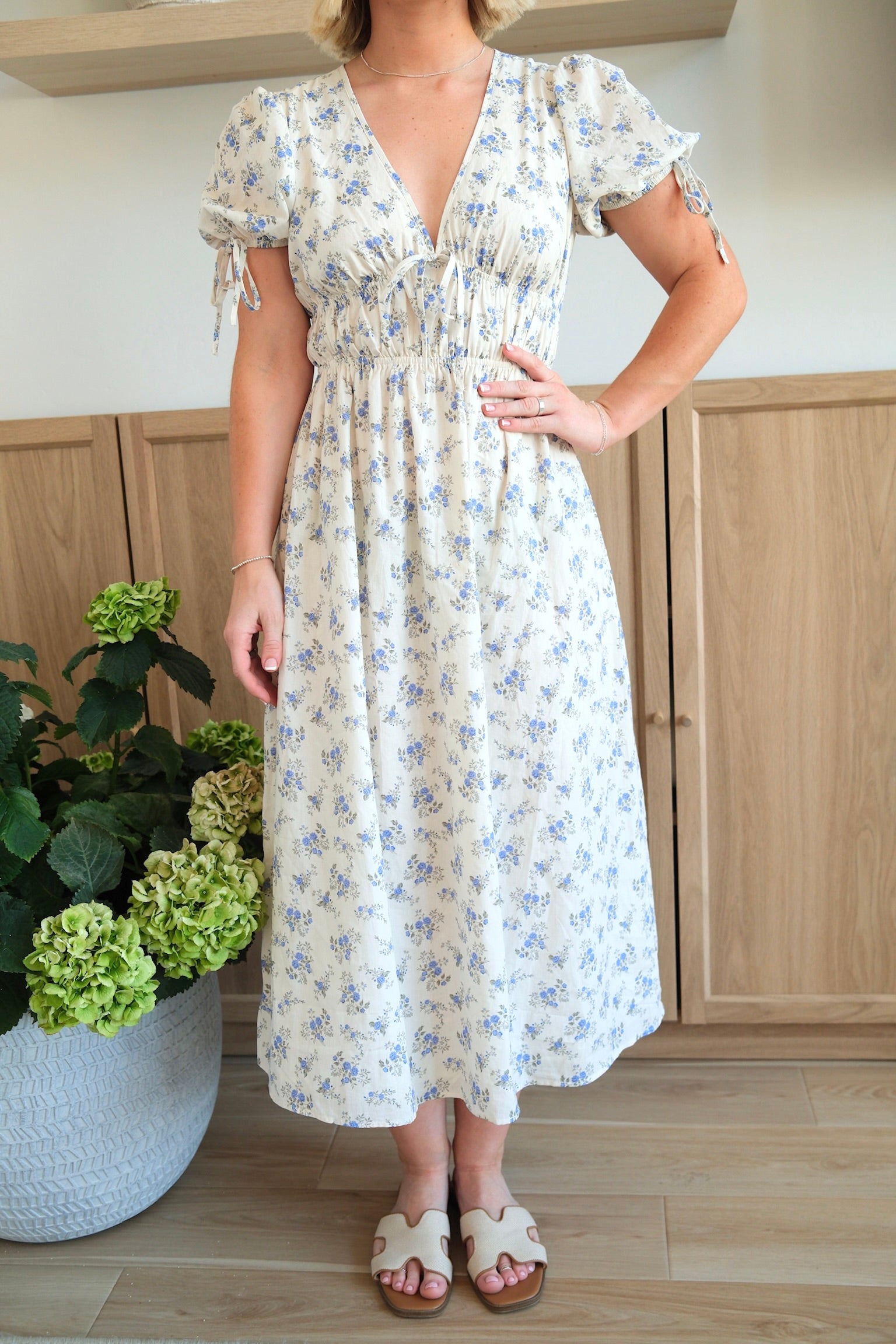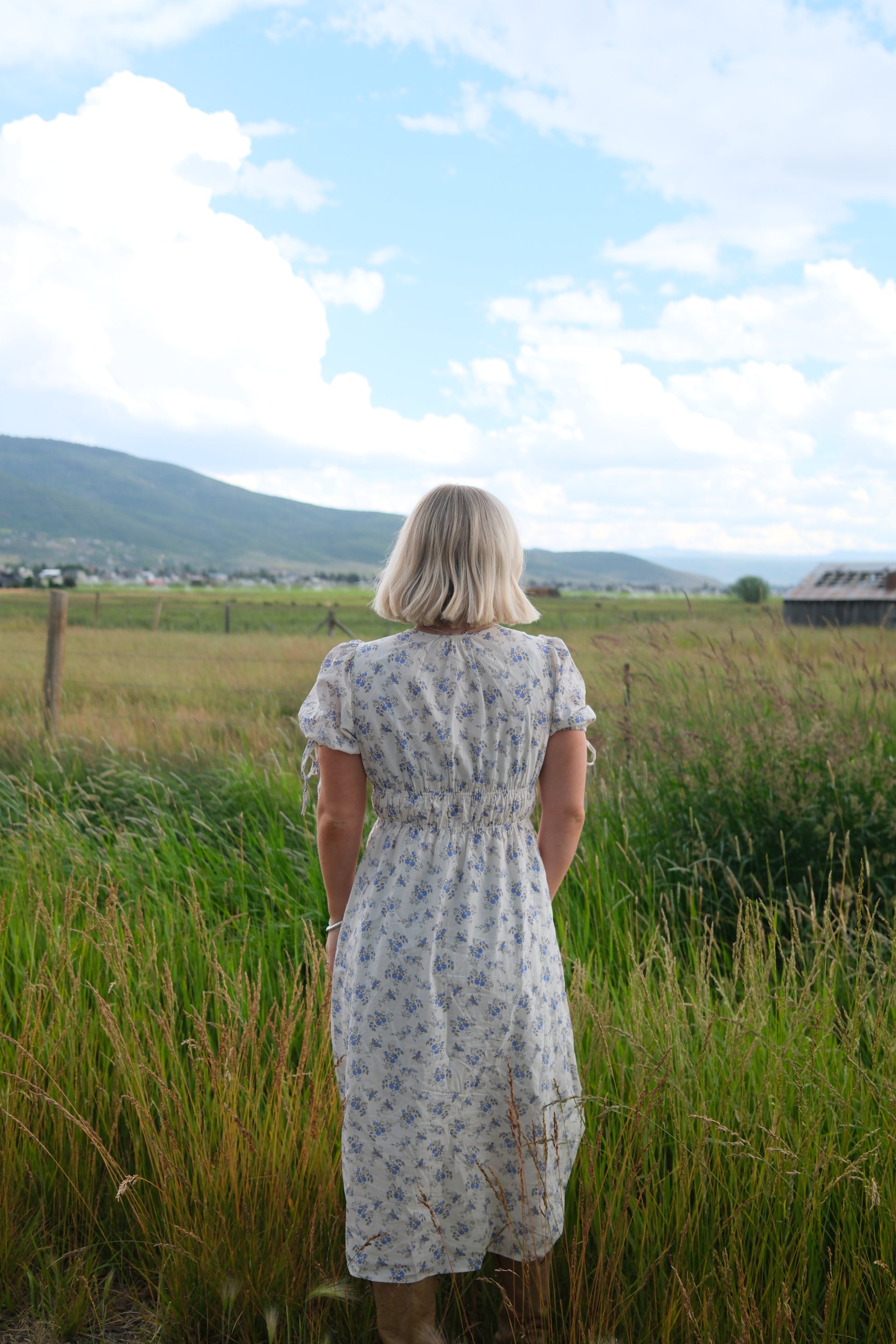 A stunning white dress adorned with beautiful blue and green florals. Its elegant v-neck and charming puff sleeves are accentuated by delicate bows on the sleeves and neckline. This dress will make you feel effortlessly chic and feminine.