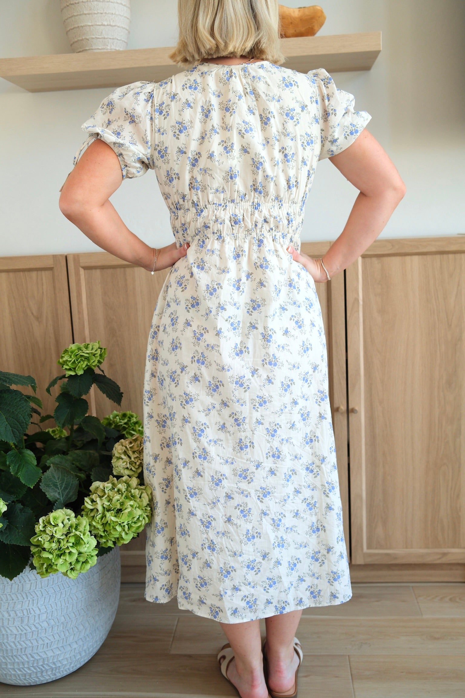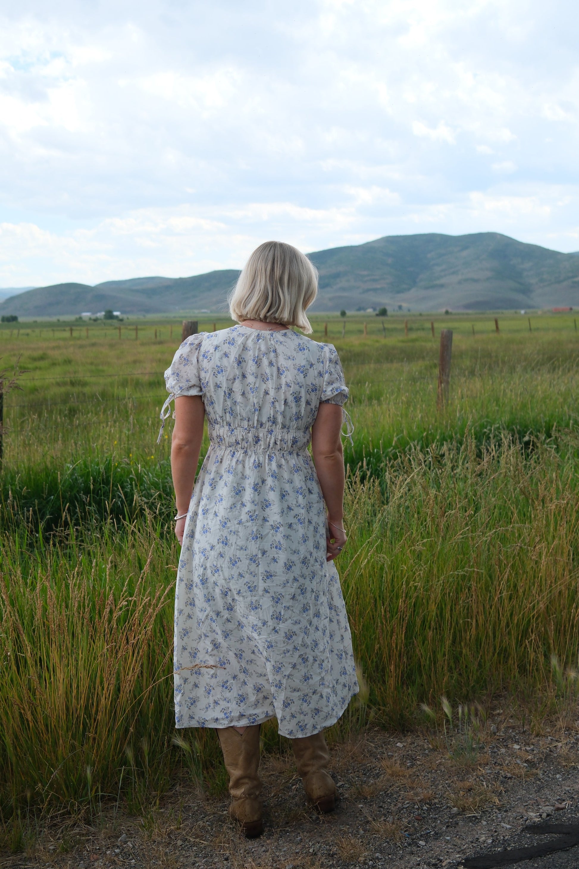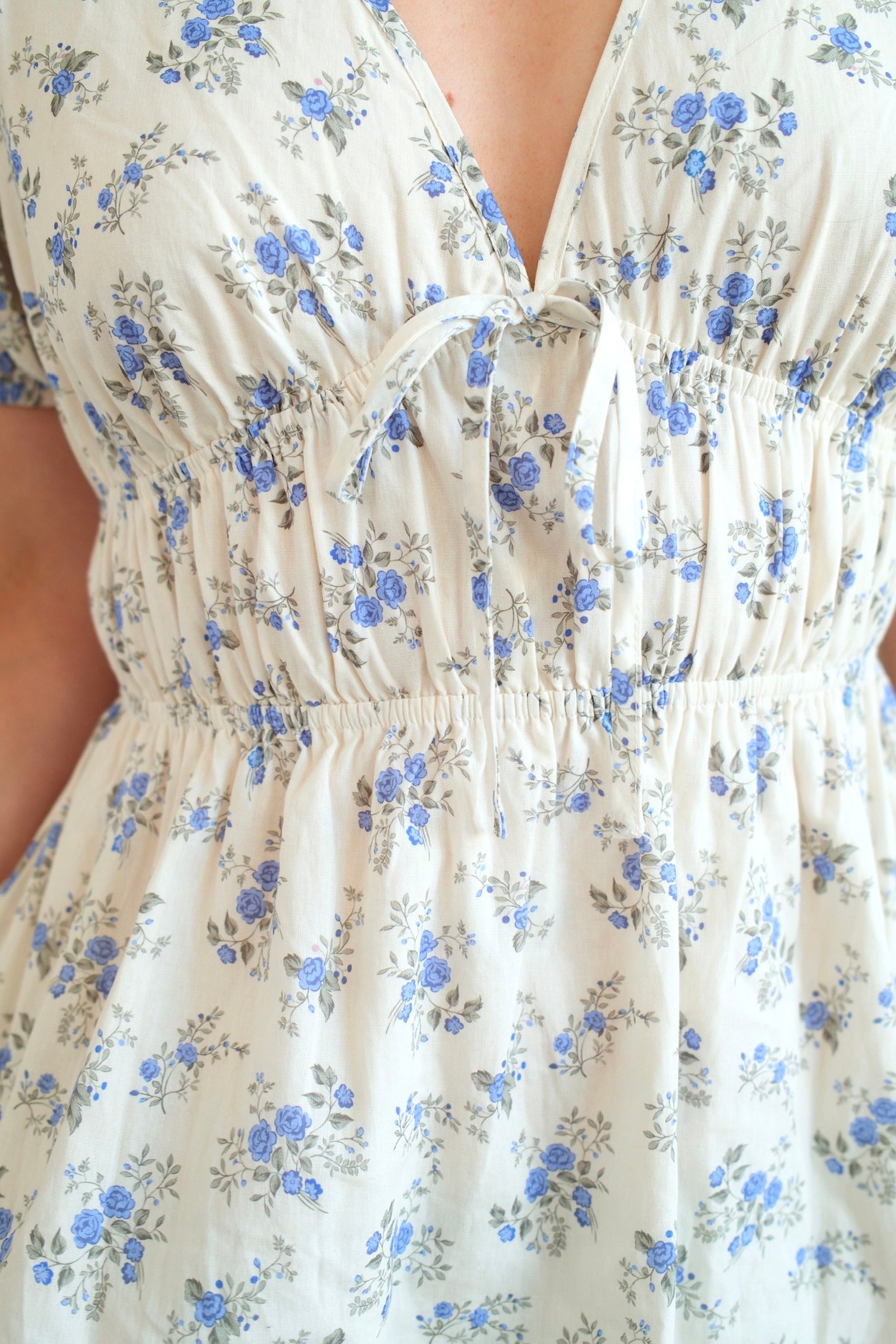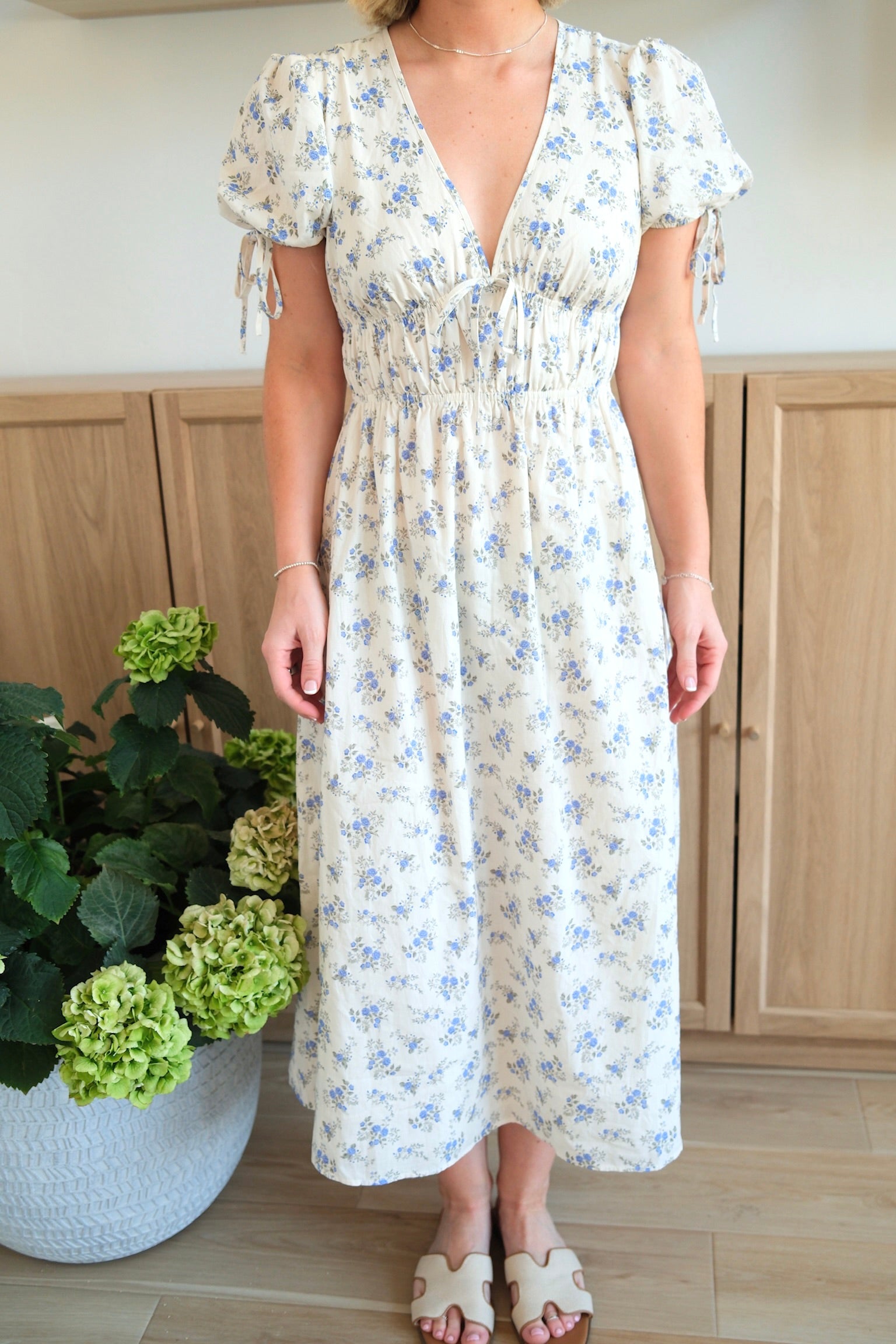 A stunning white dress adorned with beautiful blue and green florals. Its elegant v-neck and charming puff sleeves are accentuated by delicate bows on the sleeves and neckline. This dress will make you feel effortlessly chic and feminine.