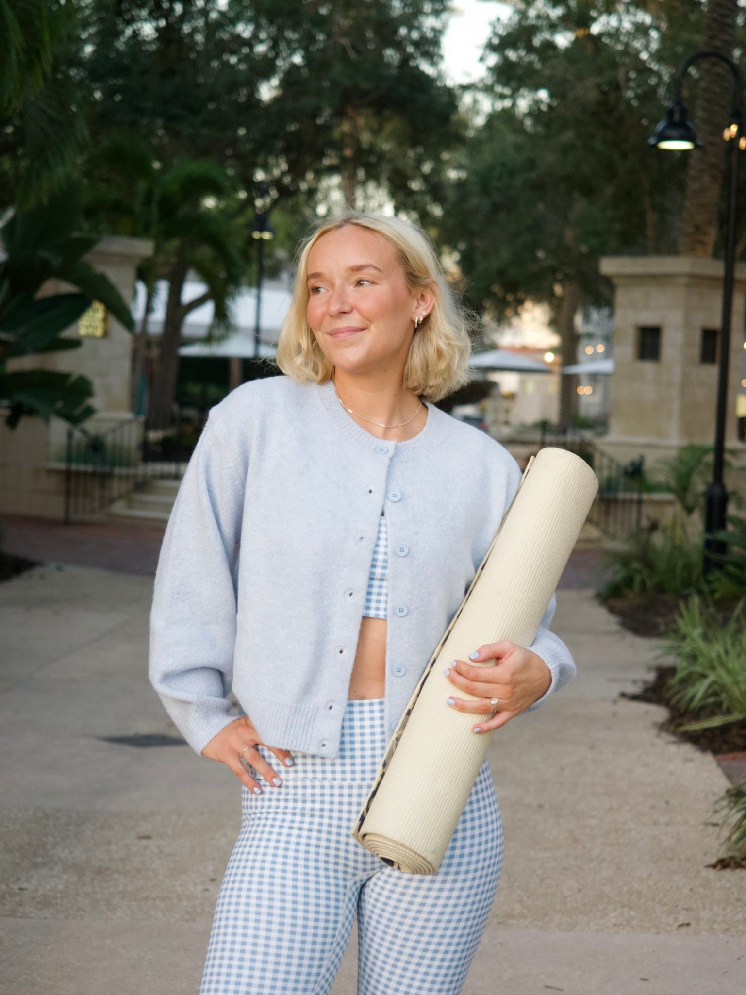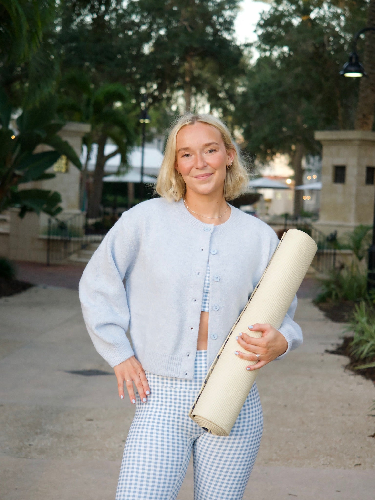 This knit button-up cardigan offers the perfect layering option, designed to complement the gingham girl set flawlessly. The blues are a perfect match! Crafted for comfort and style, its relaxed silhouette and soft knit make it an essential addition to your everyday wardrobe.
