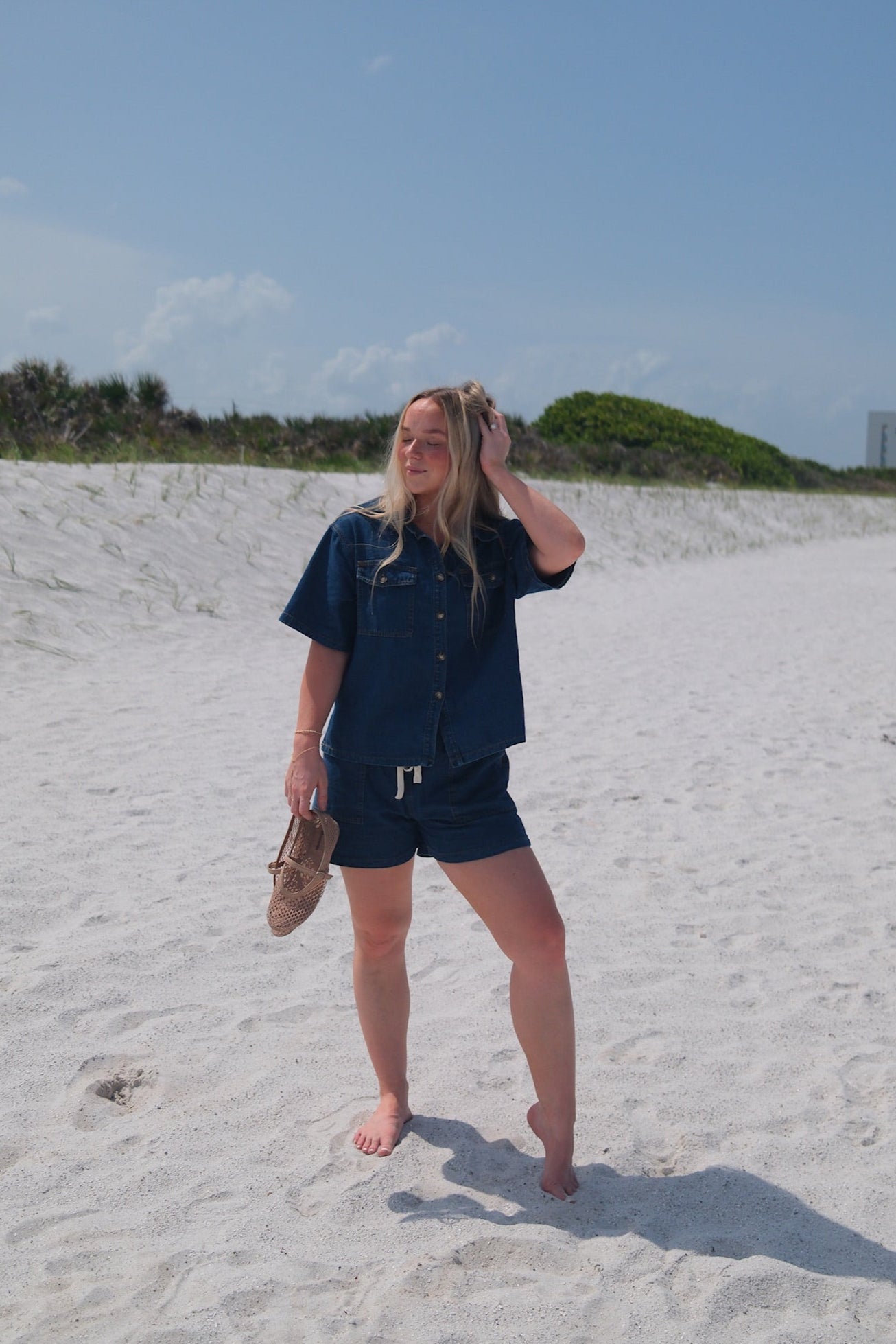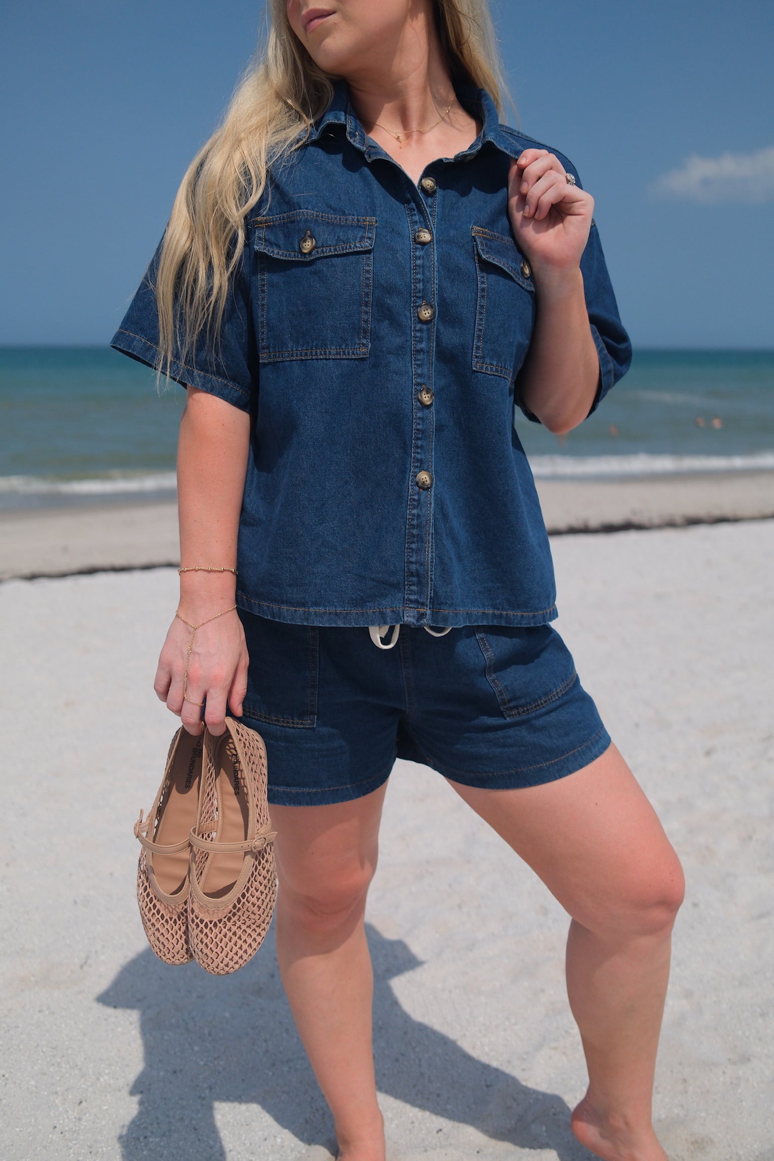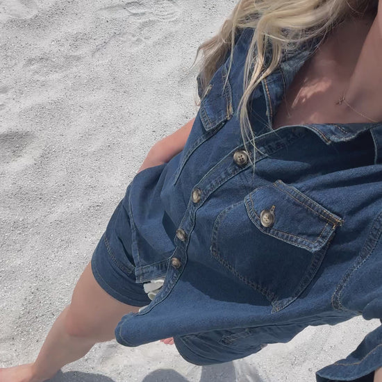 The Driftwood Set presents a lightweight, denim-inspired matching outfit featuring a button-up short sleeve shirt and coordinating shorts with a faux drawstring. Crafted for breathability and ease, this set delivers a polished yet relaxed aesthetic, ideal for warm-weather dressing with a sophisticated edge. Fits small, size up. Wash separately.