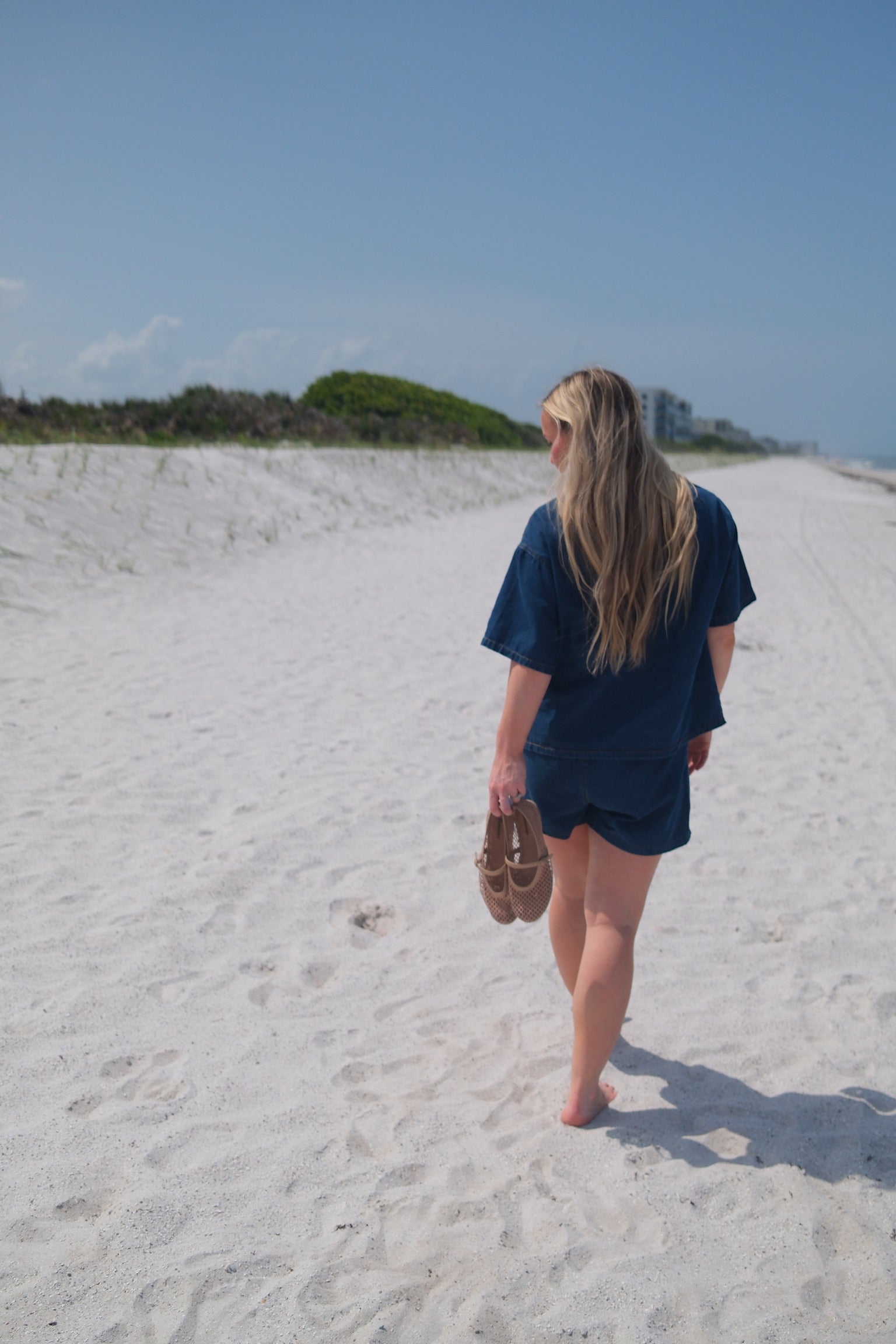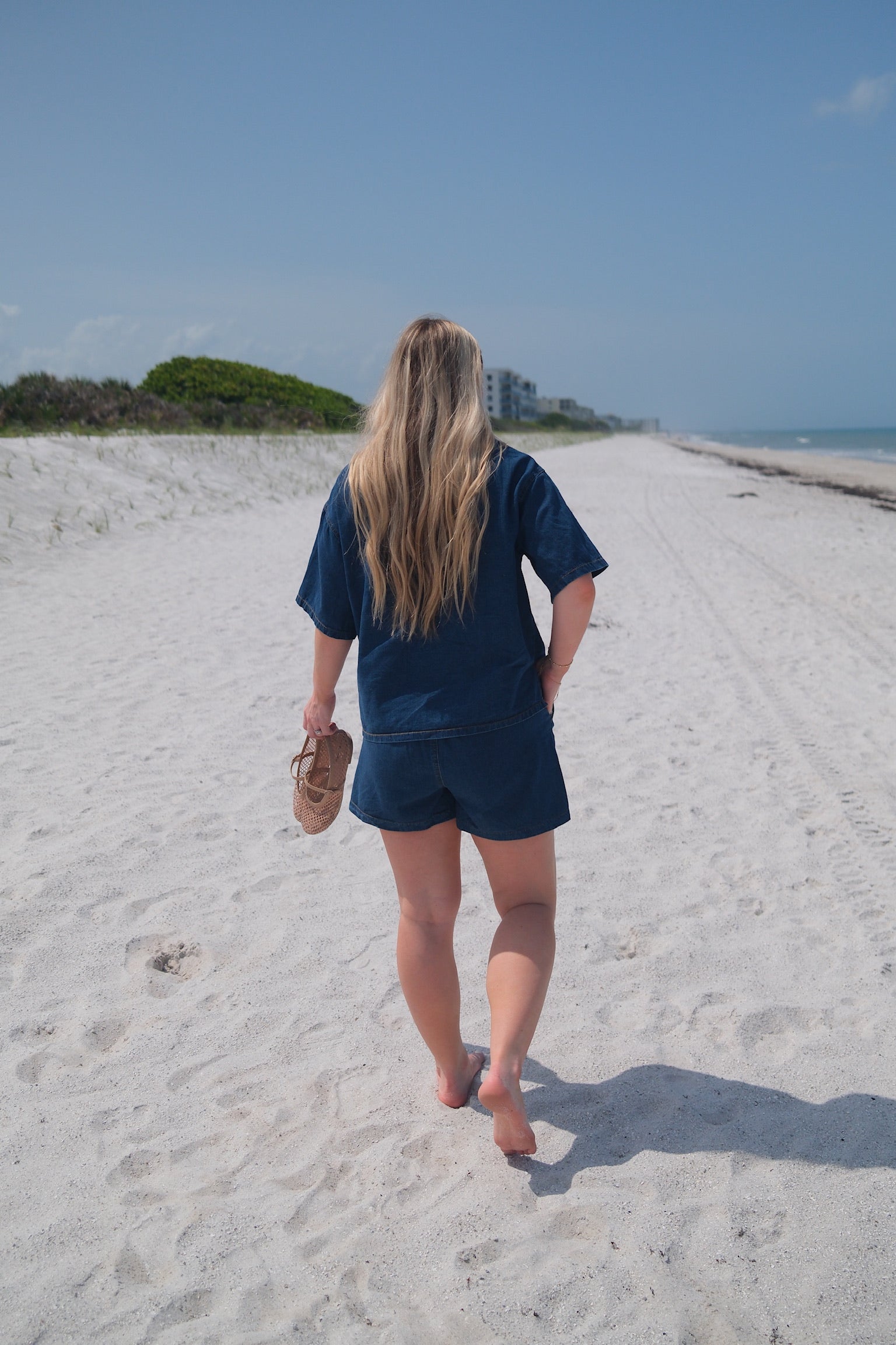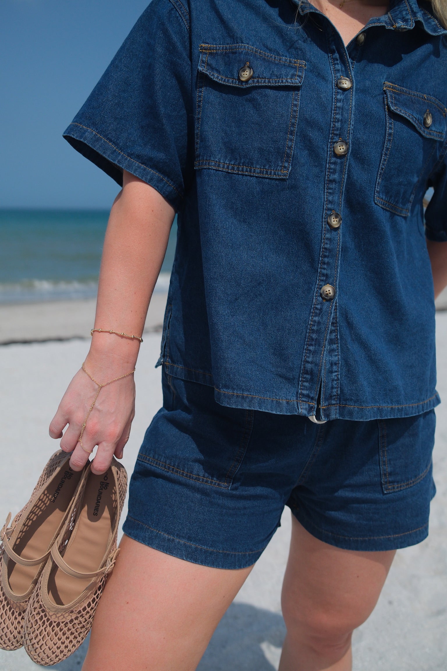 The Driftwood Set presents a lightweight, denim-inspired matching outfit featuring a button-up short sleeve shirt and coordinating shorts with a faux drawstring. Crafted for breathability and ease, this set delivers a polished yet relaxed aesthetic, ideal for warm-weather dressing with a sophisticated edge. Fits small, size up. Wash separately.