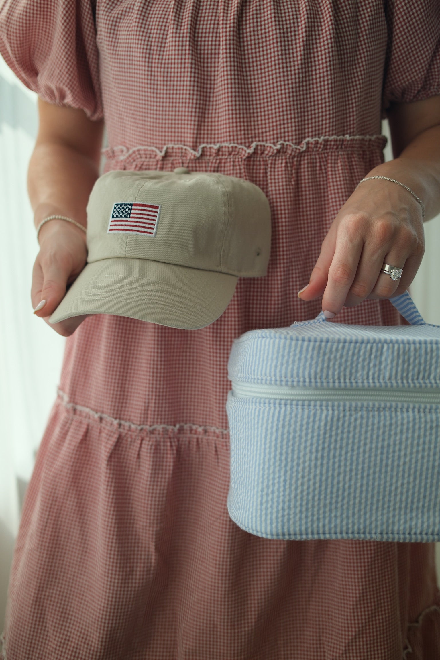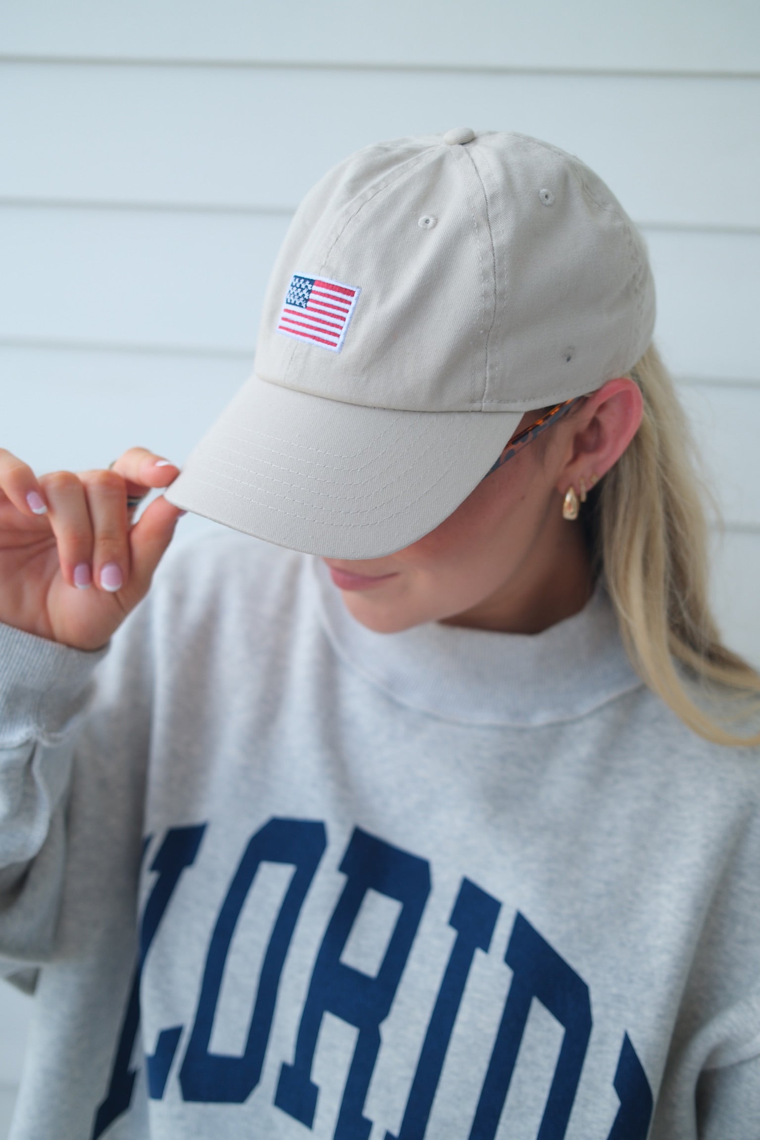 This classic design features a flag motif, while the neutral color makes it versatile for any outfit. Keep the sun out of your eyes and make a statement with this cute cap.