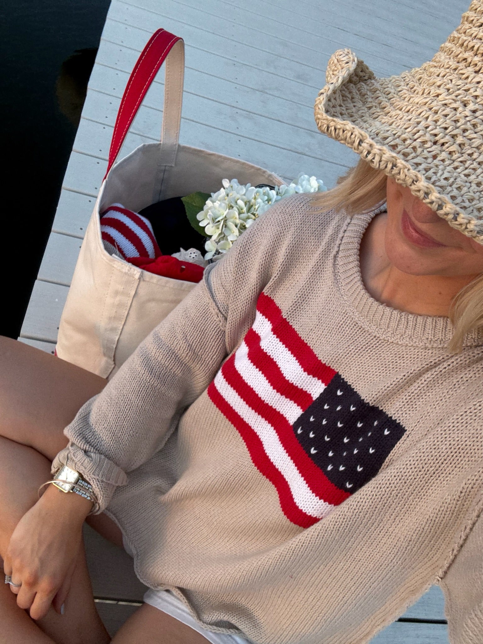 Introducing the Flagship Sweater, proudly showcasing the American flag in a lightweight knit. Perfect for a beach evening or elevating a casual look. This high quality, timeless sweater exudes coastal class.
