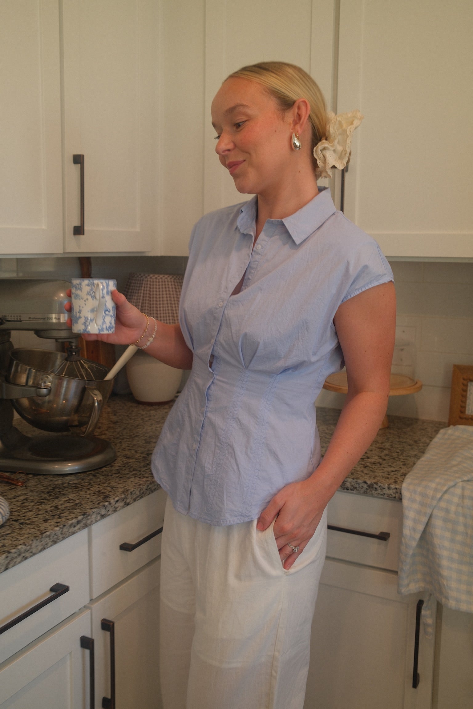 This Frosted Harbor blouse is both classy and timeless. The baby blue cap sleeves and tailored fit accentuate your figure, while the tight waistline flatters your shape. Button up in style with this one-of-a-kind piece.