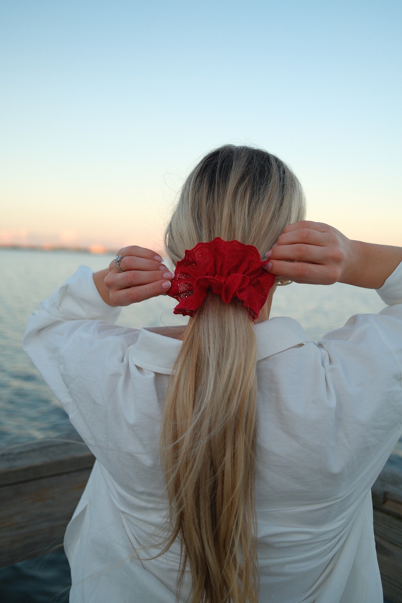 The red eyelet scrunchie combines aesthetic appeal with practical functionality. Its vibrant color enhances any hairstyle, making it suitable for both casual and formal occasions.