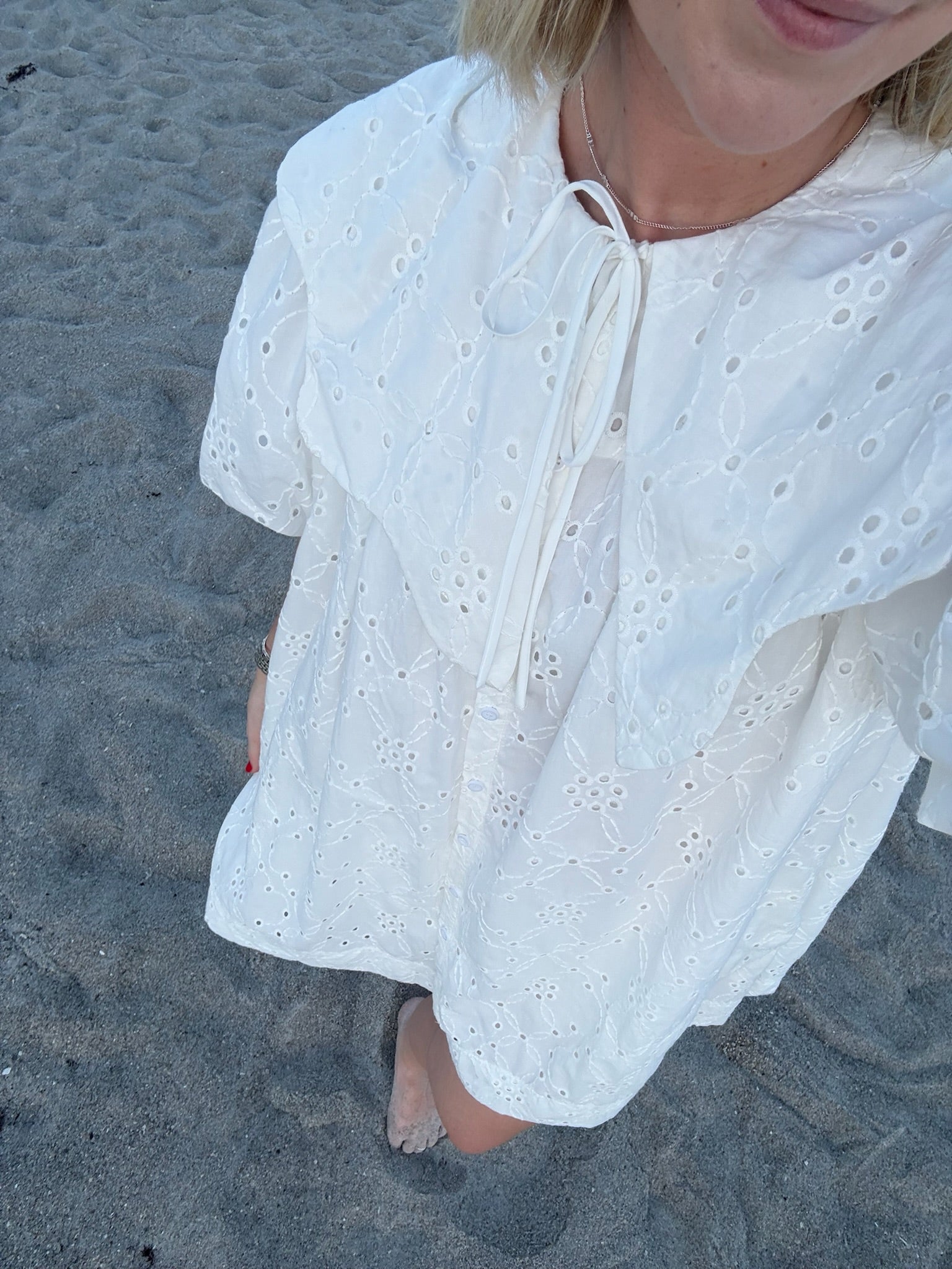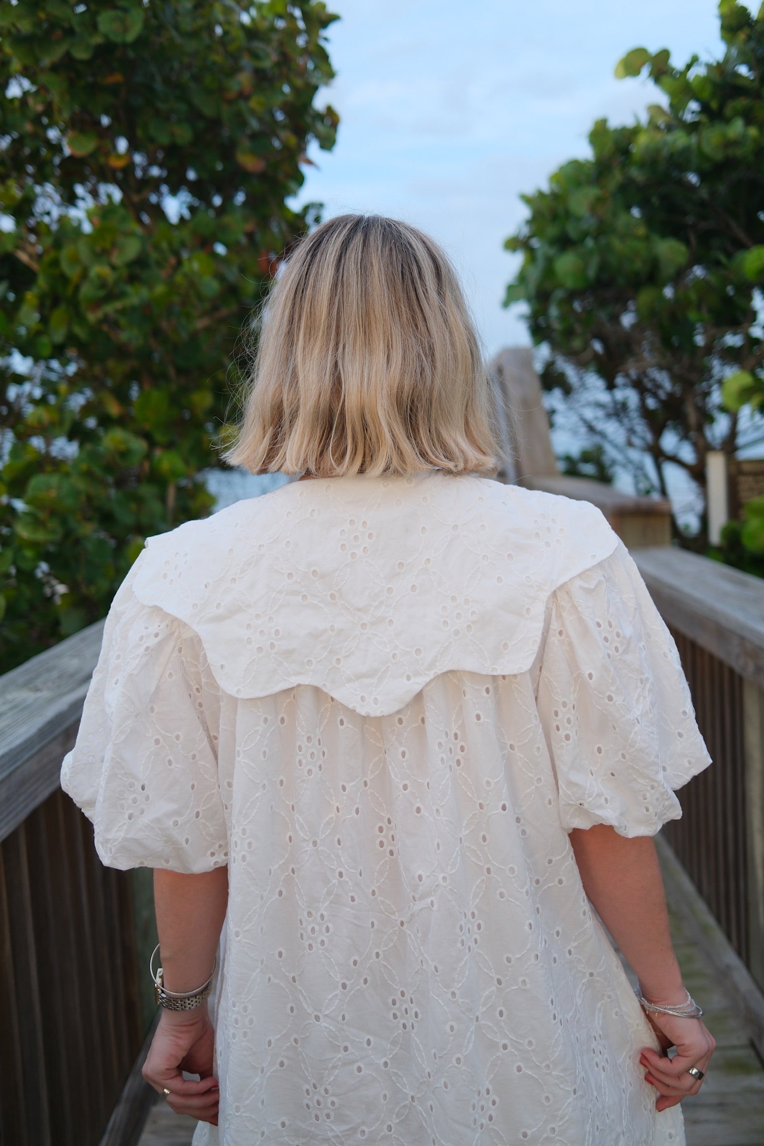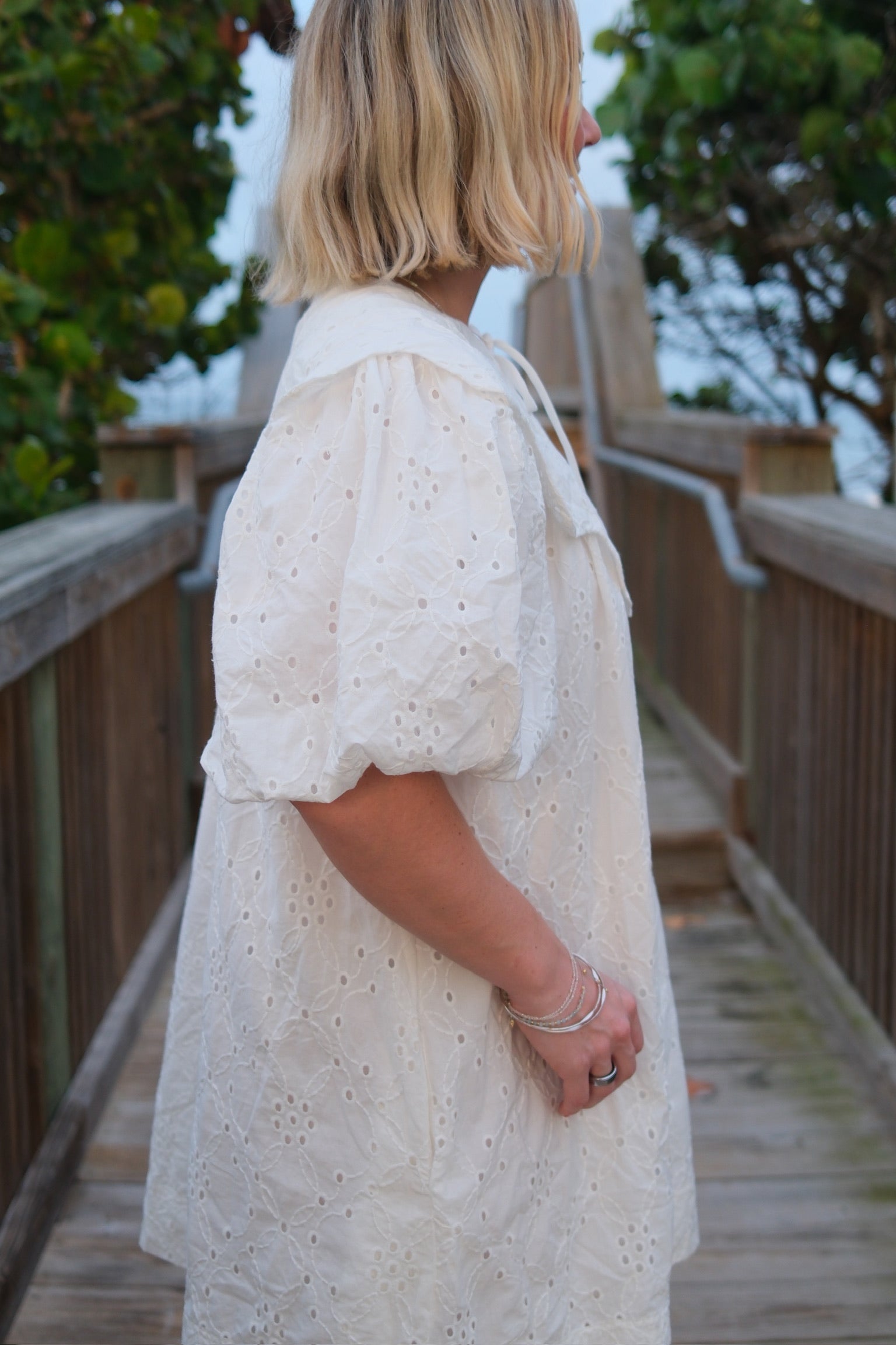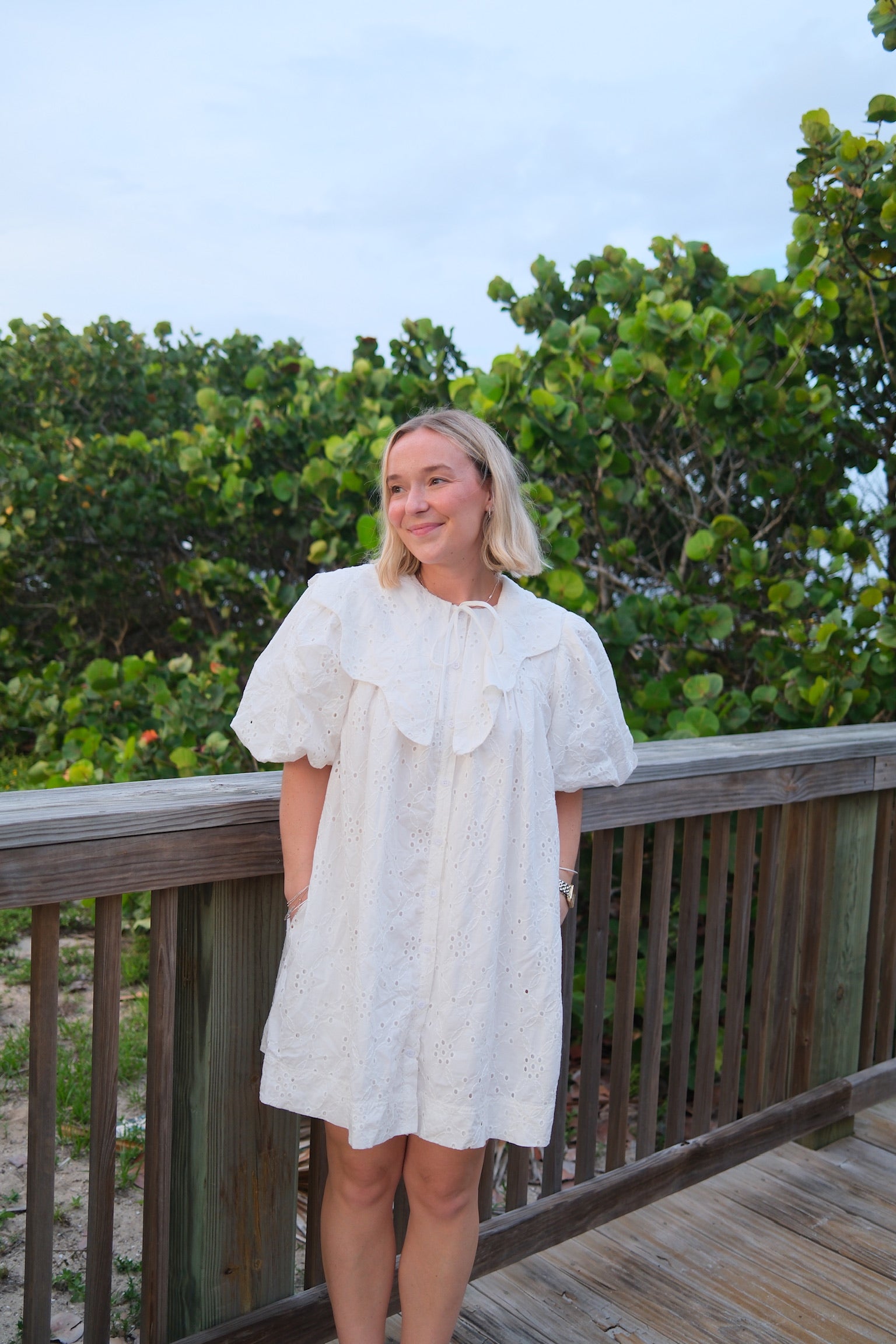 This white mini dress is a perfect addition to your wardrobe. The intricate eyelets and scalloped Peter Pan collar add a touch of elegance to the dress. Complete with a darling bow, this dress is both stylish and sophisticated. Stand out in the Magnolia Dress.