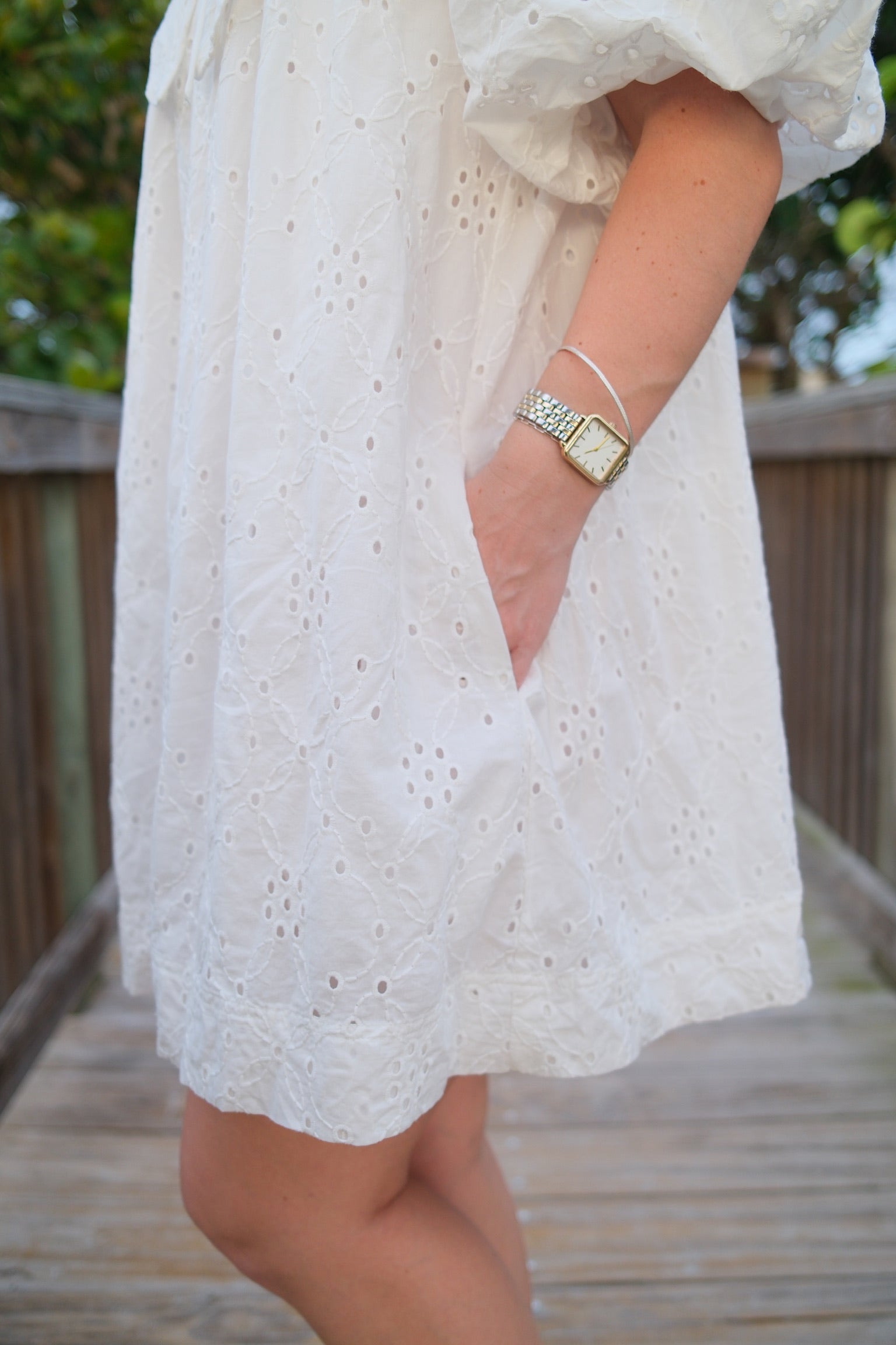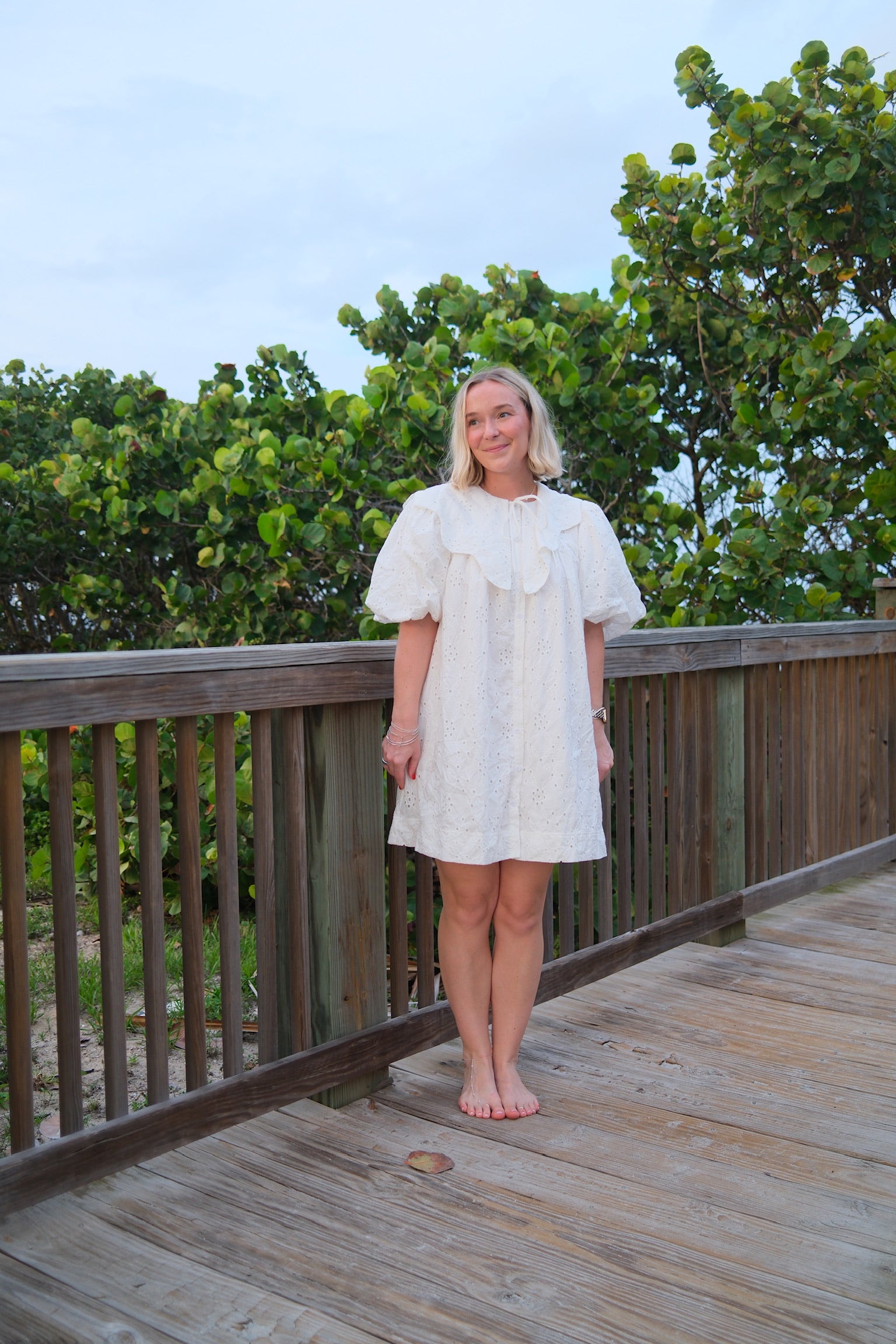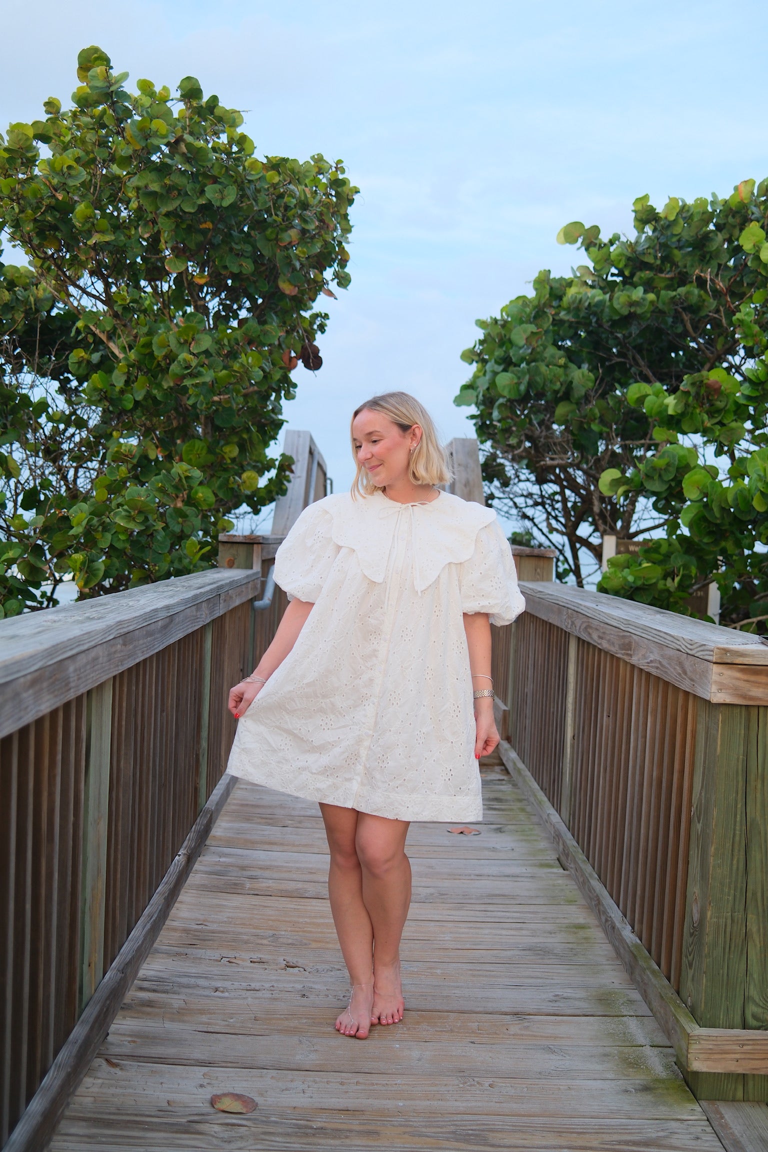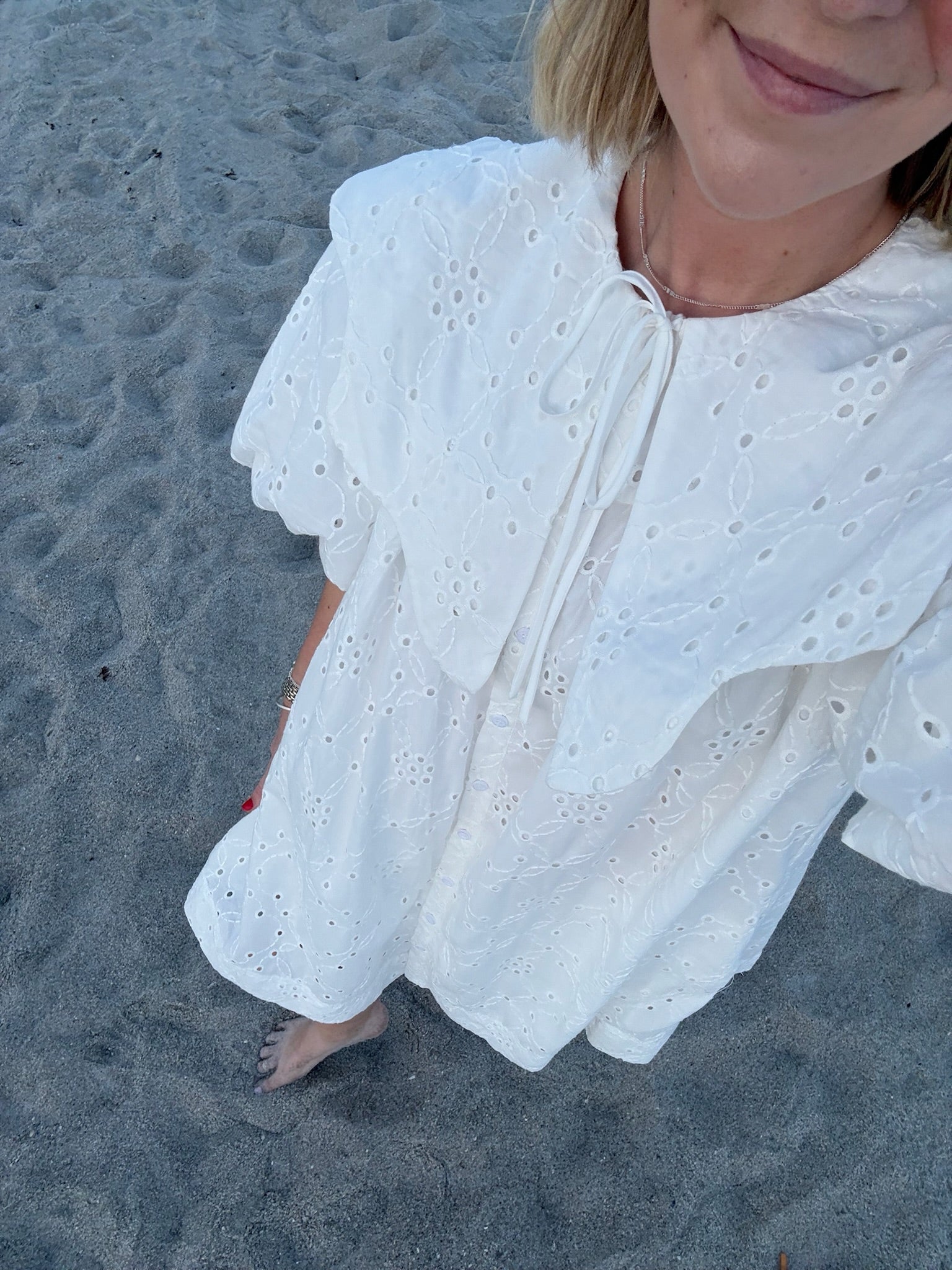 This white mini dress is a perfect addition to your wardrobe. The intricate eyelets and scalloped Peter Pan collar add a touch of elegance to the dress. Complete with a darling bow, this dress is both stylish and sophisticated. Stand out in the Magnolia Dress.