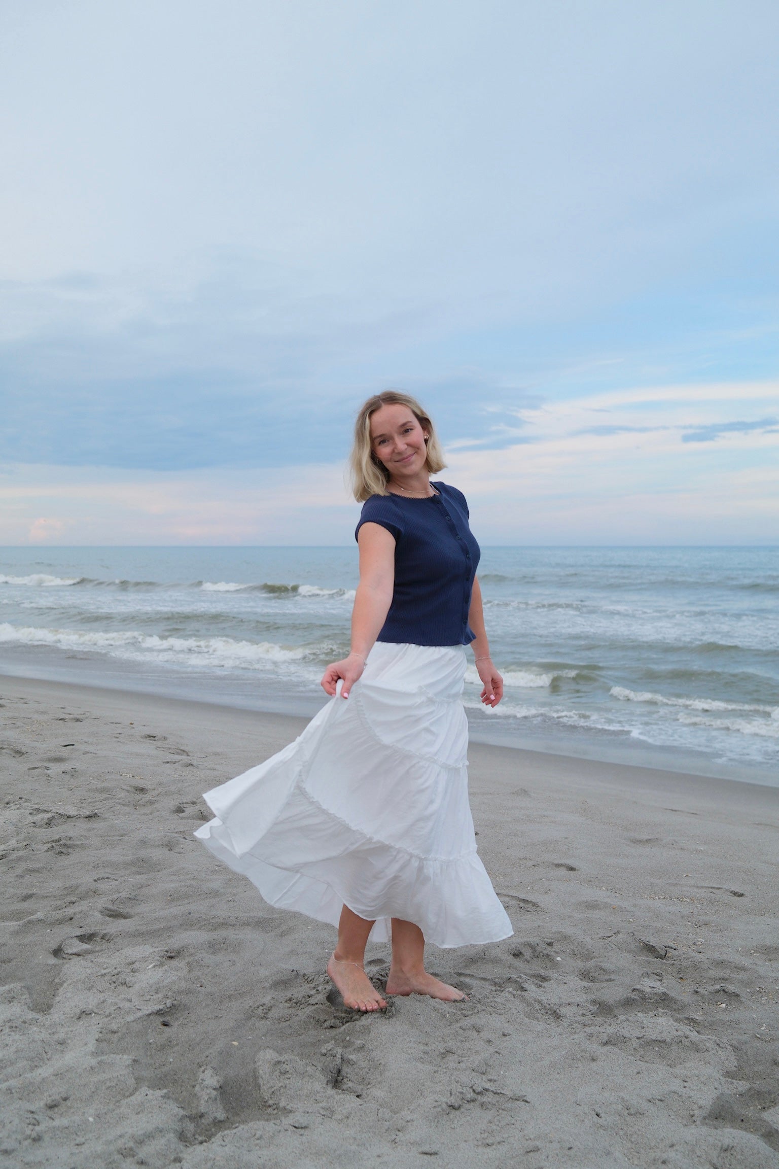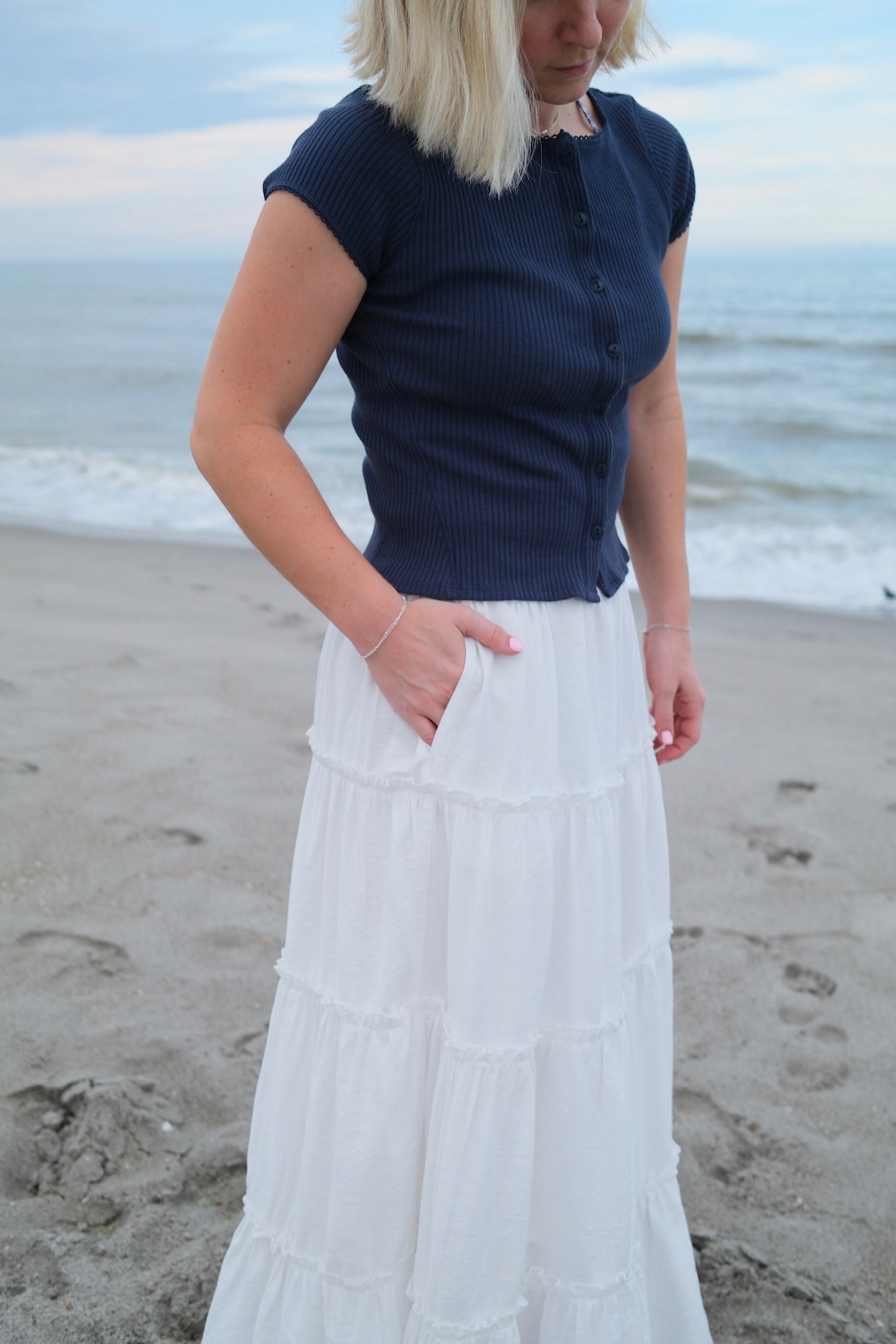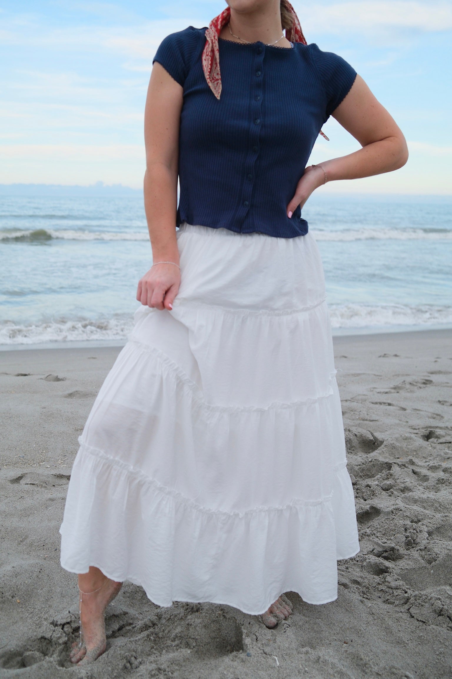 Introducing the Maison Skirt - a versatile and stylish addition to any wardrobe. This white, tiered, double lined skirt can be effortlessly dressed up or down, making it perfect for any occasion. Inspired by the French word for "home", this skirt will be your go-to piece from hosting your friends to running errands.
