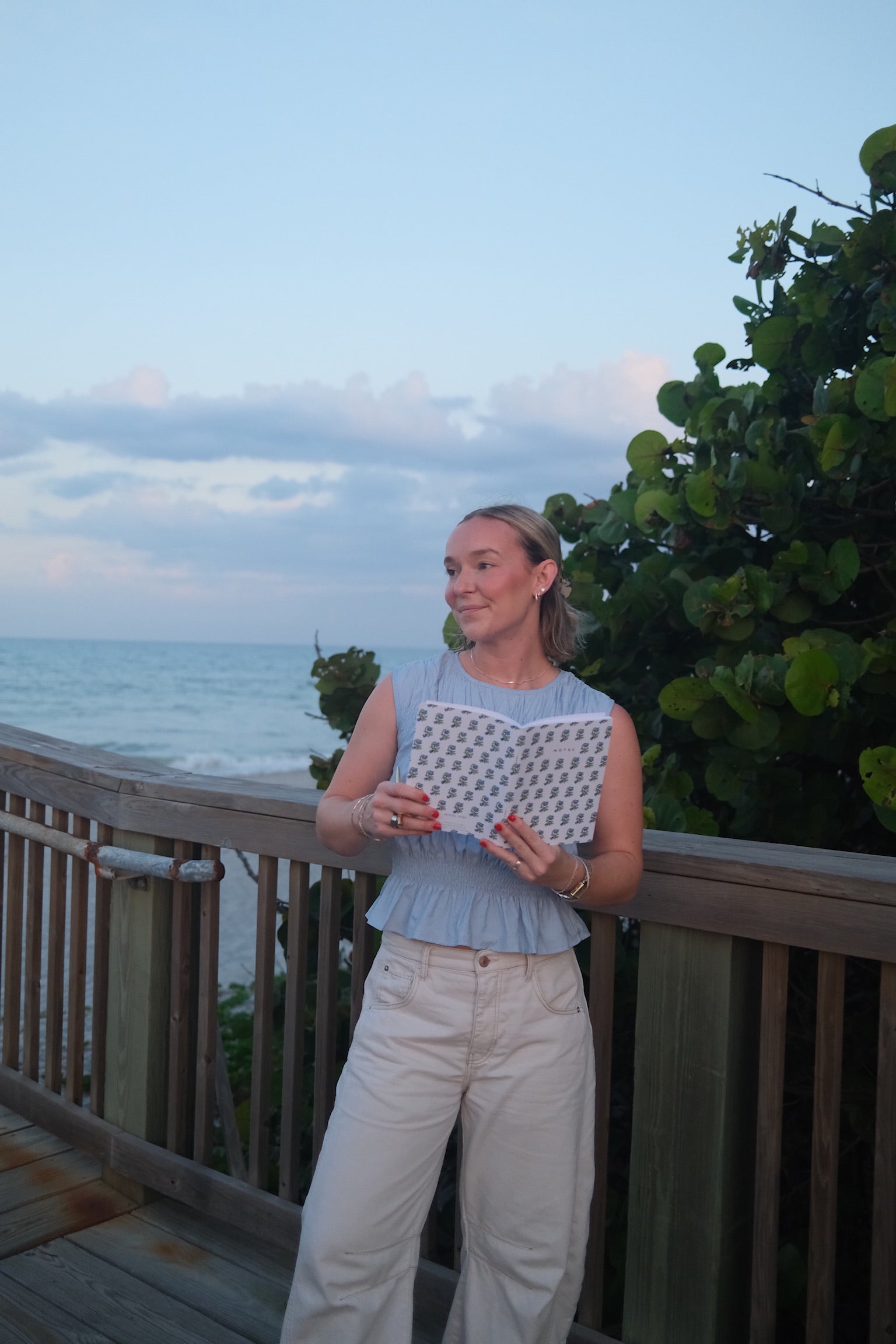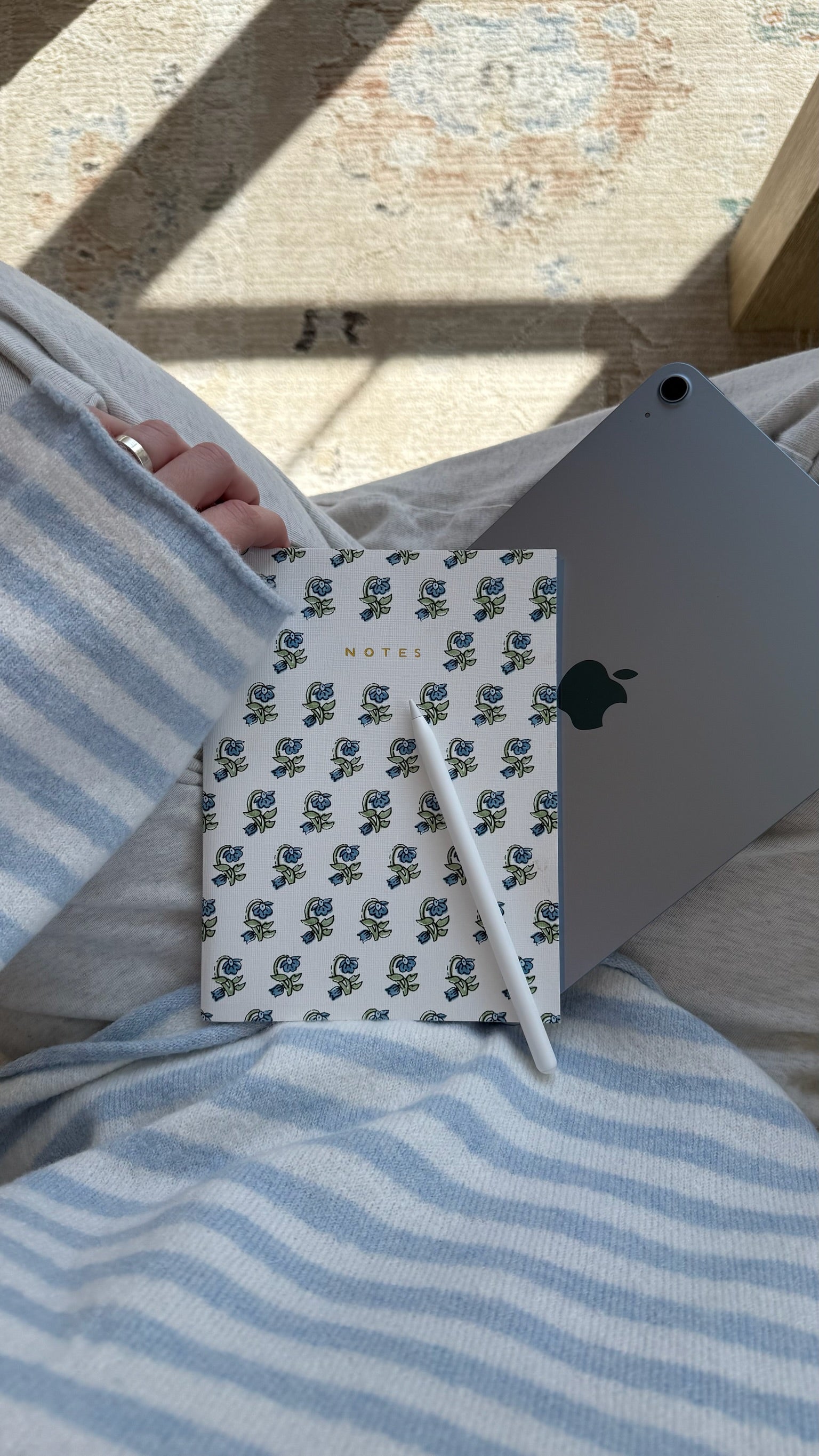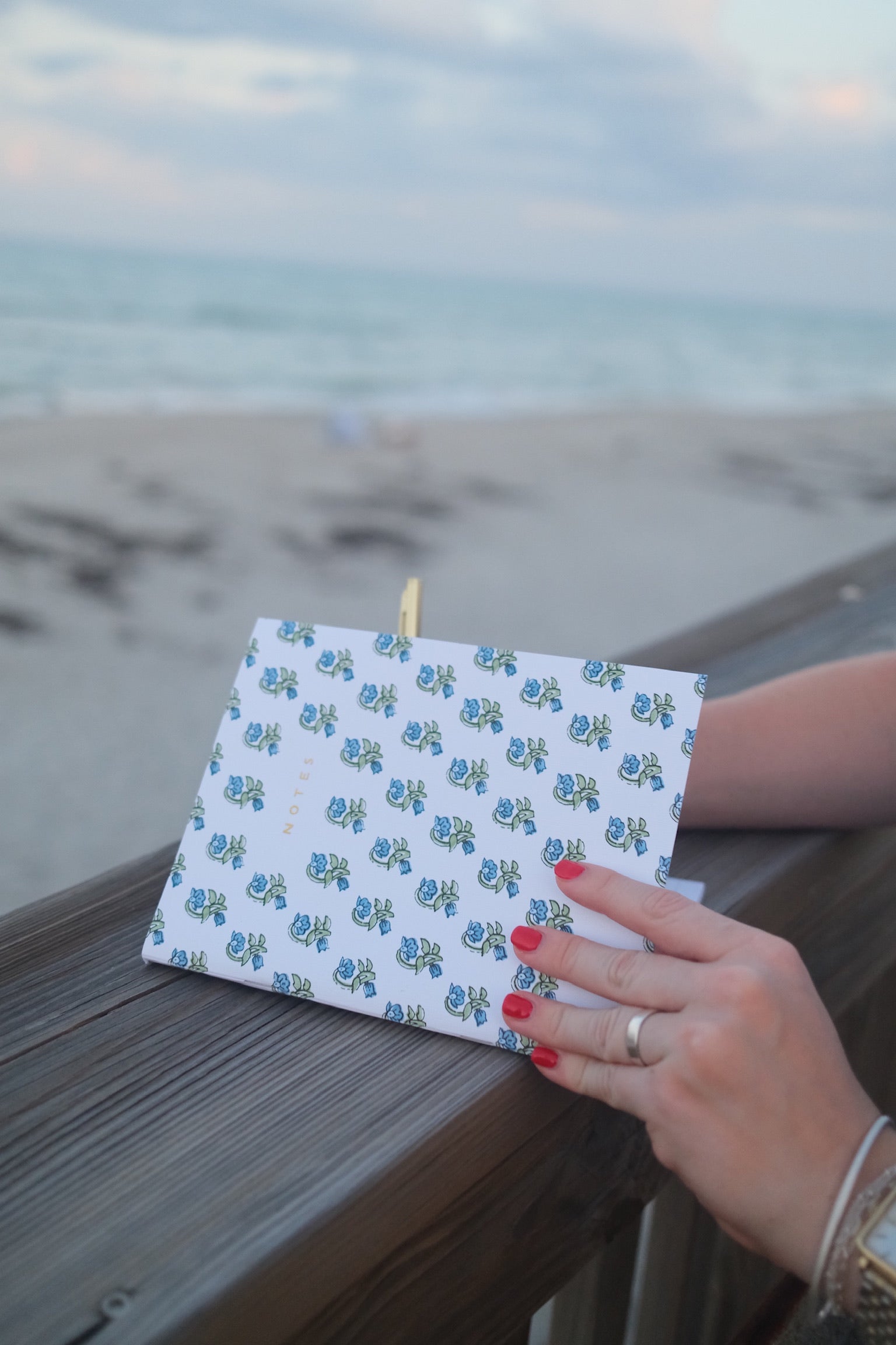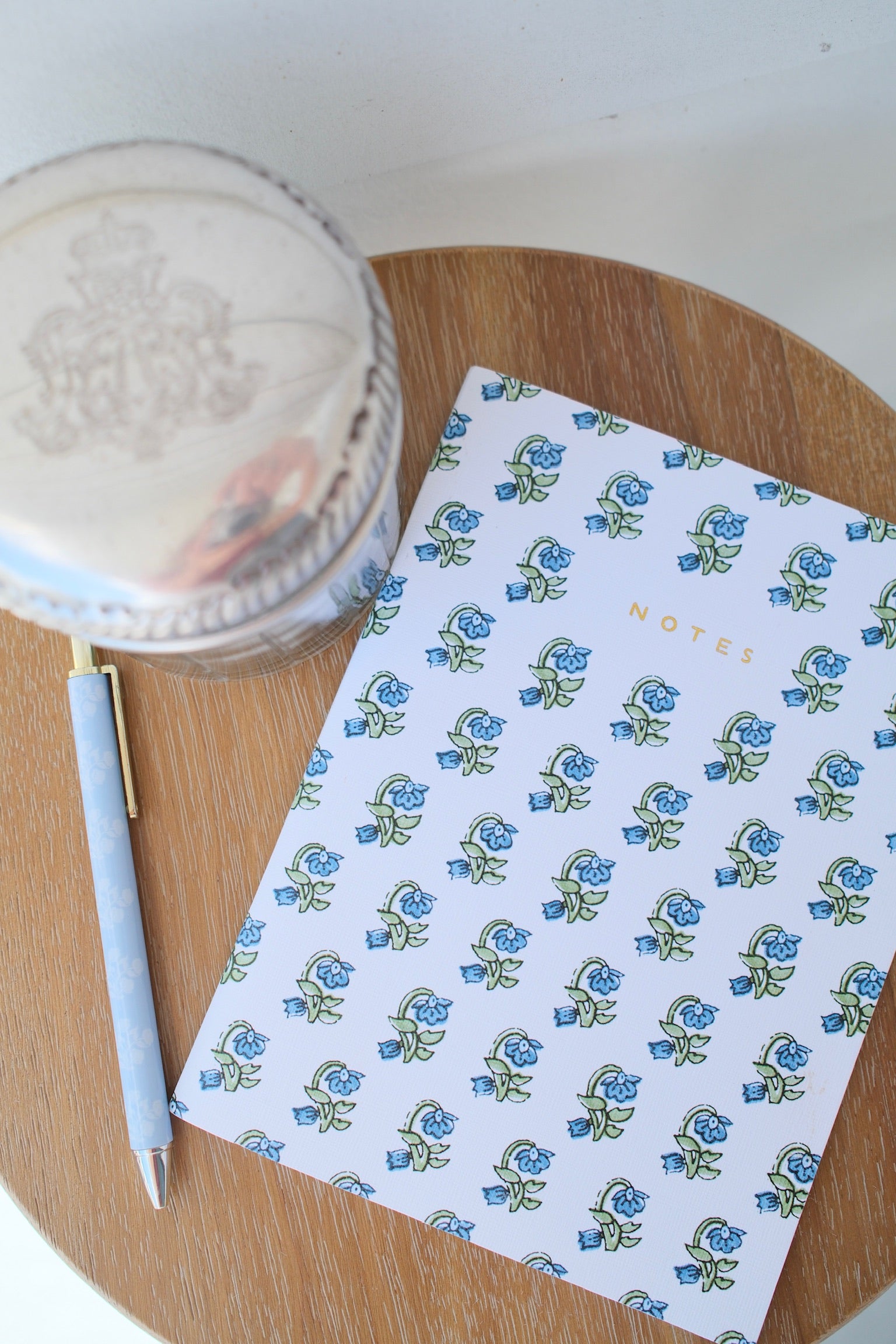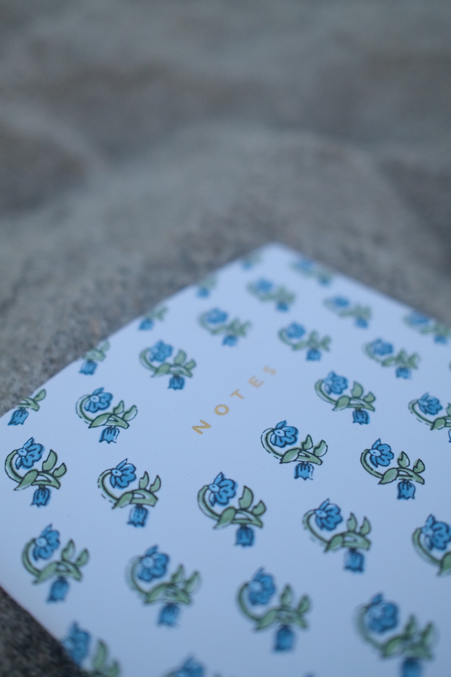 This notebook features a beautifully crafted watercolor block print design in blue and green tones, inspired by coastal aesthetics. It's lined pages provide a versatile canvas for notes. Perfect for capturing thoughts with a touch of seaside elegance.