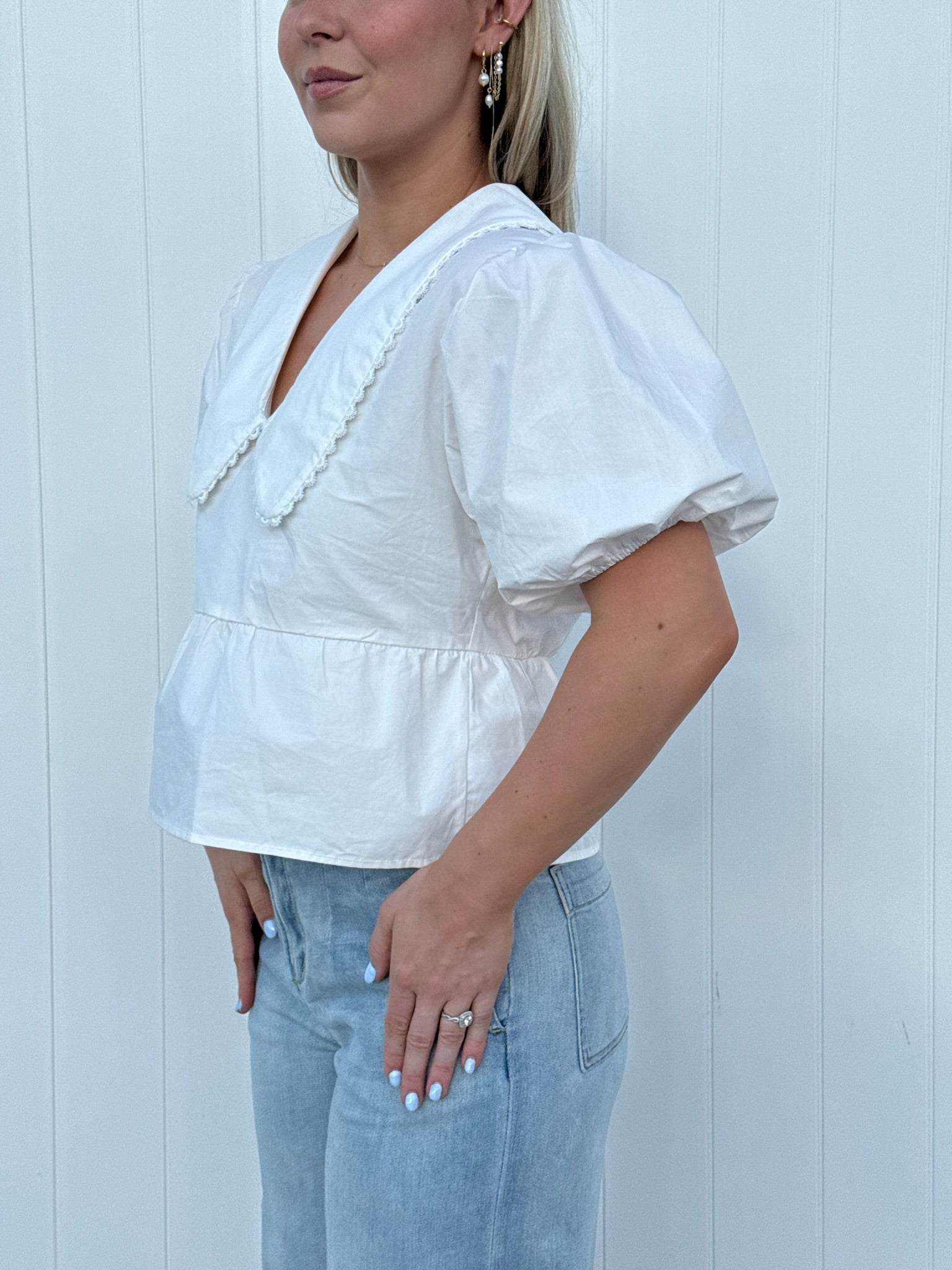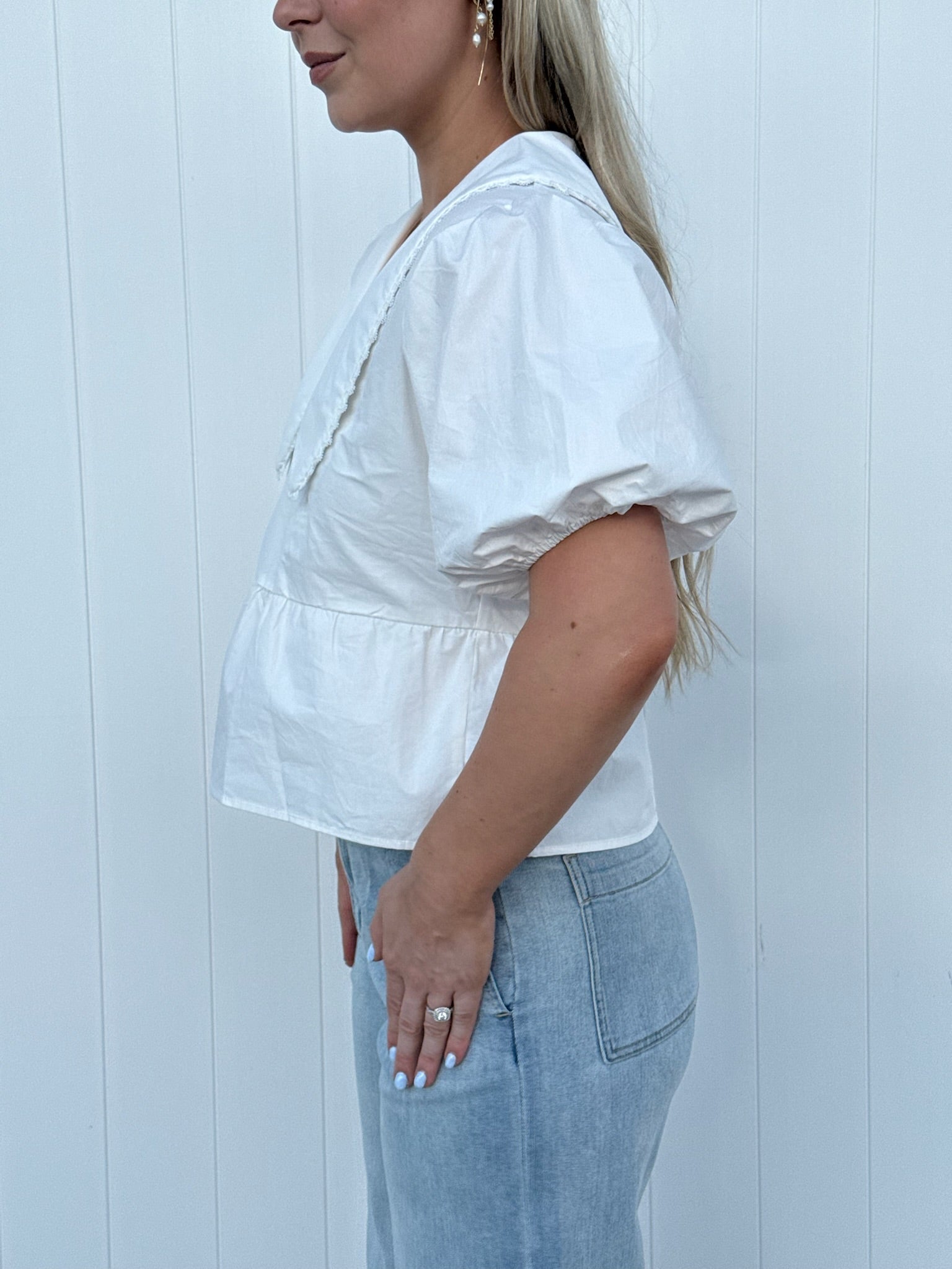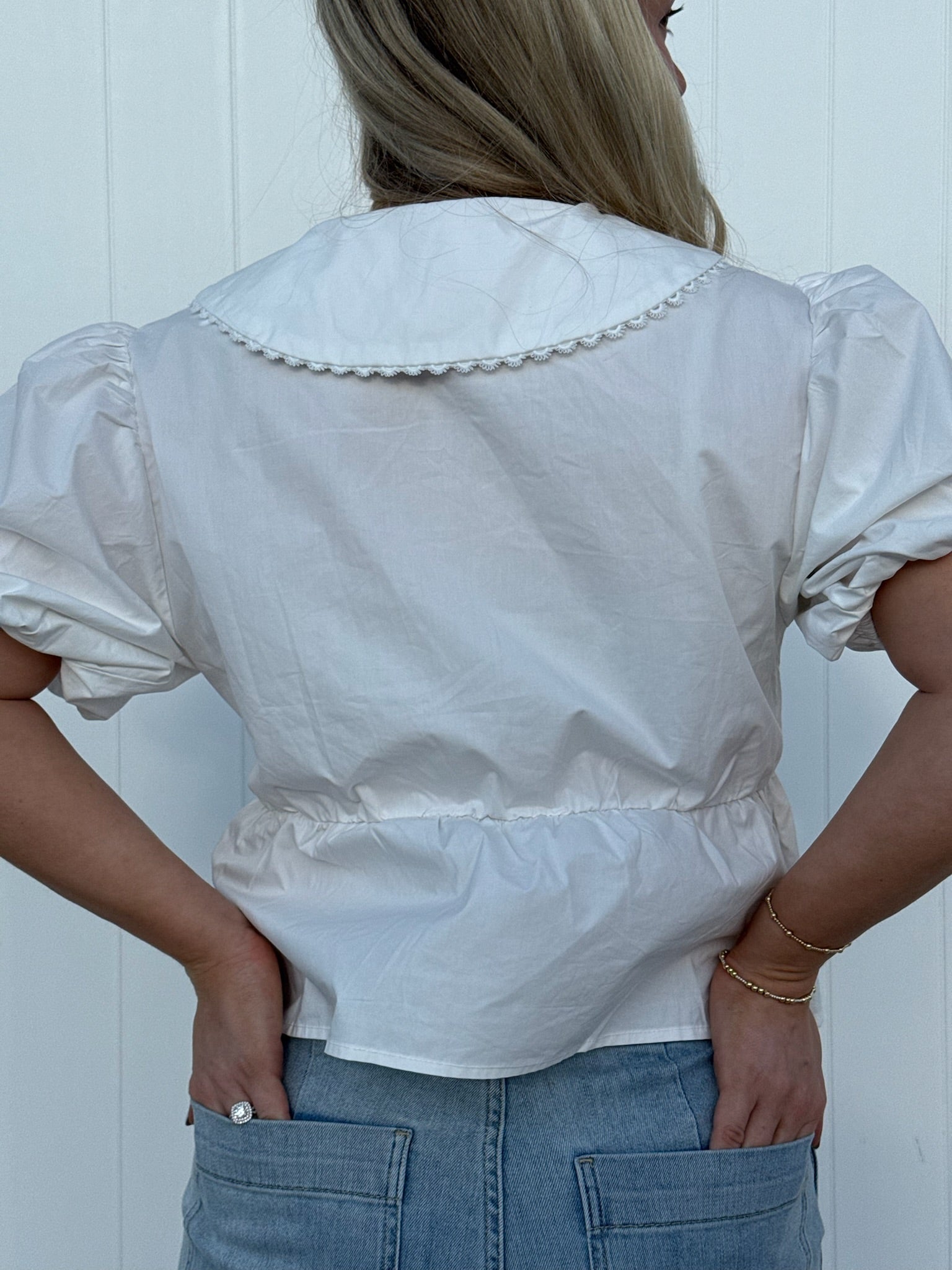 The Montauk Blouse in white features elegant puff sleeves and a beautifully designed collar, embodying a preppy, classy, and coastal aesthetic. Available in navy and white, this blouse offers a timeless look that effortlessly blends sophistication with relaxed seaside charm. True to size.