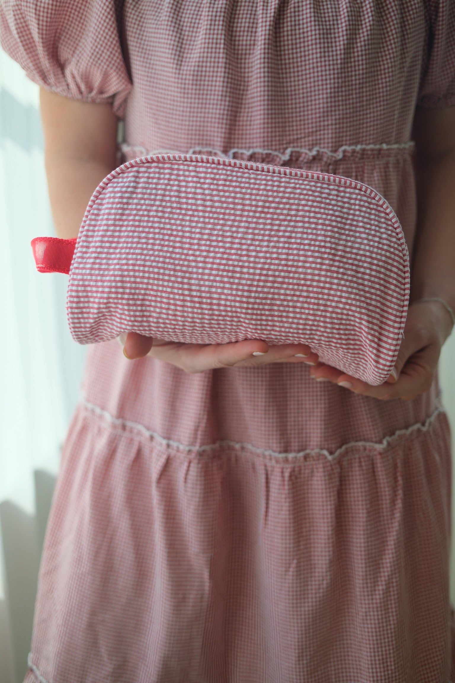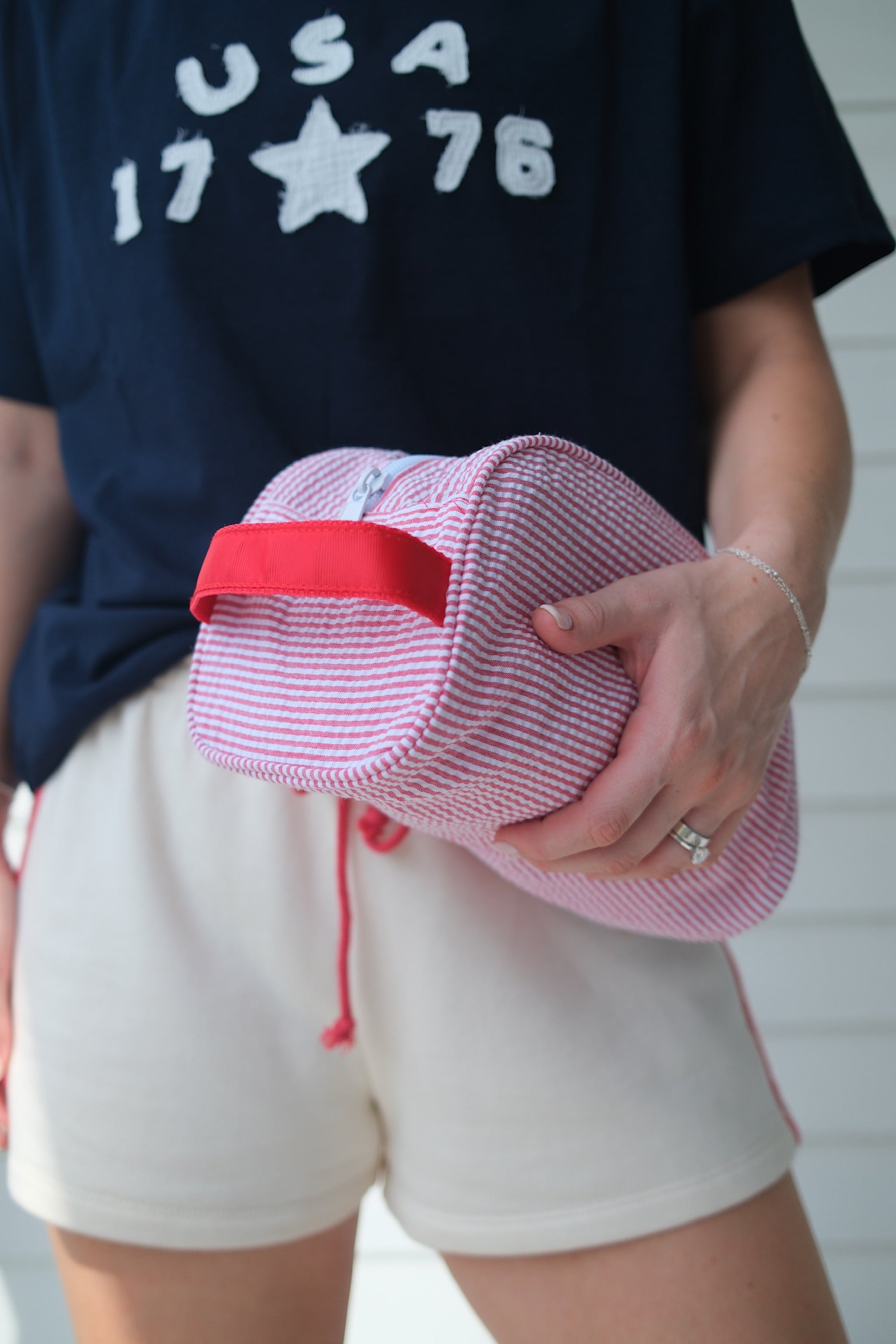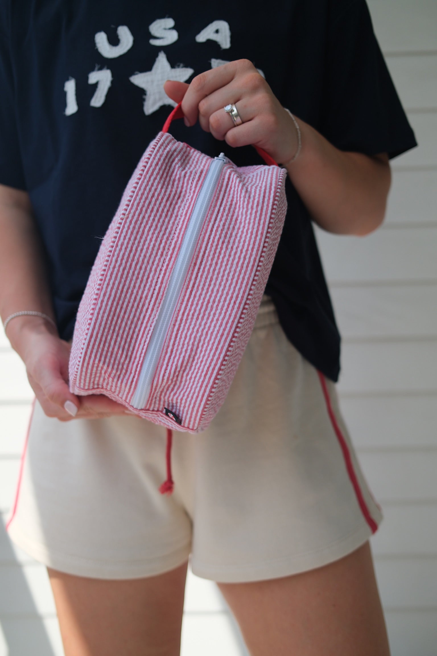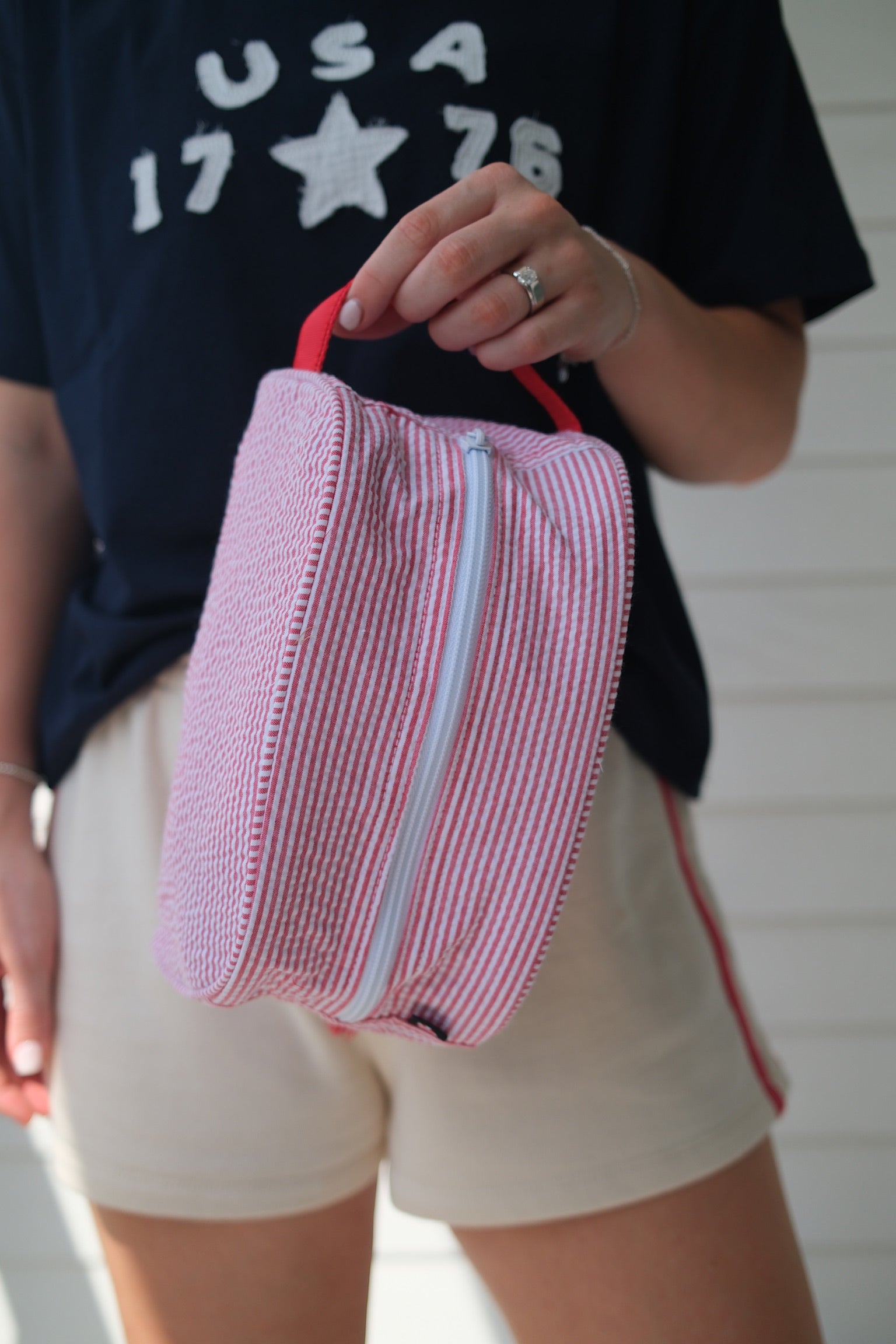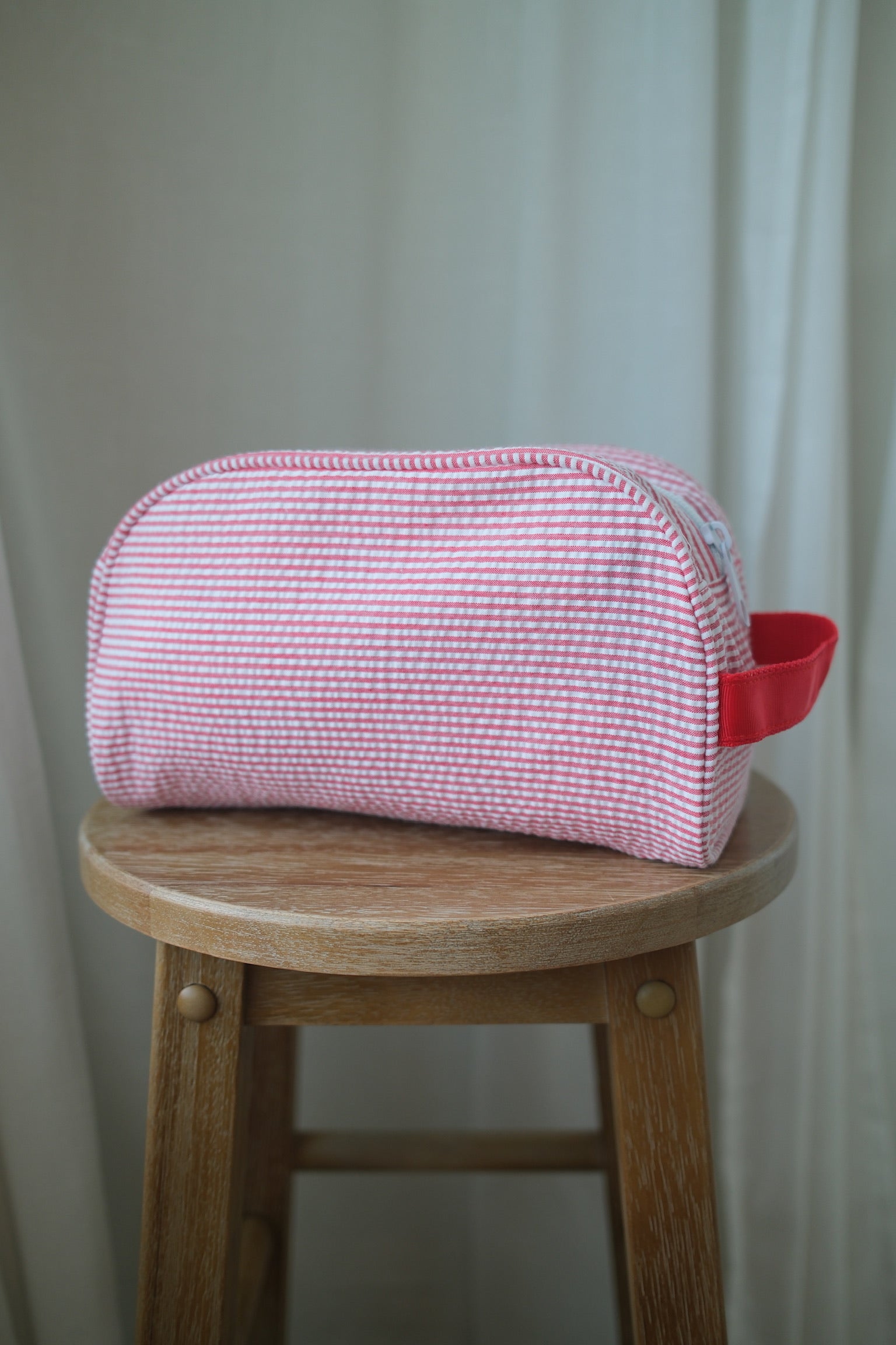 This large red seersucker toiletry bag combines classic seersucker with a vibrant red color, offering ample space for all your essentials. Featuring a sturdy red handle for easy carrying, it’s designed to keep your toiletries organized with style and sophistication. Perfect for travel or everyday use, this bag adds a refined touch to your routine.