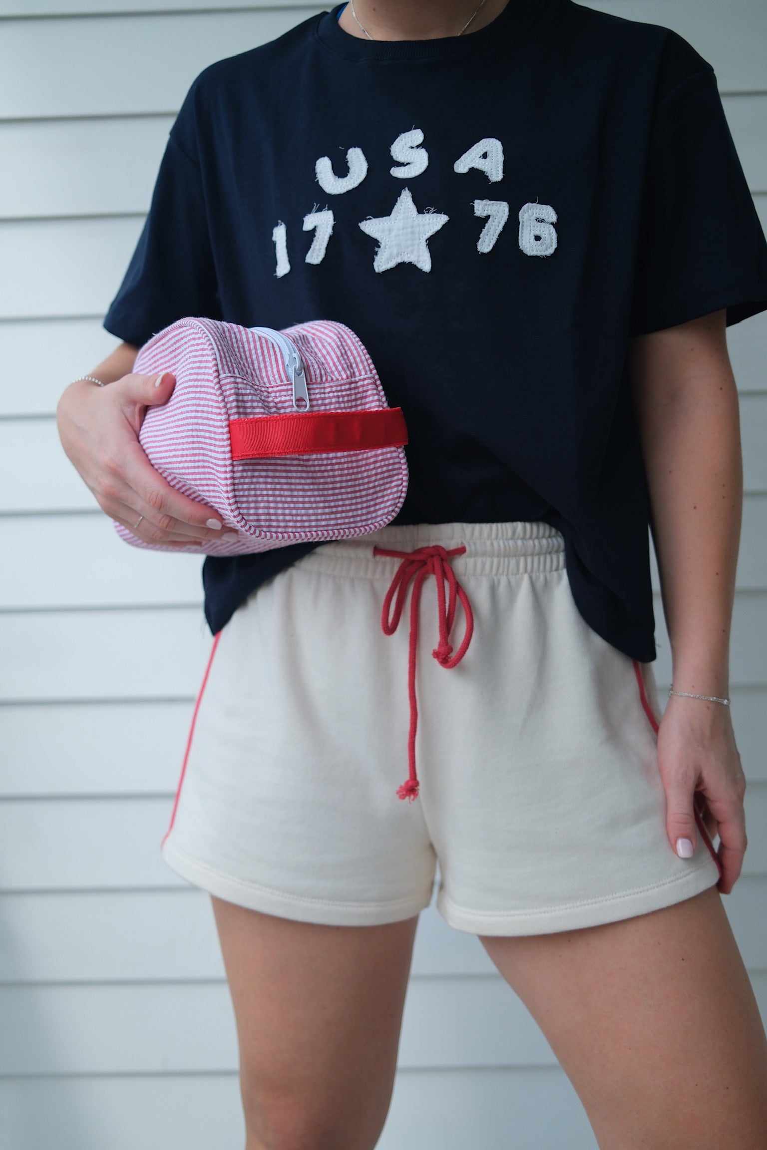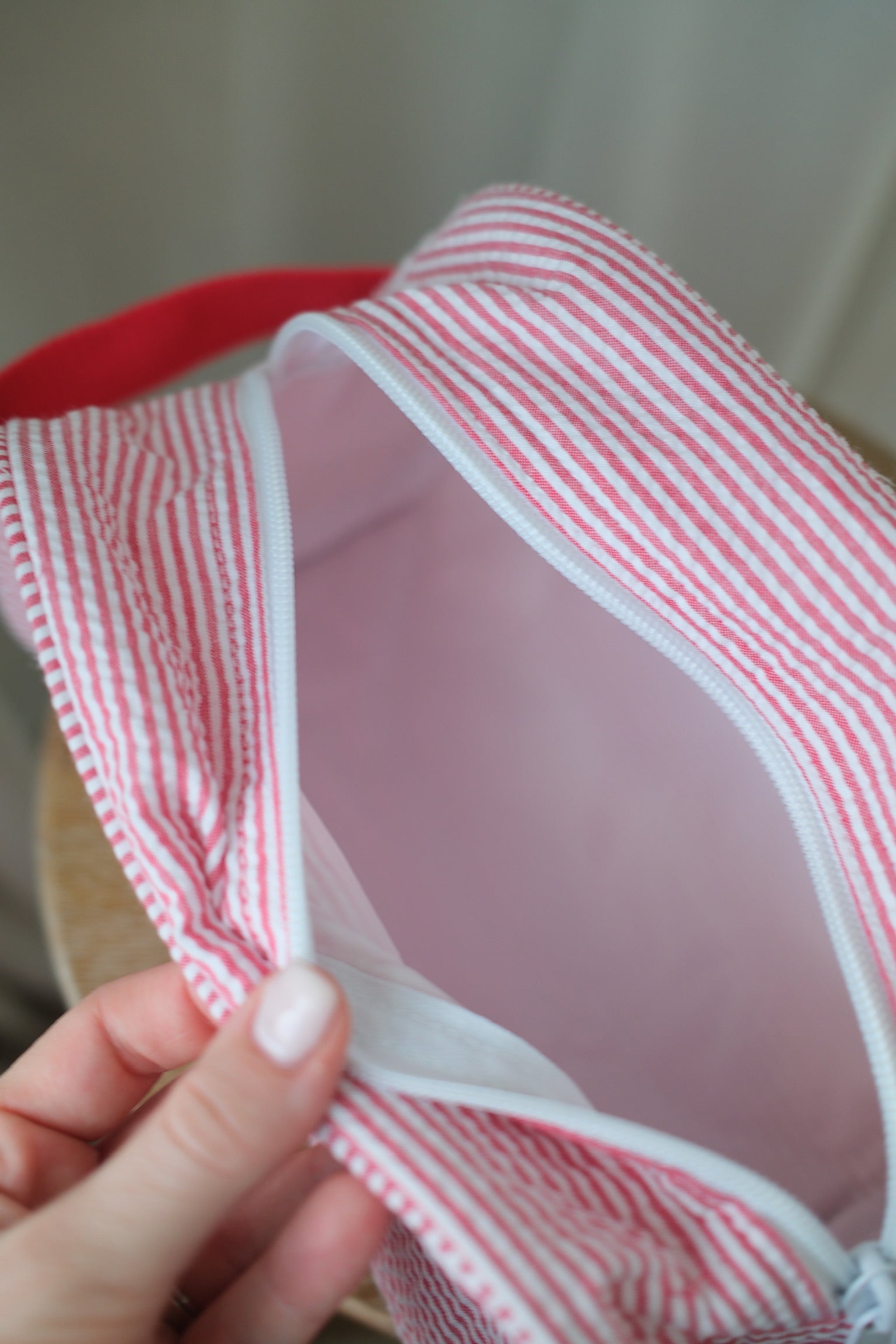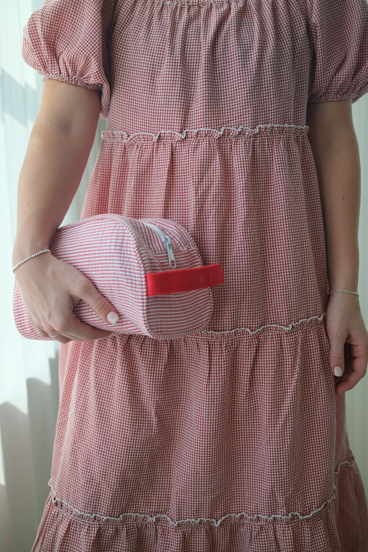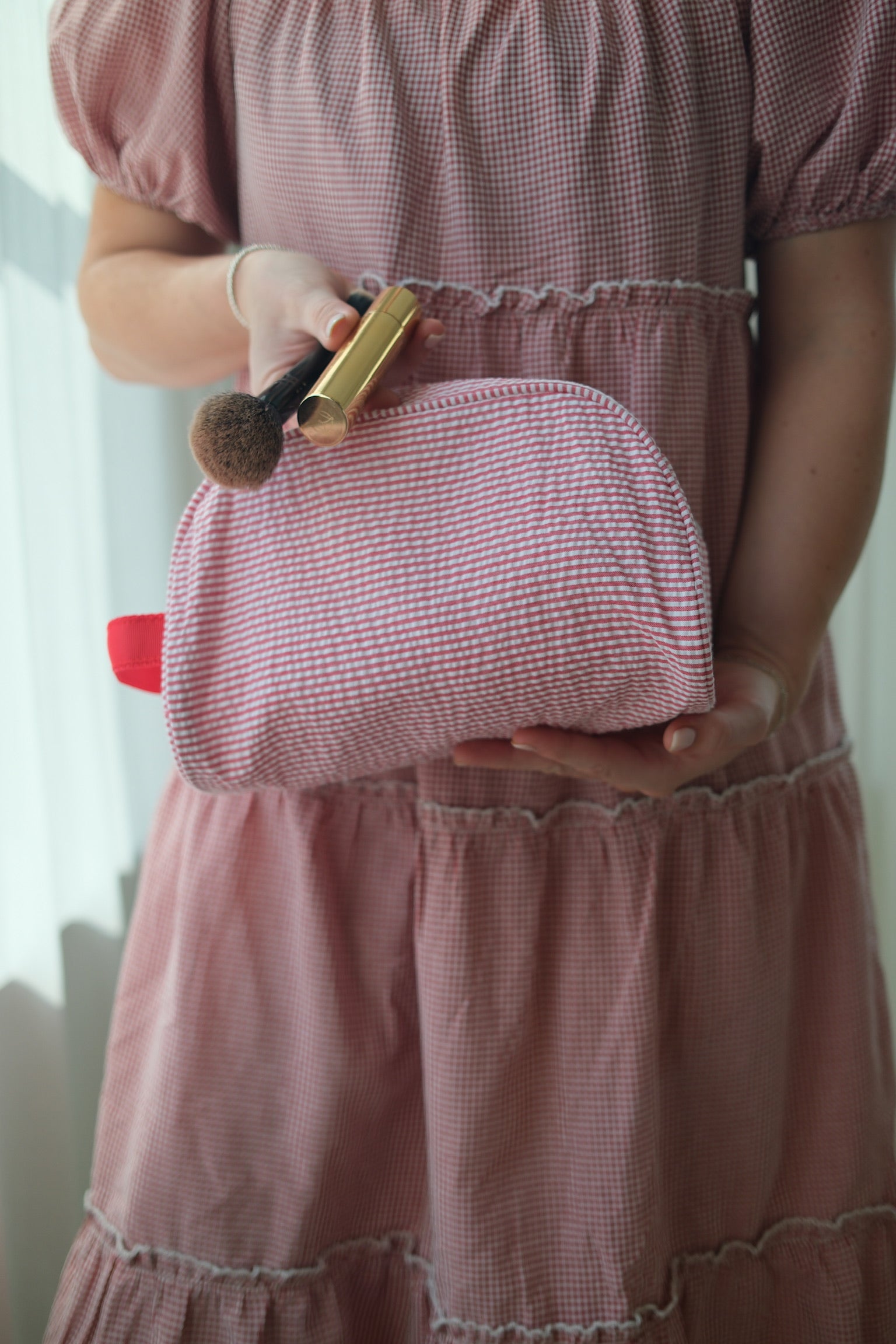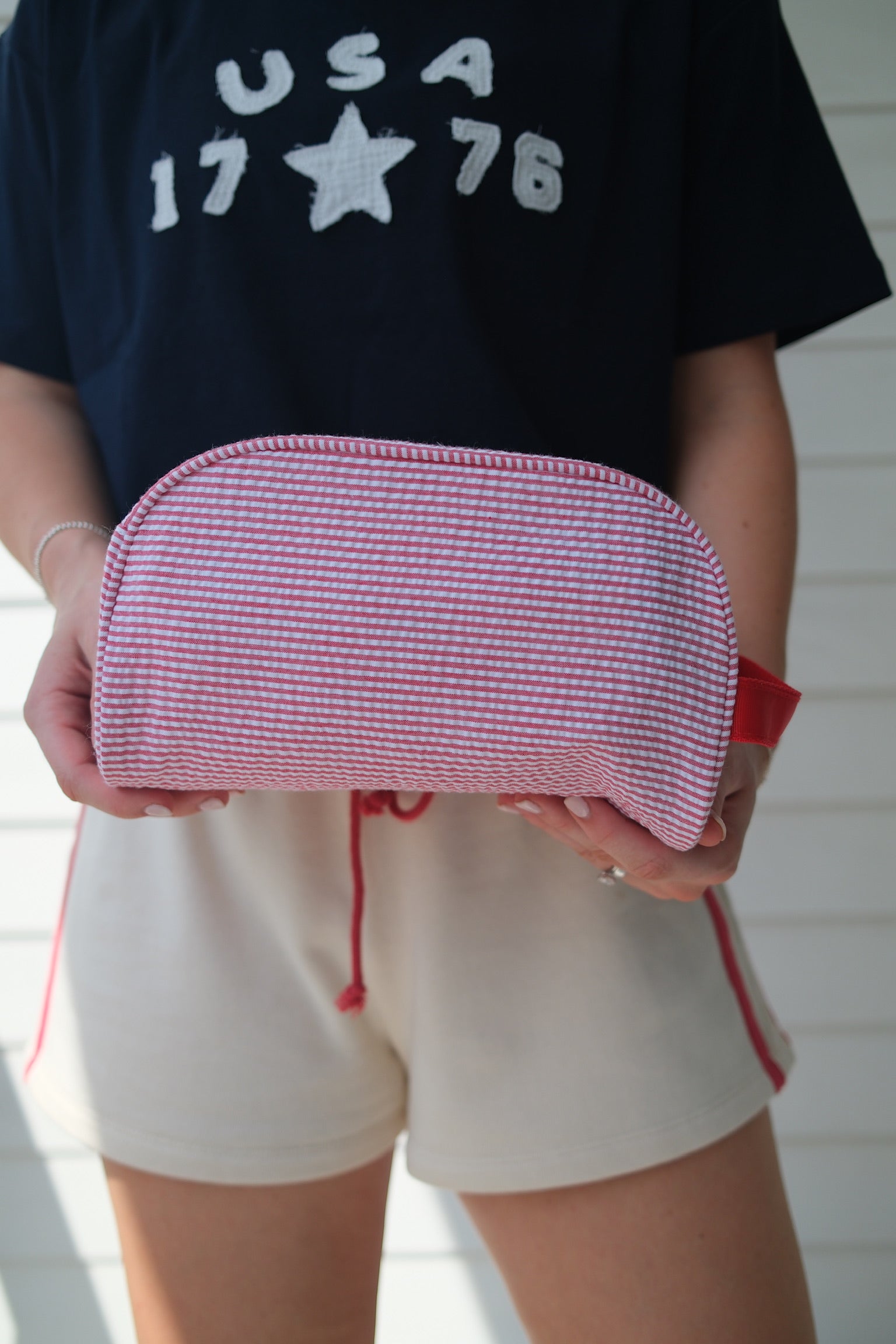 This large red seersucker toiletry bag combines classic seersucker with a vibrant red color, offering ample space for all your essentials. Featuring a sturdy red handle for easy carrying, it’s designed to keep your toiletries organized with style and sophistication. Perfect for travel or everyday use, this bag adds a refined touch to your routine.