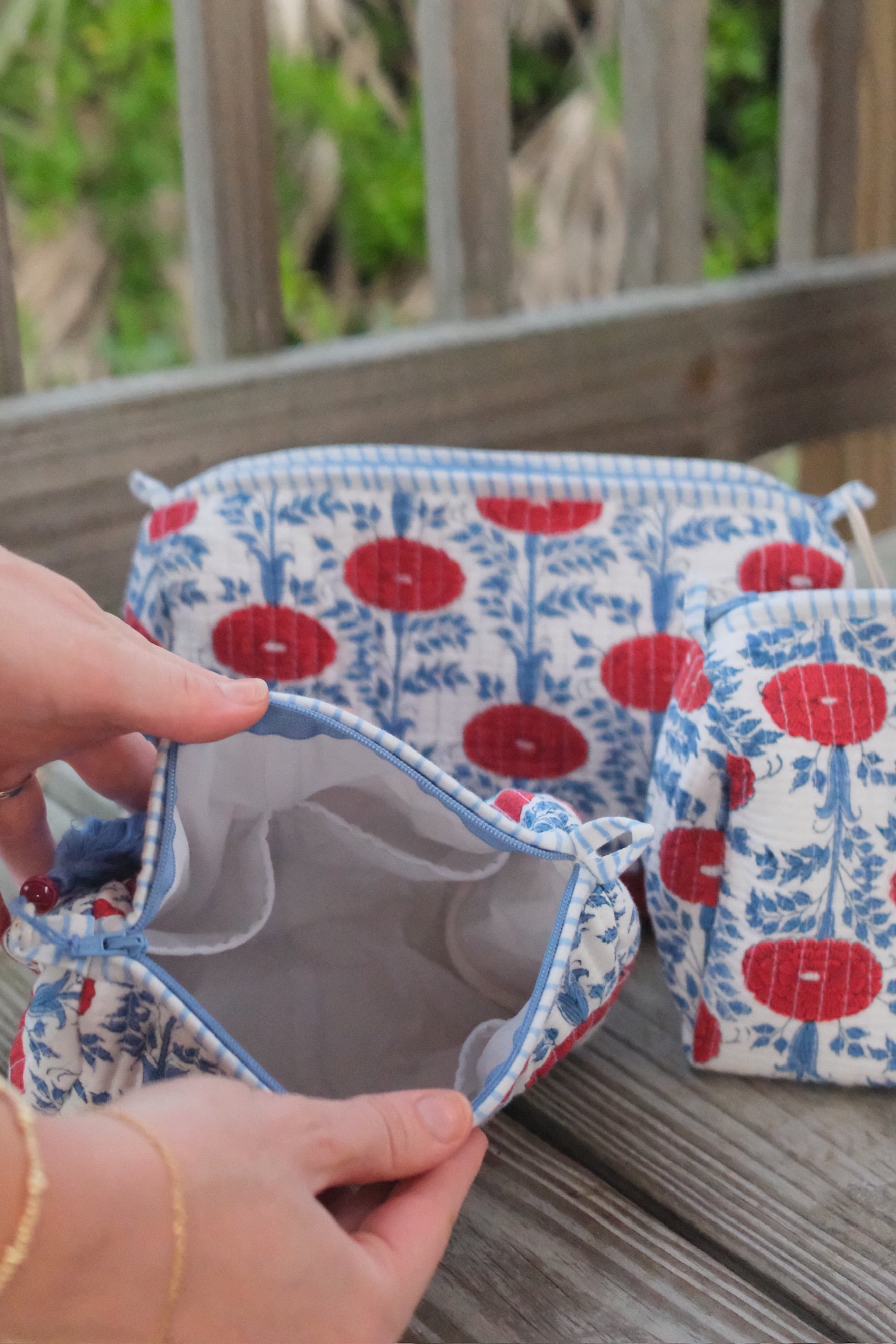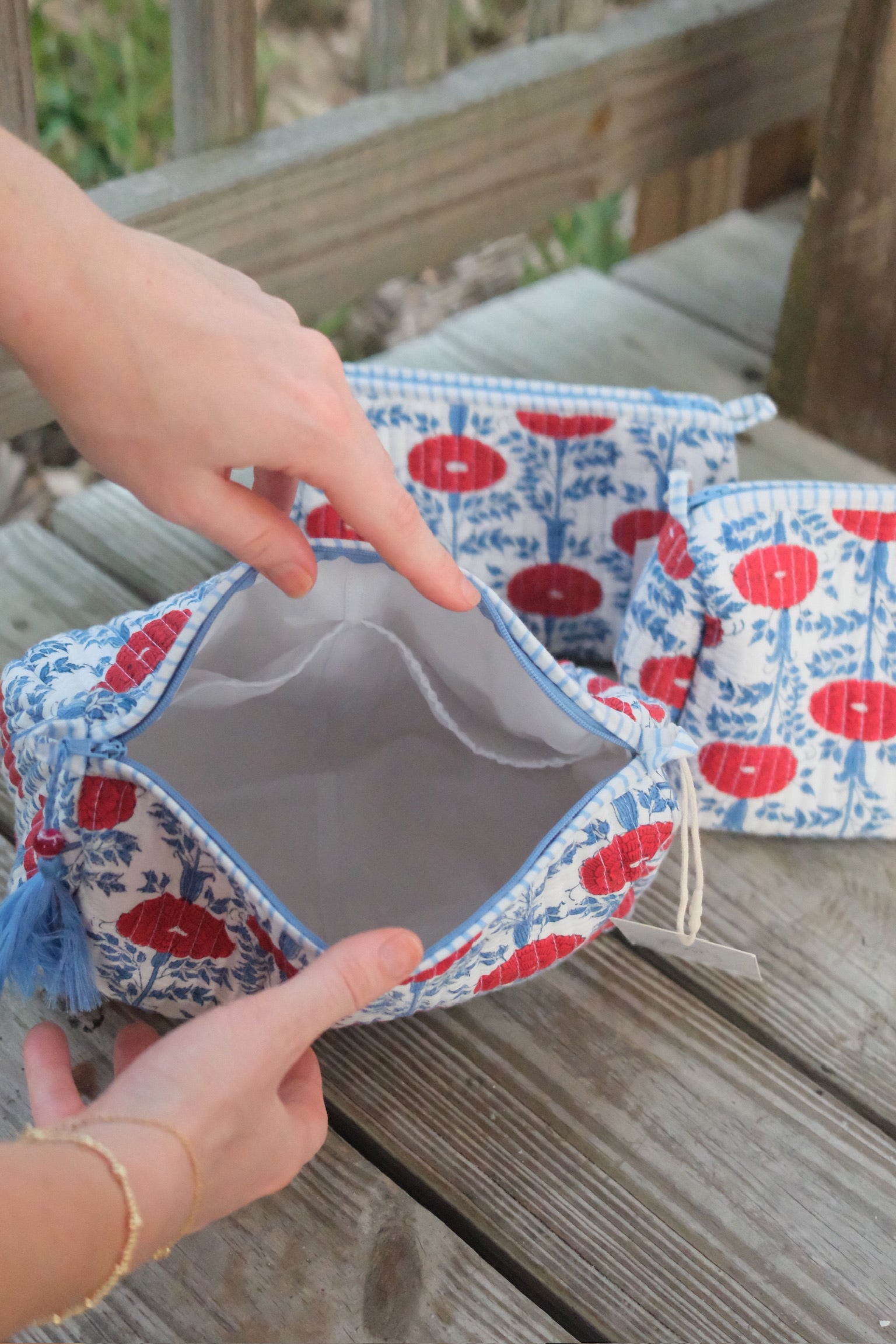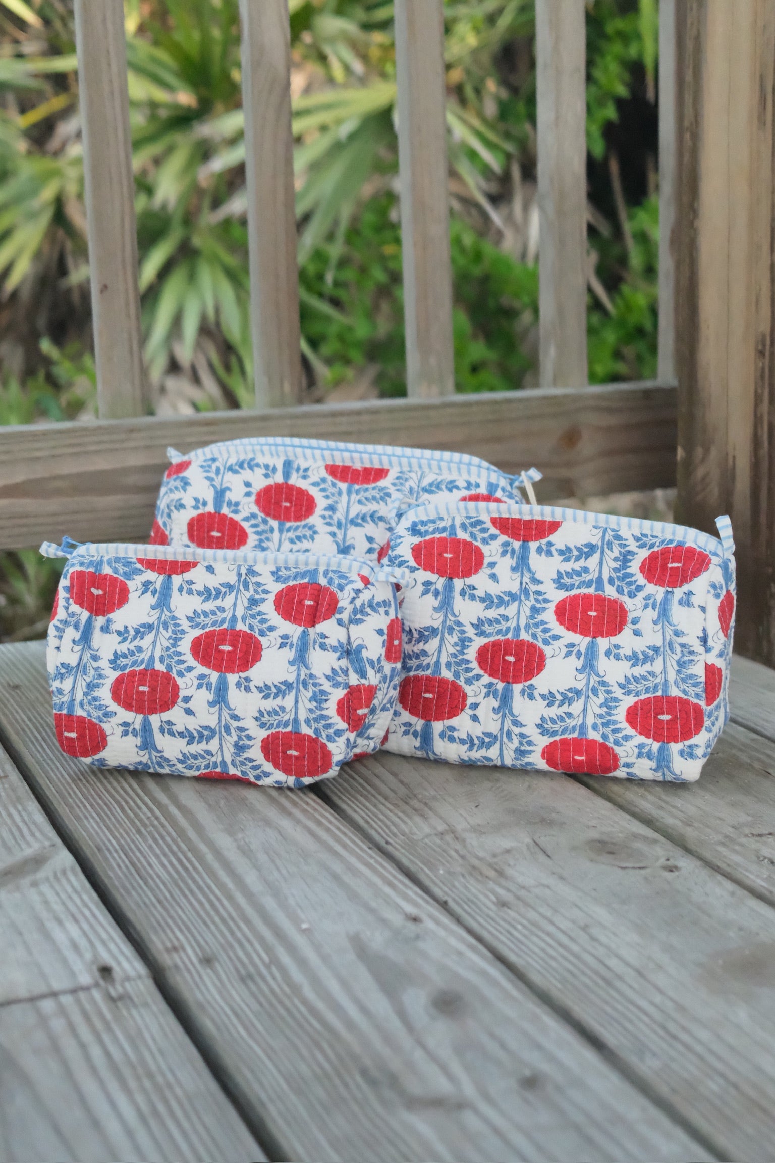Quilted toiletry bags in three sizes—mini, classic, and grand! Featuring patriotic red and blue designs, each bag is thoughtfully lined with wipeable material for easy cleaning. Multiple pockets provide organized storage, ensuring your essentials stay neatly in place.