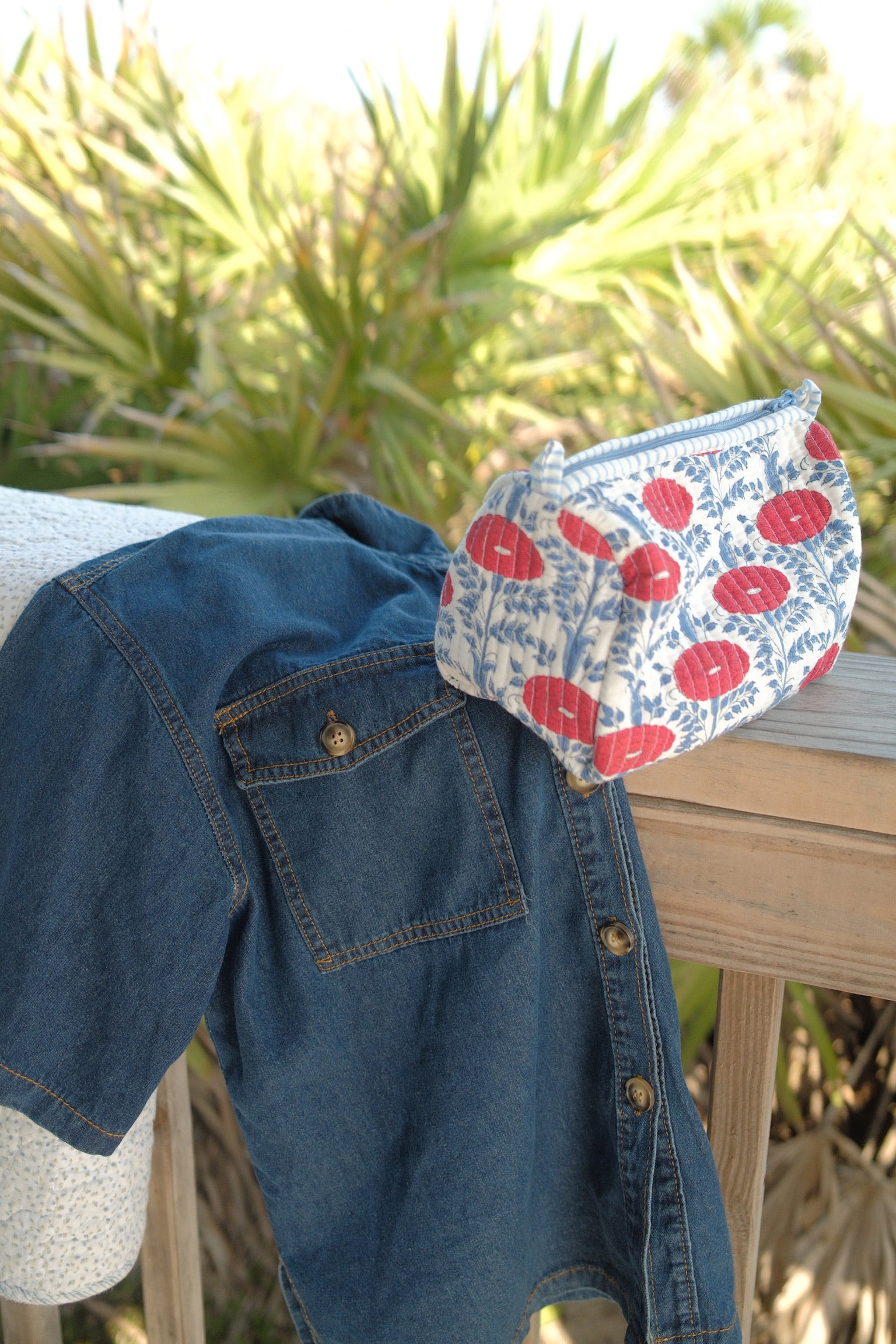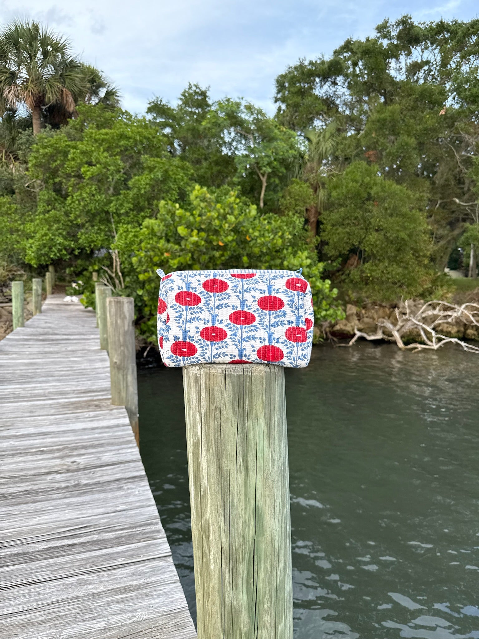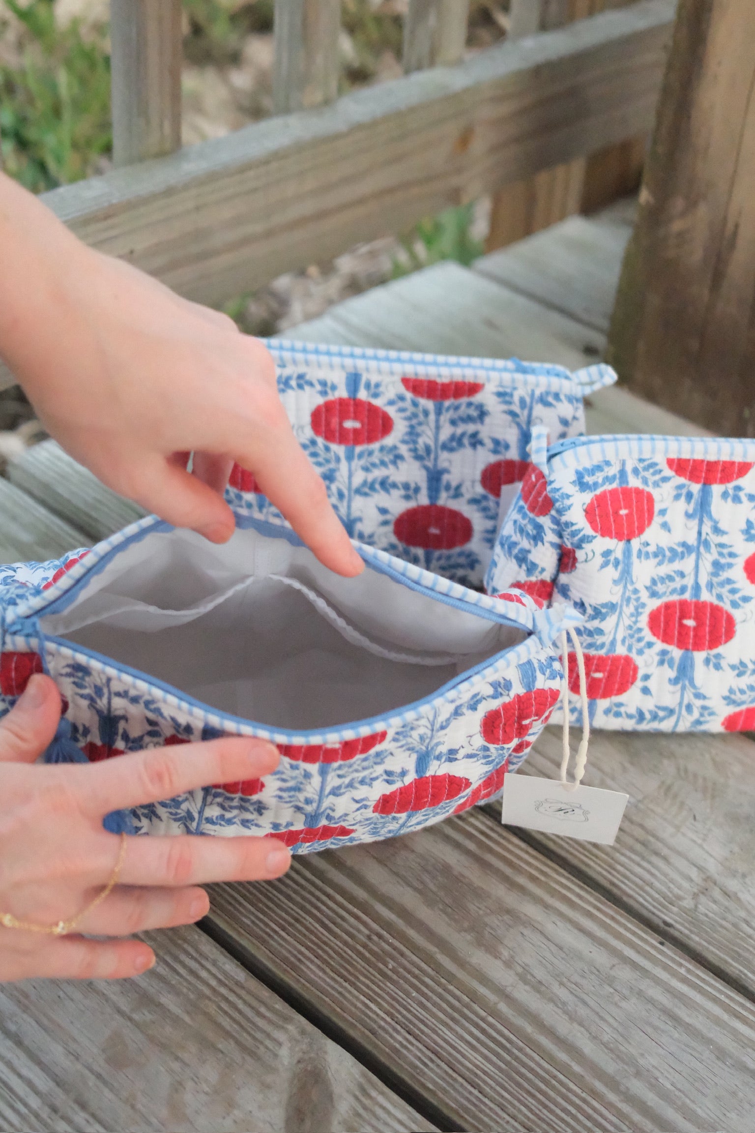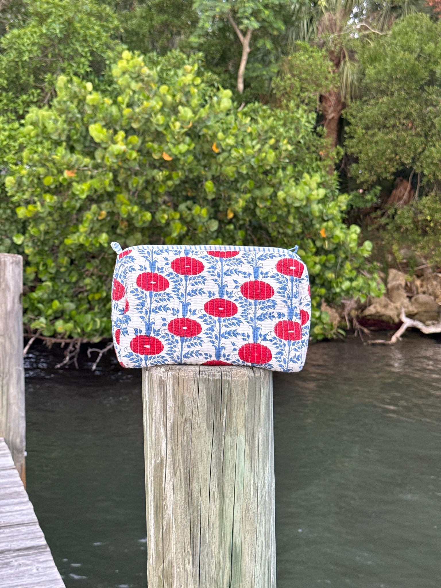 Quilted toiletry bags in three sizes—mini, classic, and grand! Featuring patriotic red and blue designs, each bag is thoughtfully lined with wipeable material for easy cleaning. Multiple pockets provide organized storage, ensuring your essentials stay neatly in place.