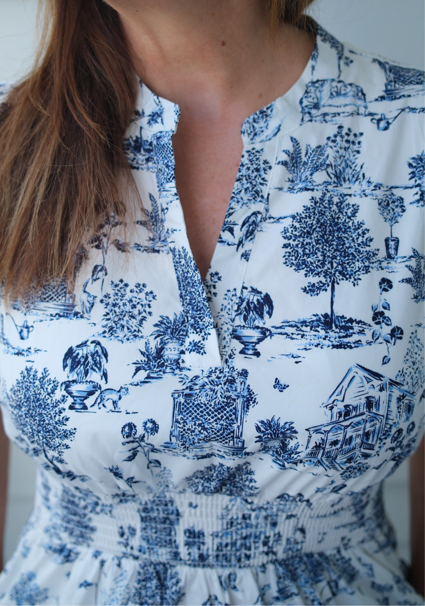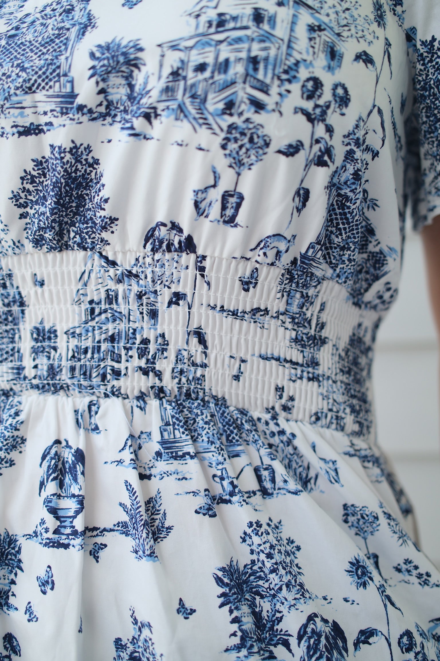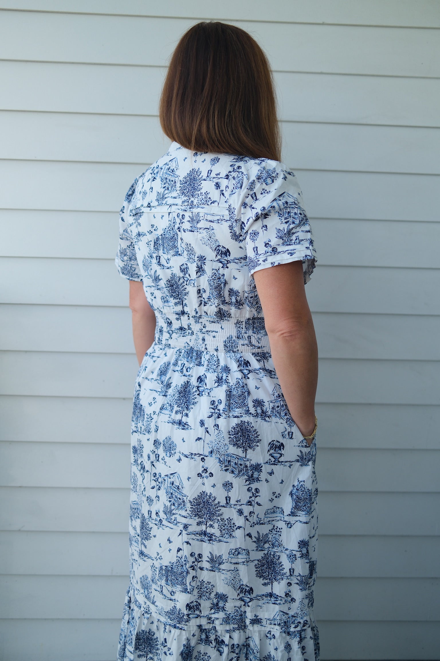 The playful toile pattern of blue and white, cinched at the waist, adds a touch of charm to any occasion. A dress that's both elegant and fun to wear (and just might make you crave some blueberries) 🫐