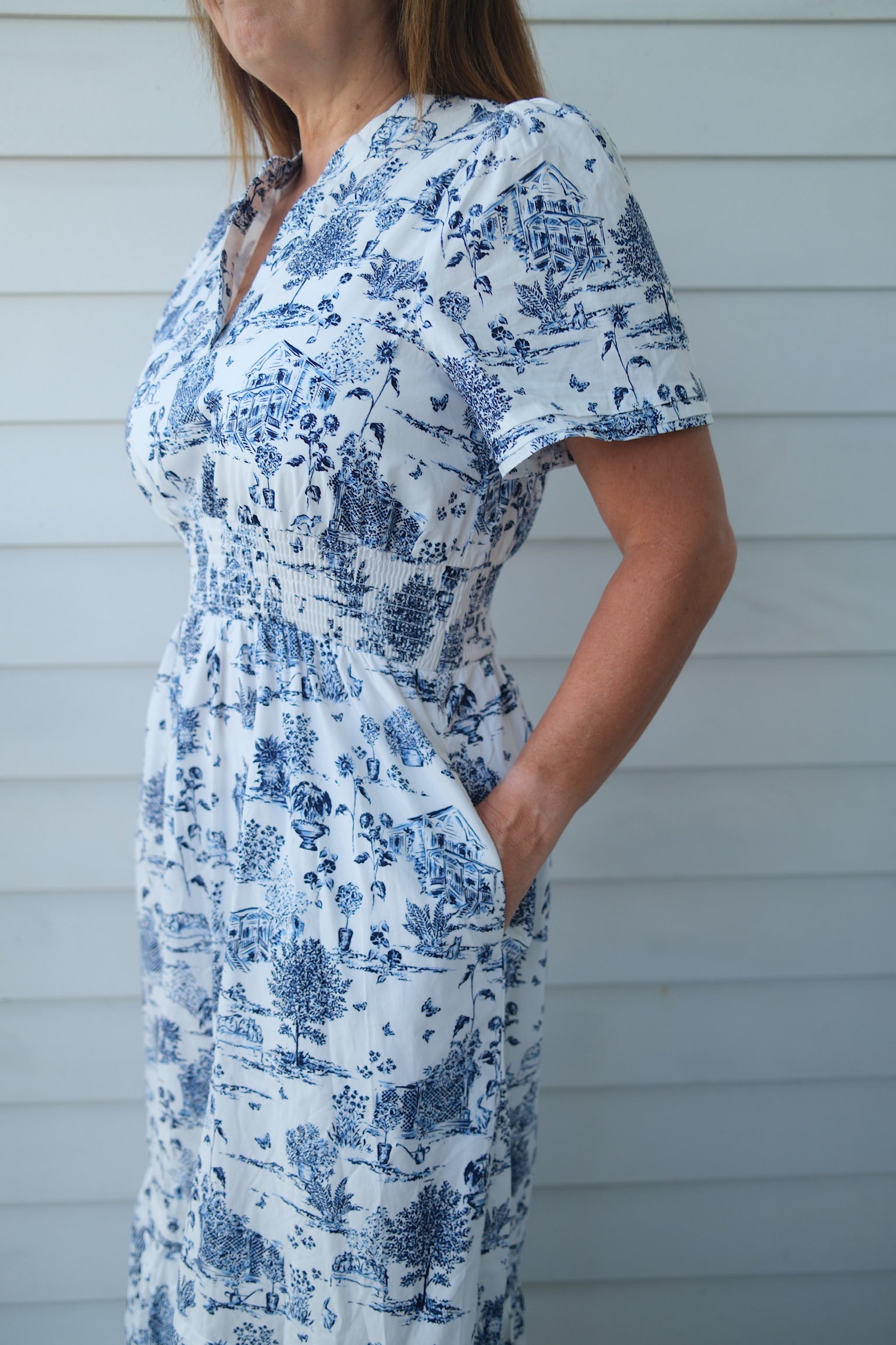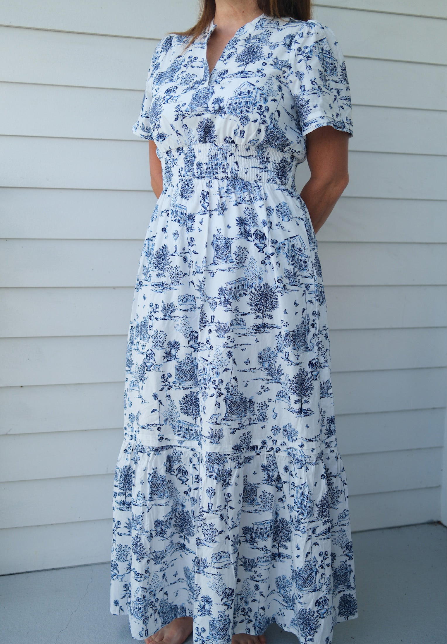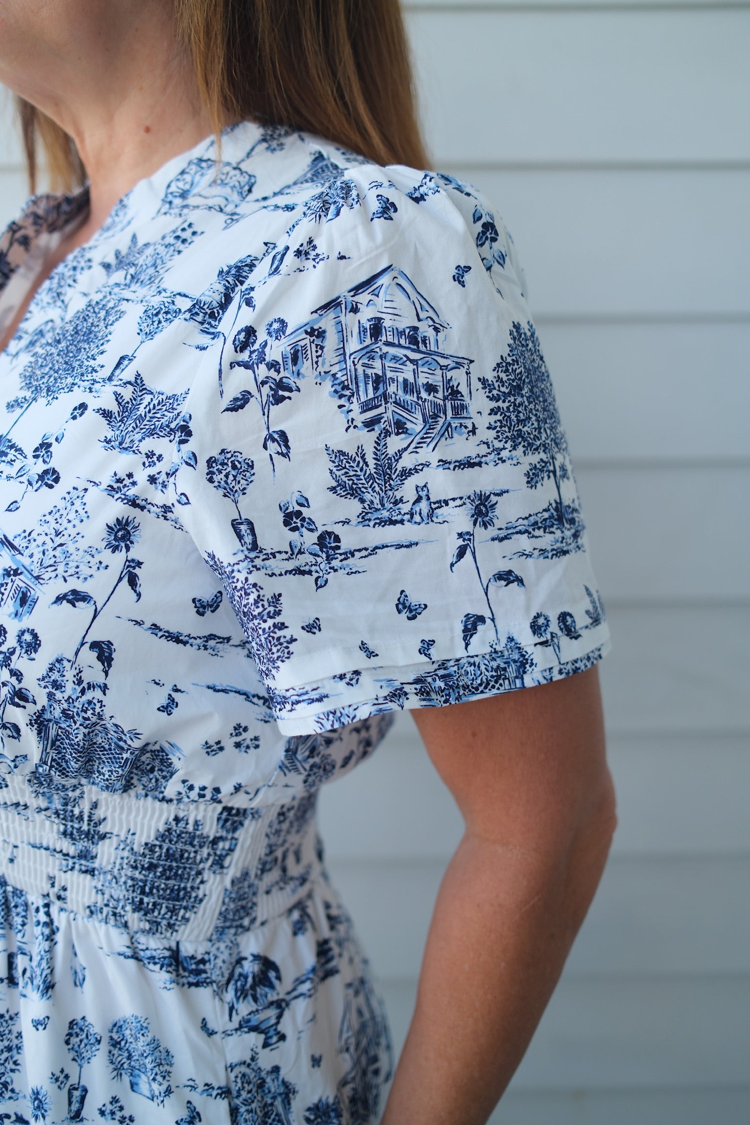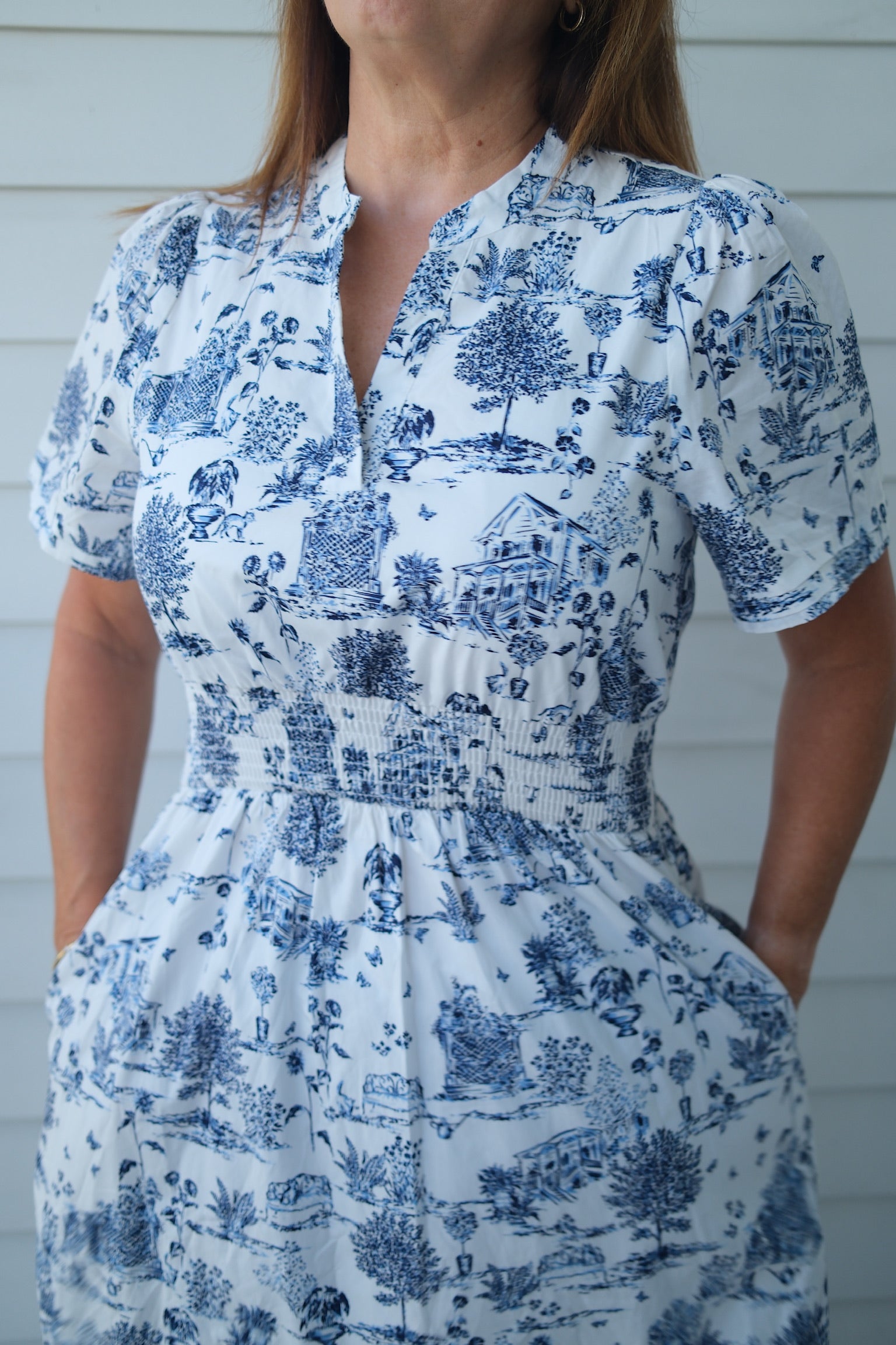 The playful toile pattern of blue and white, cinched at the waist, adds a touch of charm to any occasion. A dress that's both elegant and fun to wear (and just might make you crave some blueberries) 🫐