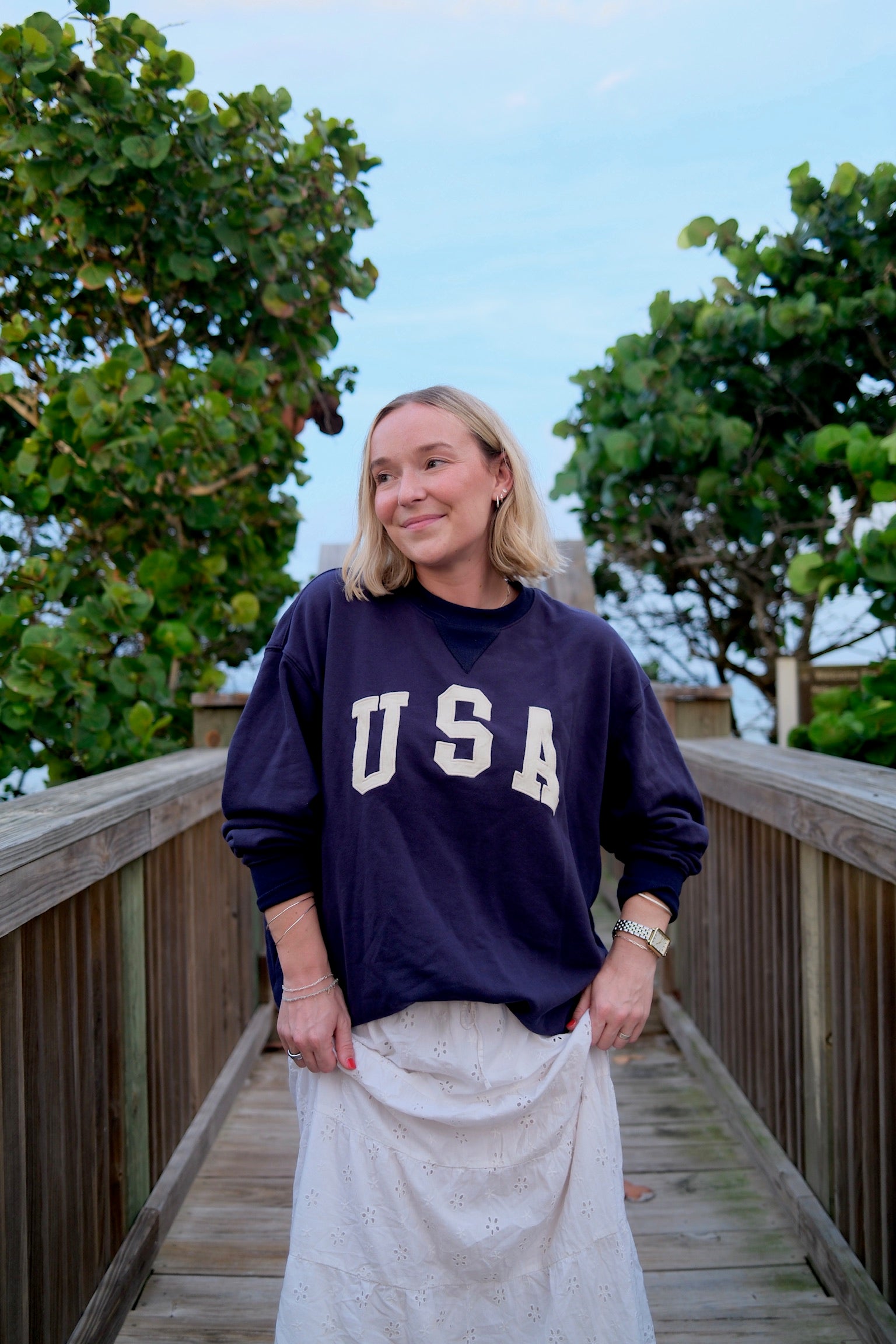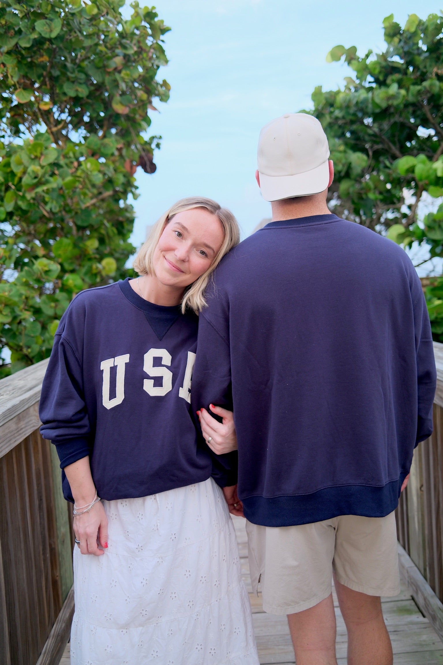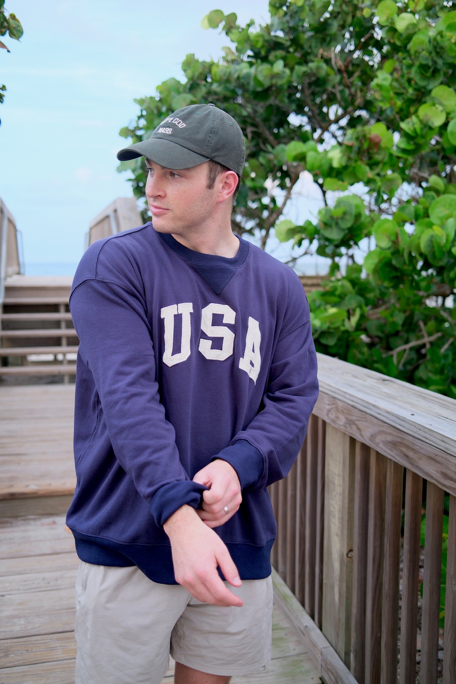 This unisex oversized crew neck sweatshirt is crafted from 100% French terry cotton, offering exceptional softness and durability. Its deep navy blue color is complemented by a tasteful "USA" embroidery, adding a subtle patriotic touch. Very oversized, size down.