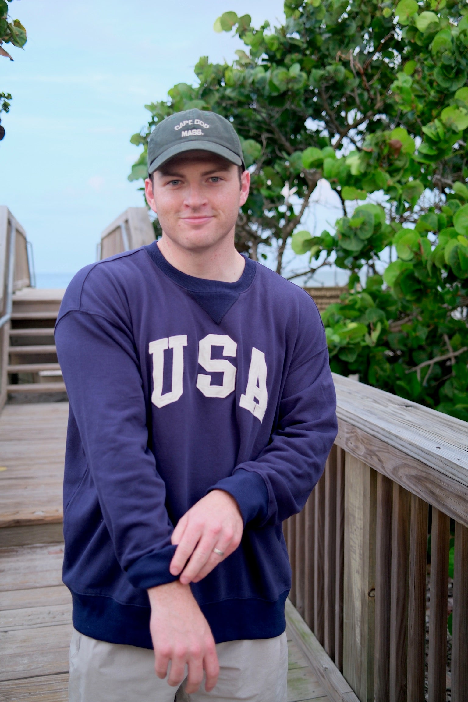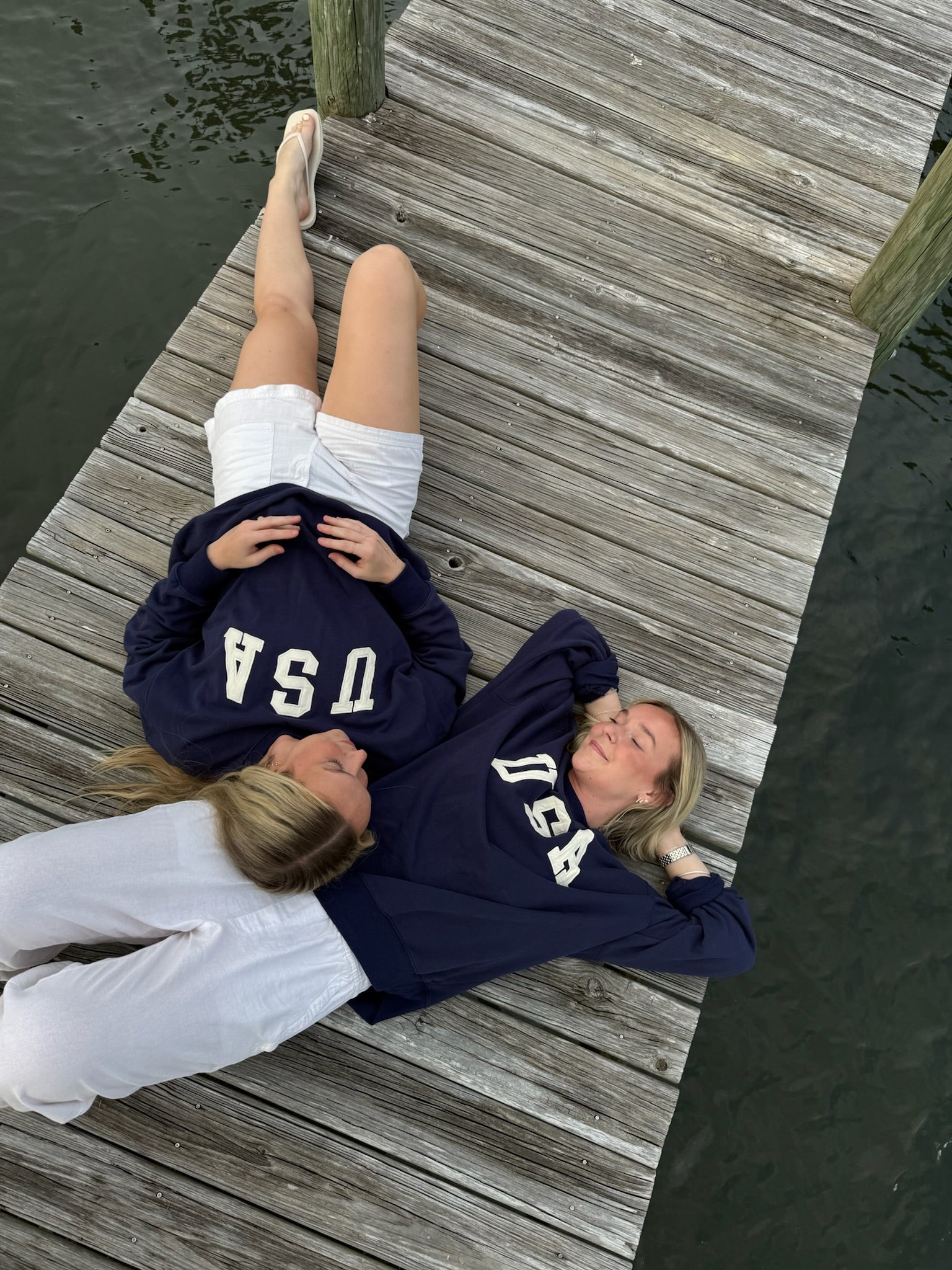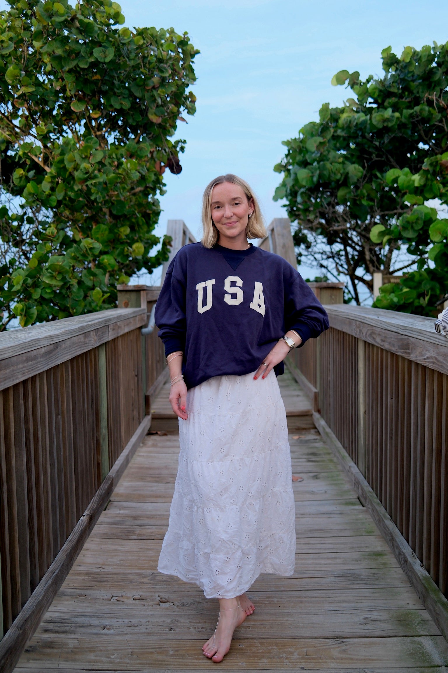 This unisex oversized crew neck sweatshirt is crafted from 100% French terry cotton, offering exceptional softness and durability. Its deep navy blue color is complemented by a tasteful "USA" embroidery, adding a subtle patriotic touch. Very oversized, size down.